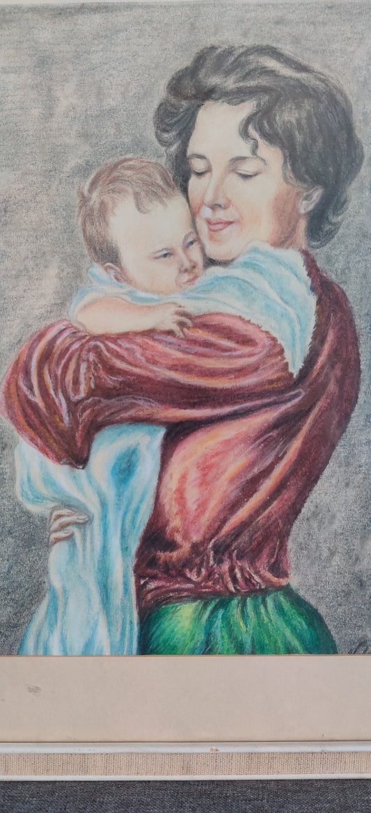 Äiti ja Lapsi Aiheinen Signeerattu Pastellityö