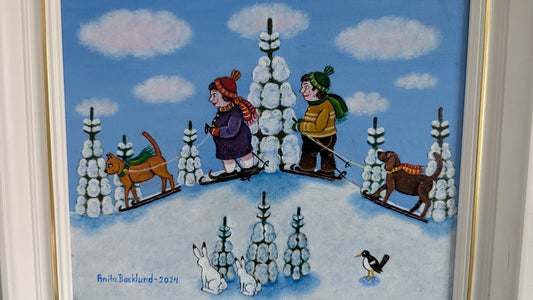 Anita Backlund - Perhe Hiihtoretkellä (Signeerattu Öljyvärimaalaus 2024)