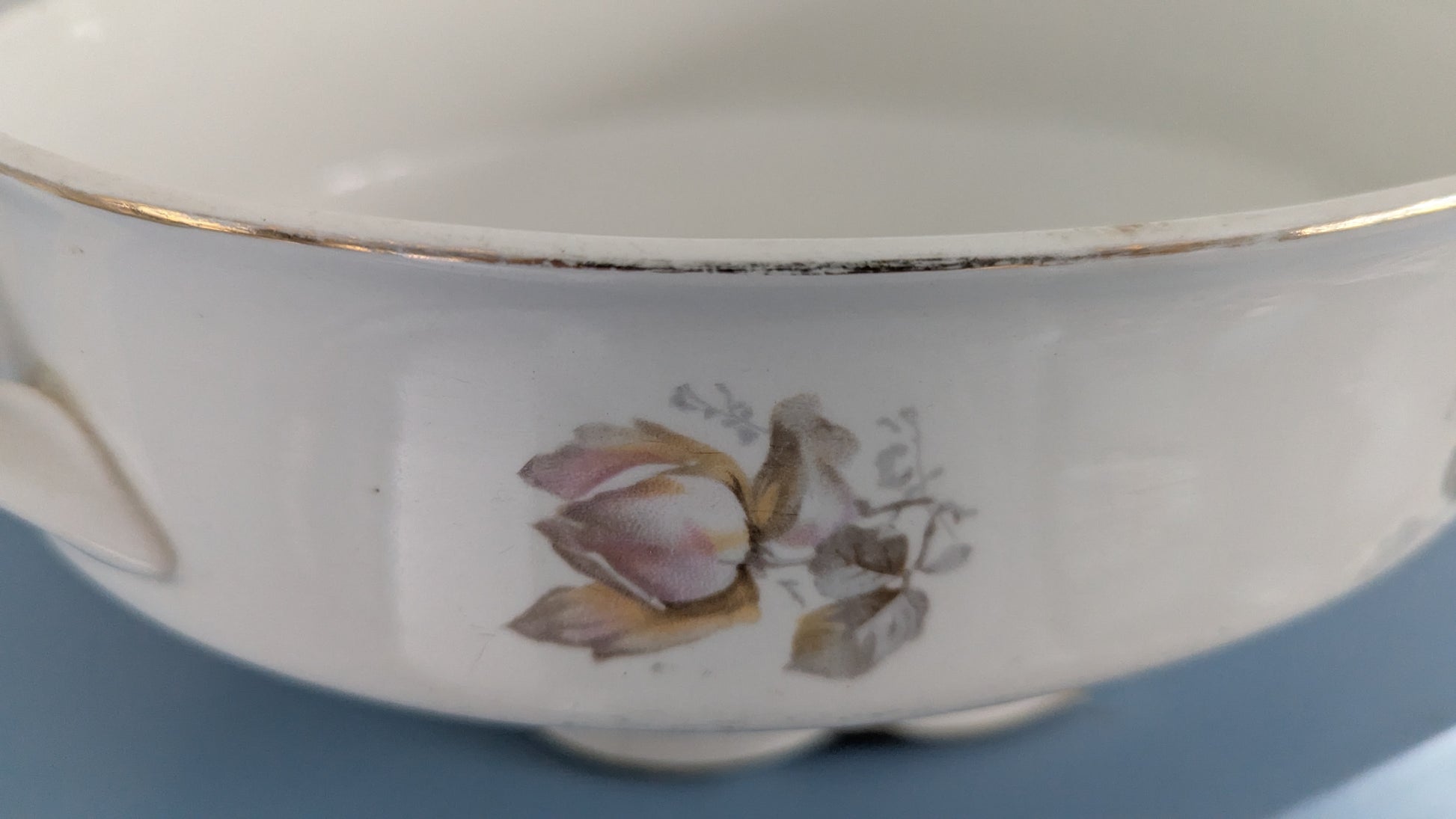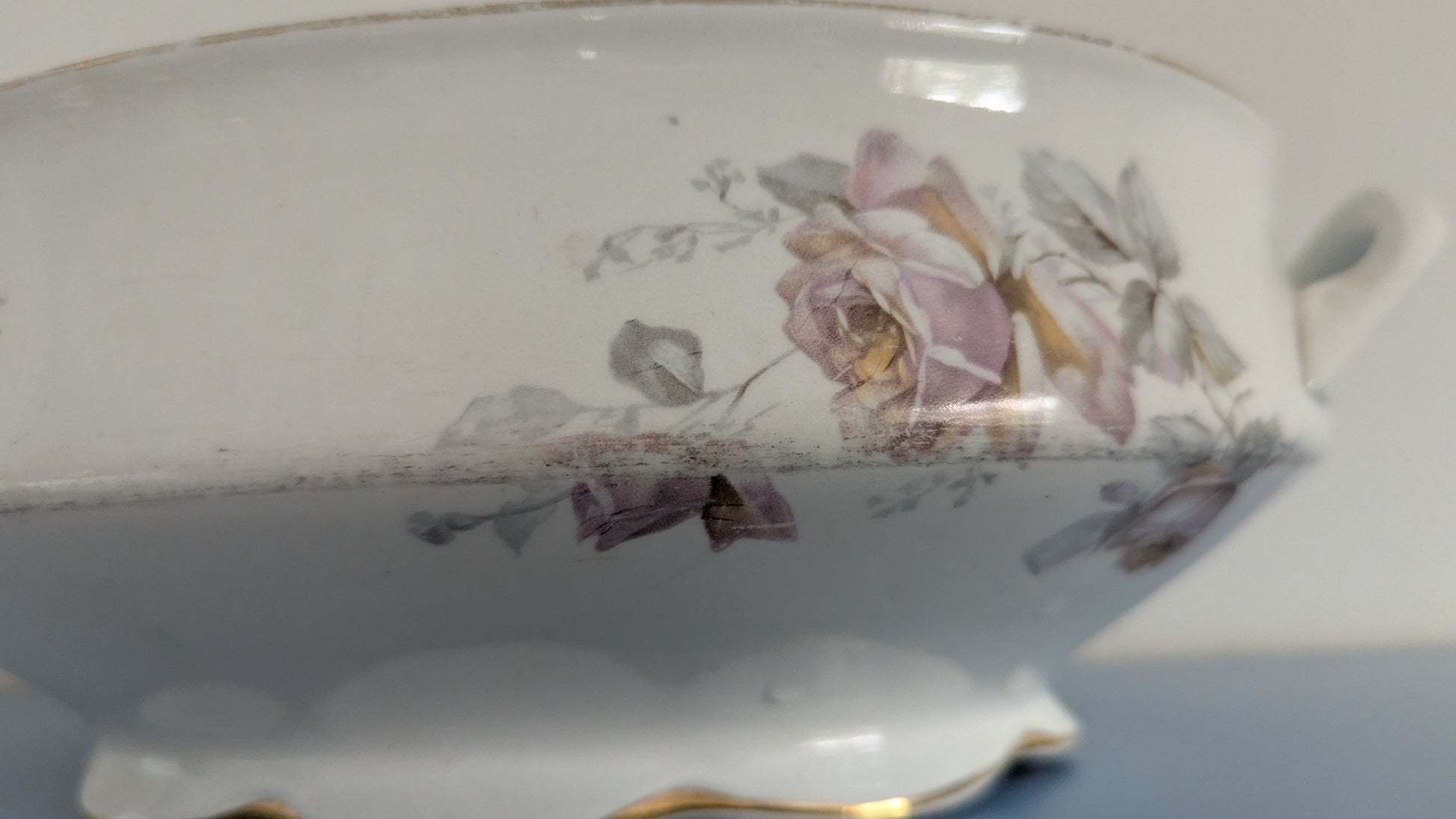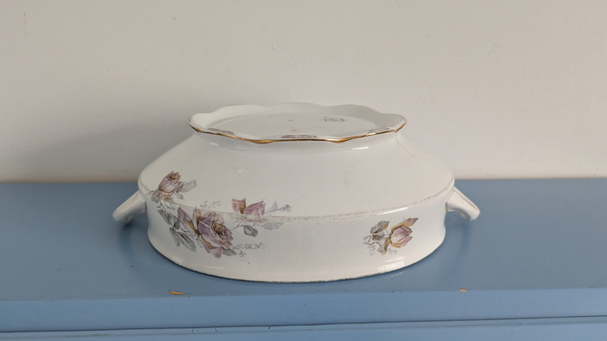 Pohjassa piippuleima. Ei iskemiä tai halkeamia. Käyttökulumaa löytyy sekä astiasta että koristeesta. Kansi puuttuu.