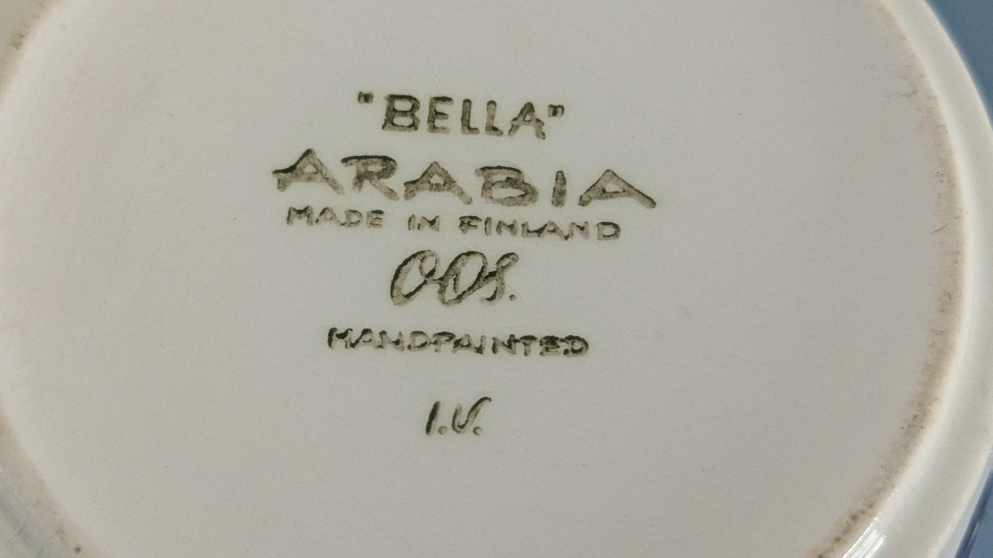 Käsinmaalattu. Pohjassa signeeraus OOS eli olisiko Olga Osolin suunnittelemat. Lisäksi maalaajan signeeraus ja sarjan nimi eli Bella. Tämän enempää sarjasta ei tietoa löydykään.