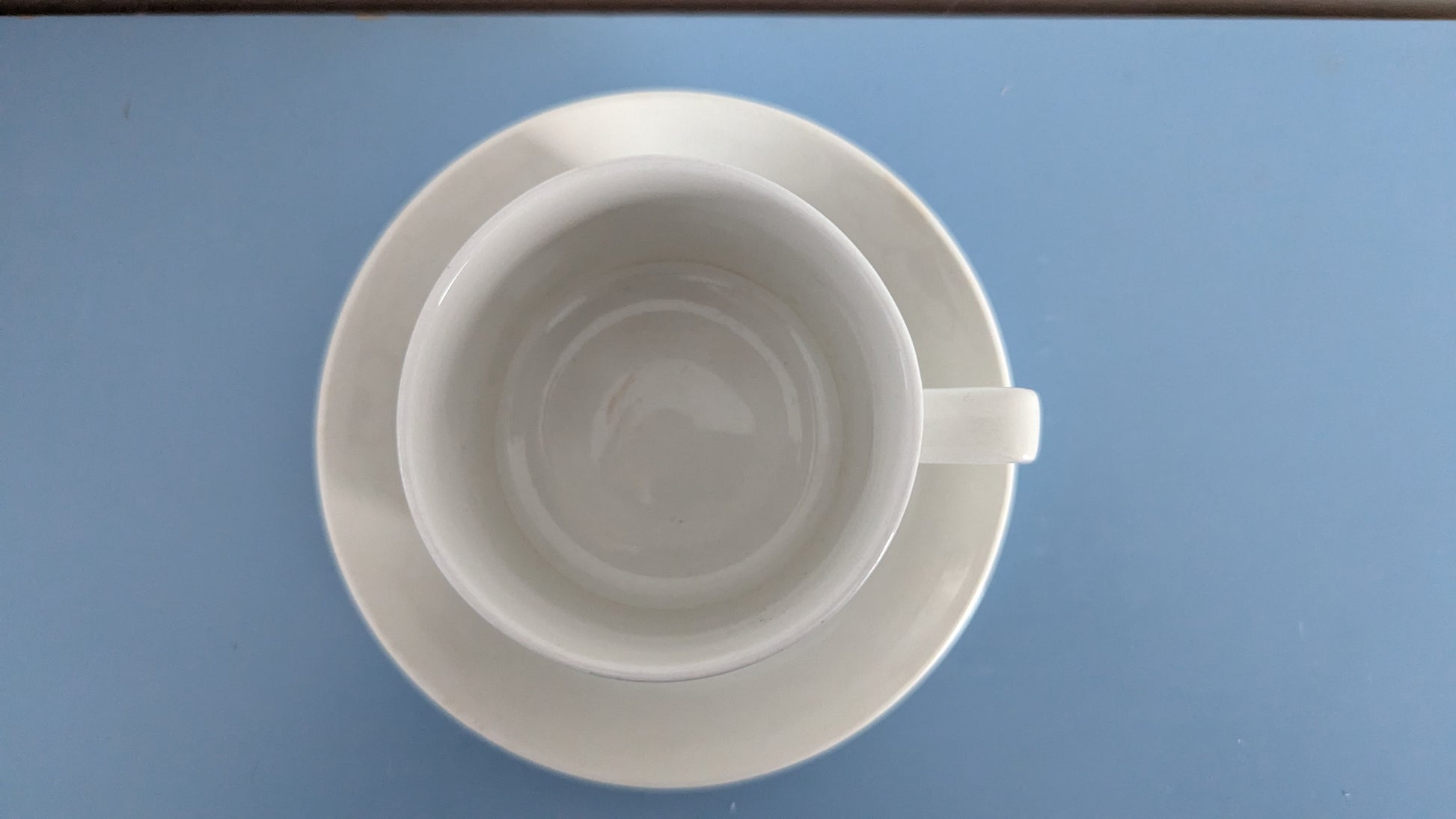 Ei iskemiä tai halkeamia. Lautasista leimat kuluneet pois. Yhden kupin koristeessa viimeisen kuvan mukaista kulumaa. Muissa vähäistä käyttökulumaa.