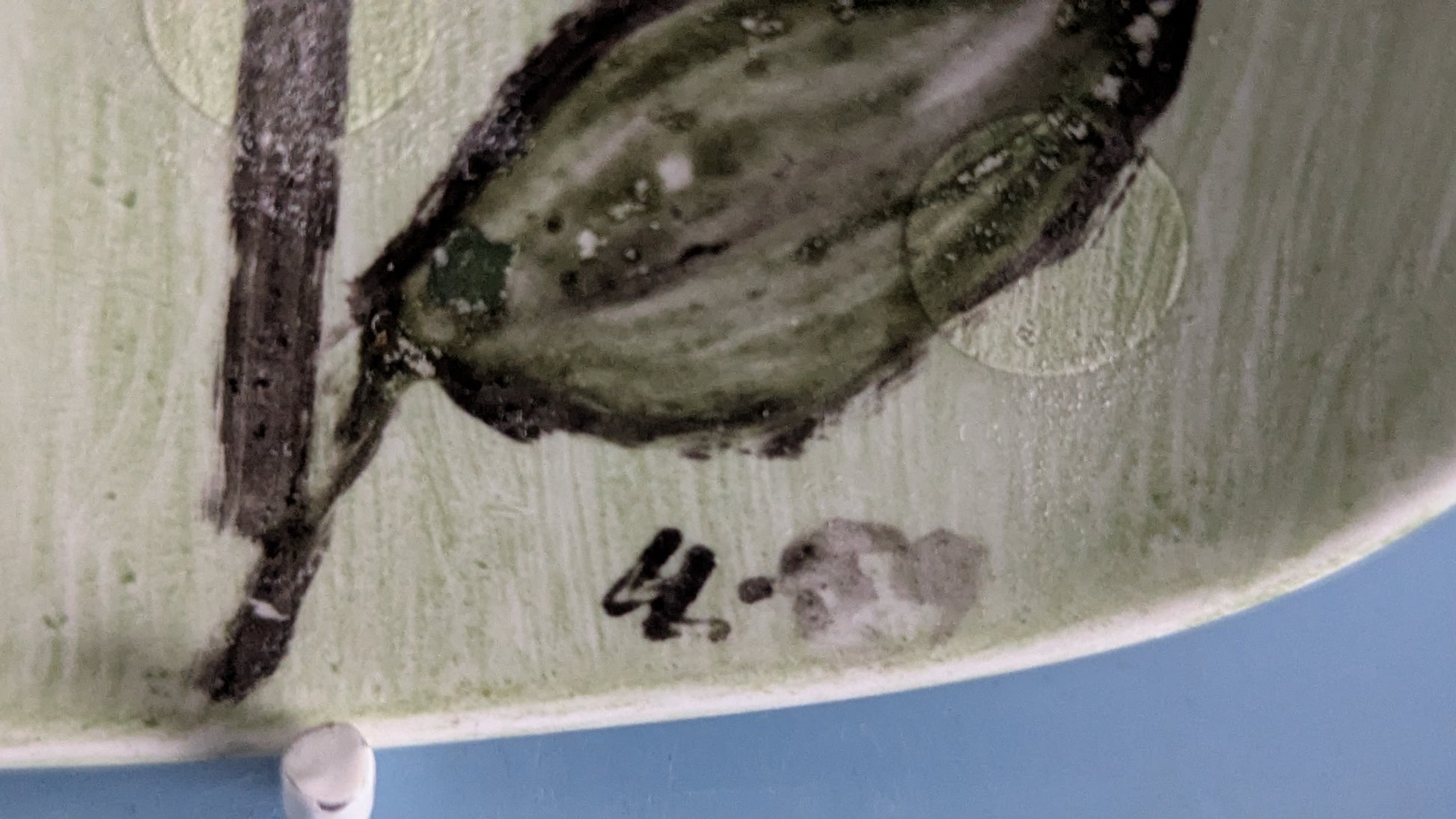 Kyseessä Arabian AL mallin valkoinen tarjoilukulho, jonka päälle joku maalannut koristeen vuonna 1959. Alalaidassa signeeraus LL -59
