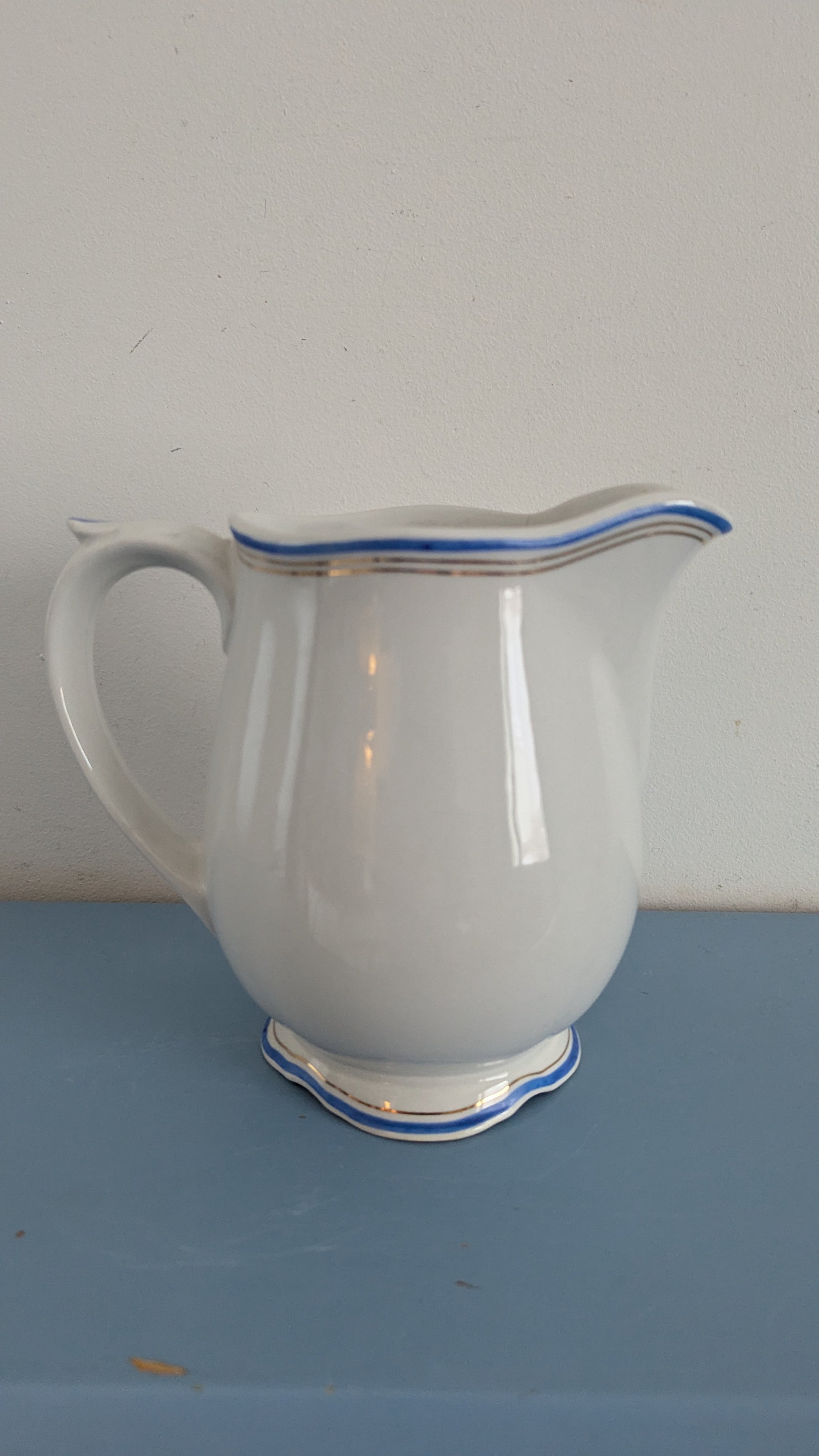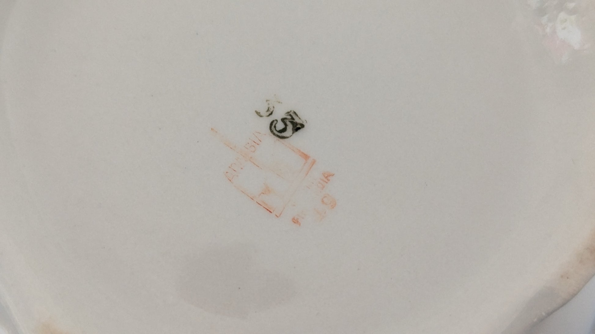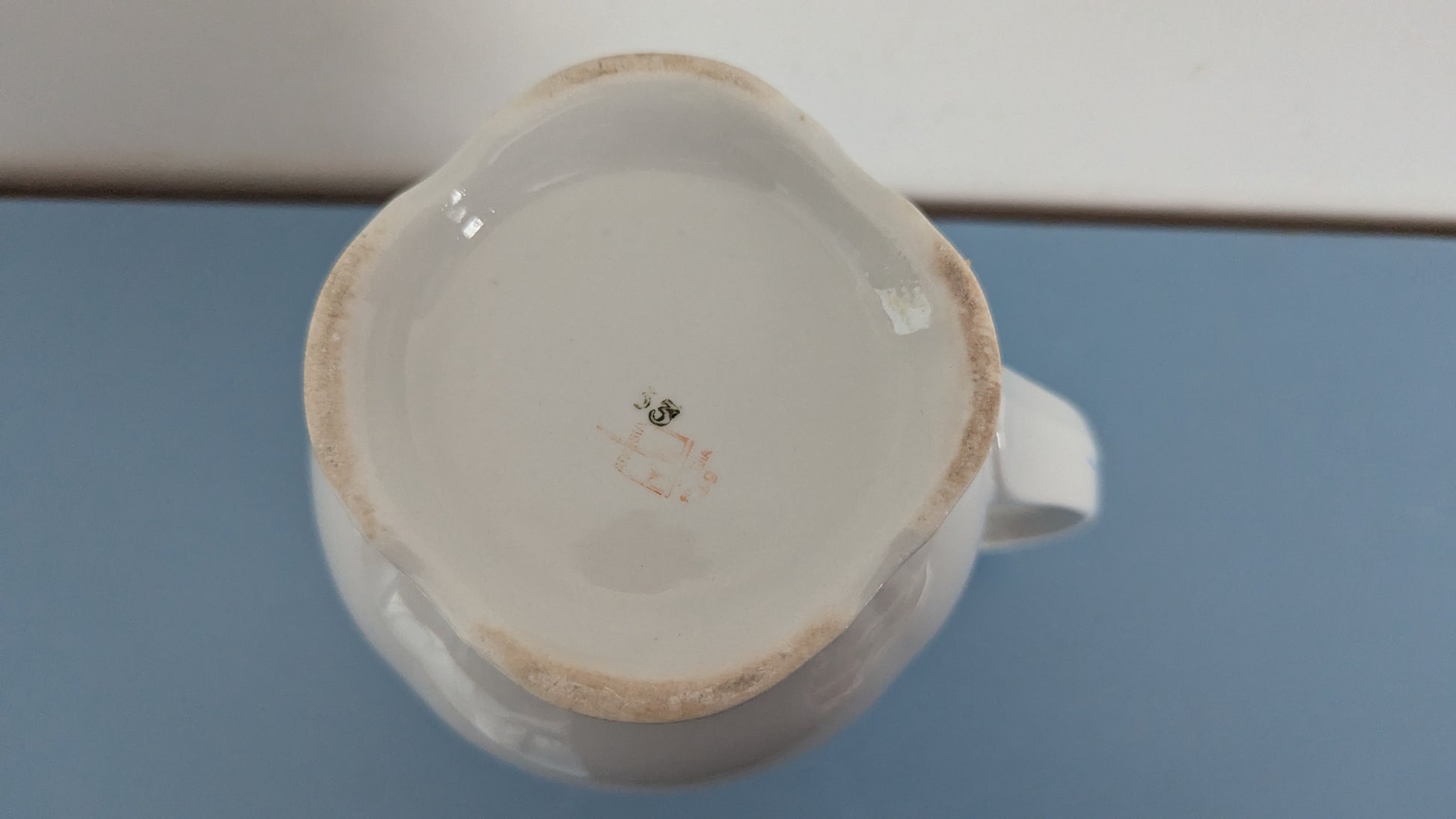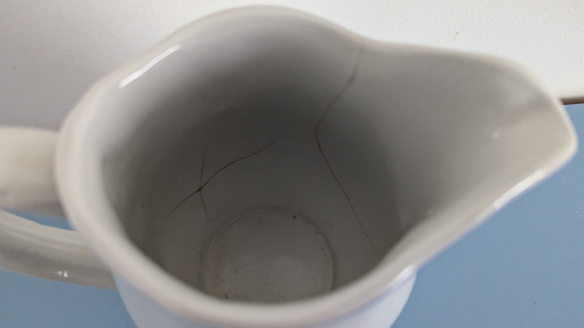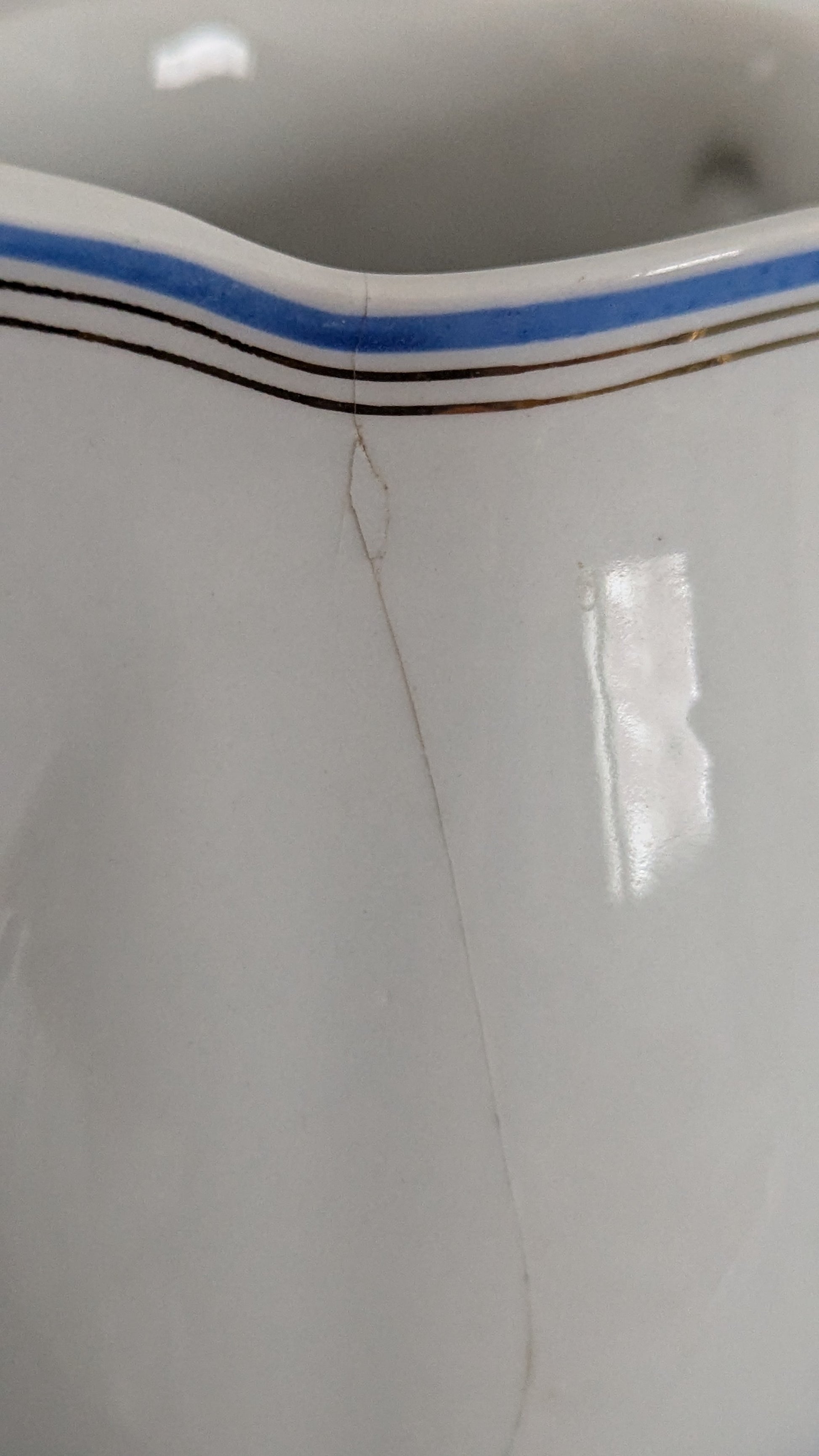 Ei iskemiä. Koriste erinomaisessa kunnossa. Kannun toisella puolen pitkä halkeama ja lisäksi toinen X-kirjaimen muotoinen halkeama, joka näkyy paremmin sisäpuolelta.