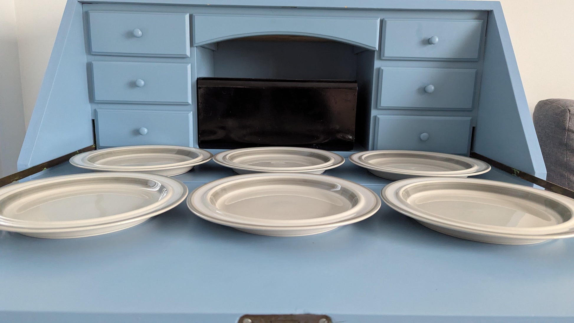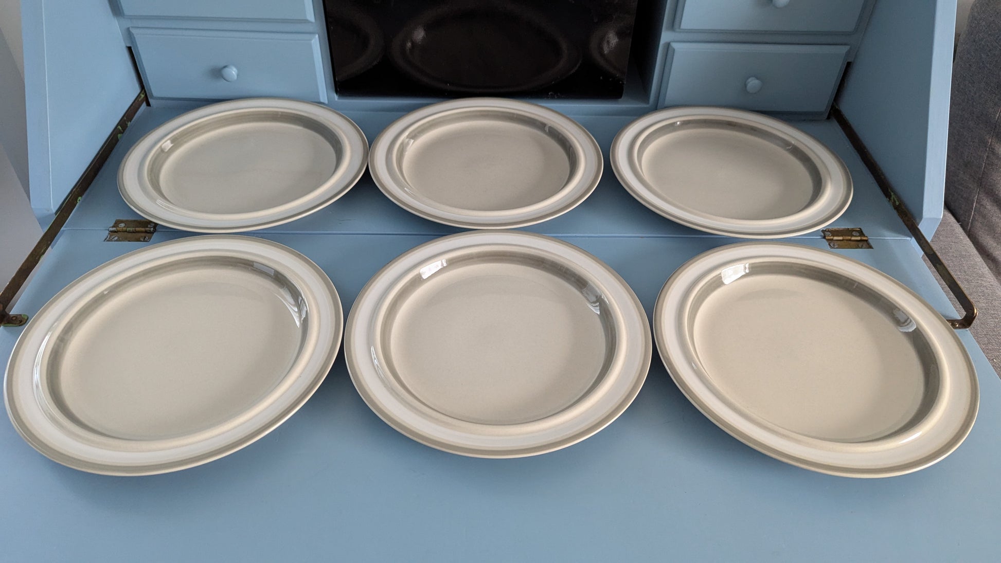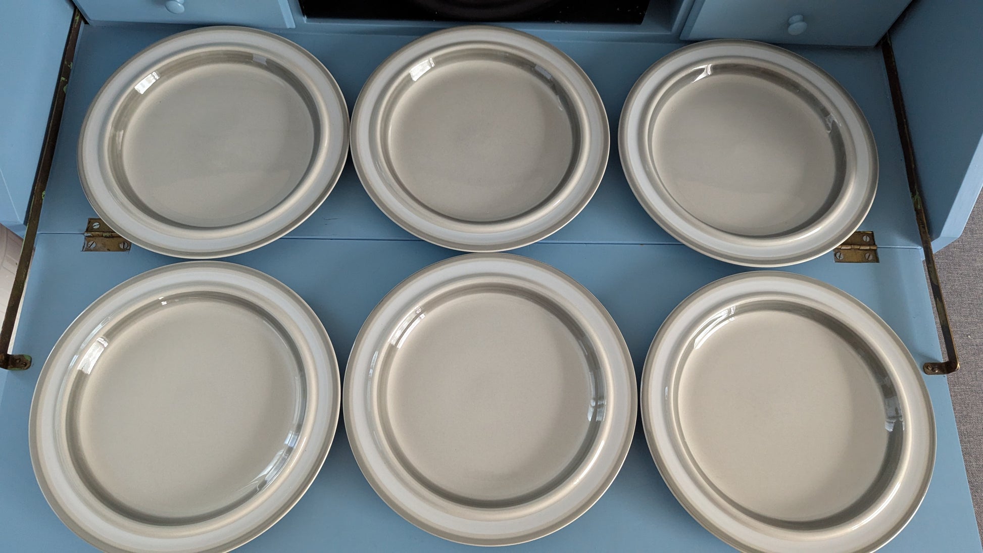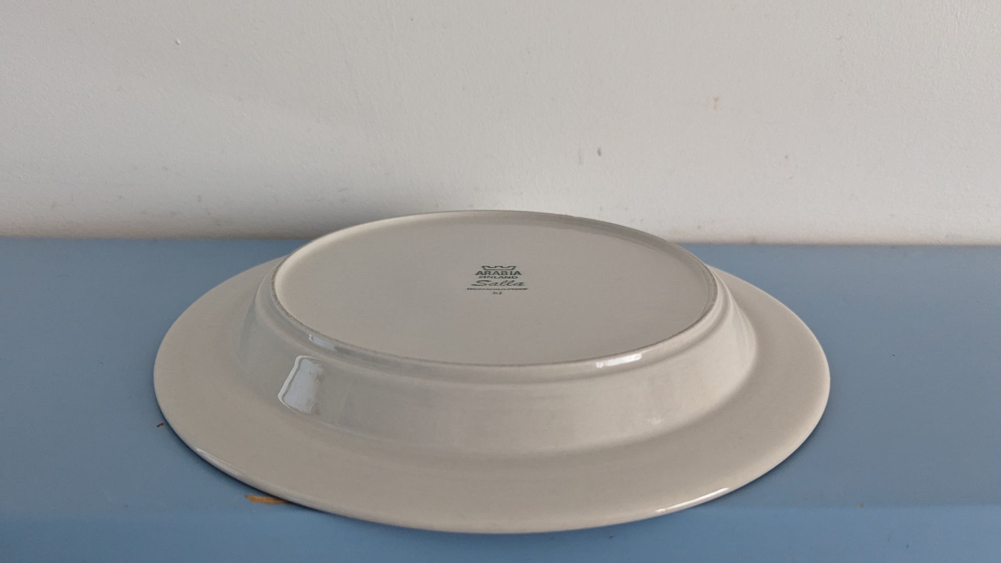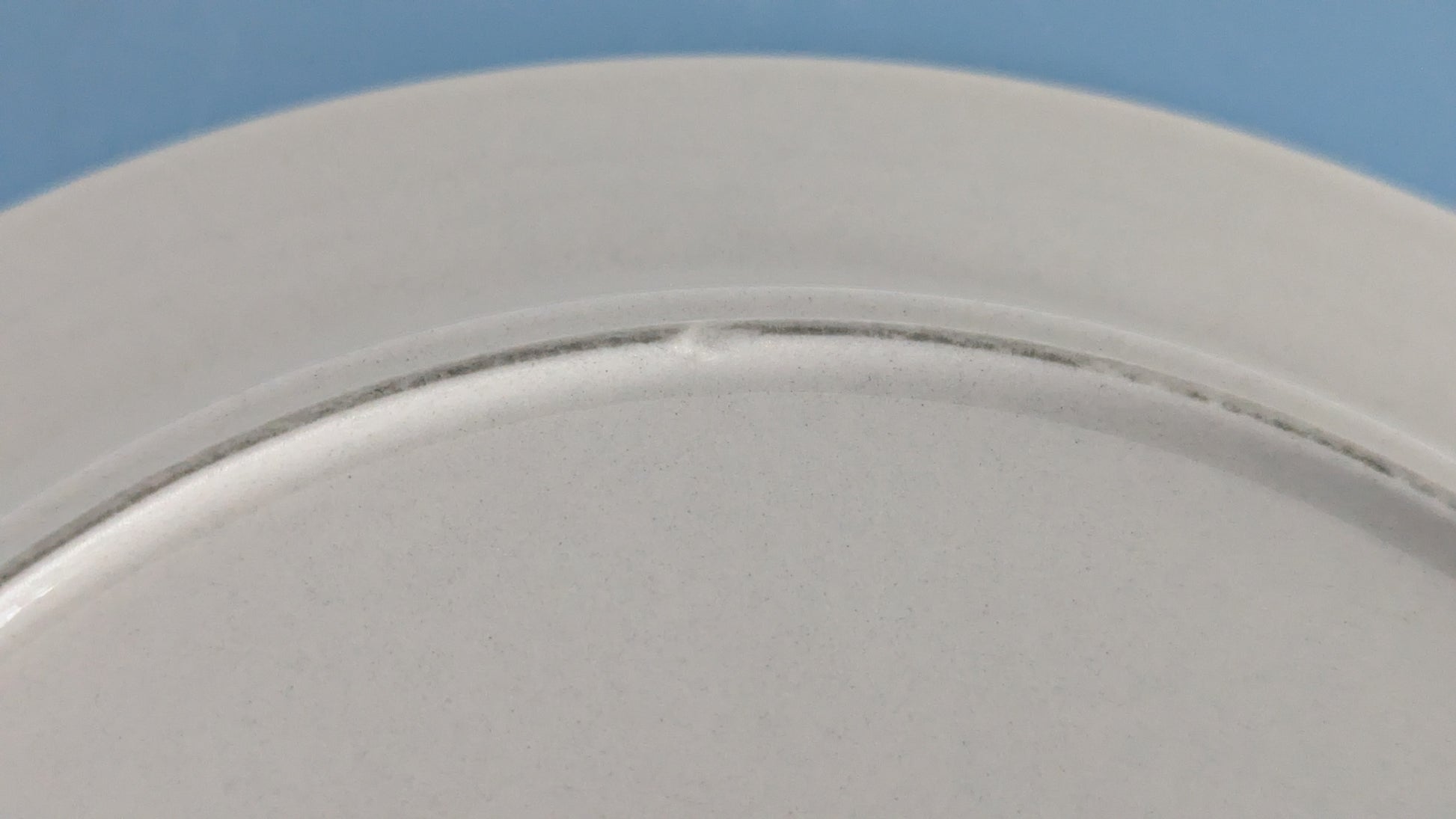 Ei halkeamia. Parin lautasen pohjaympyrässä 2mm iskemä, mikä näkyy viimeisessä kuvassa. Ei näy tuolta mihinkään kun lautanen pöydällä. Muuten ei iskemiä. Käyttökulumaa osassa vähemmän ja osassa enemmän.