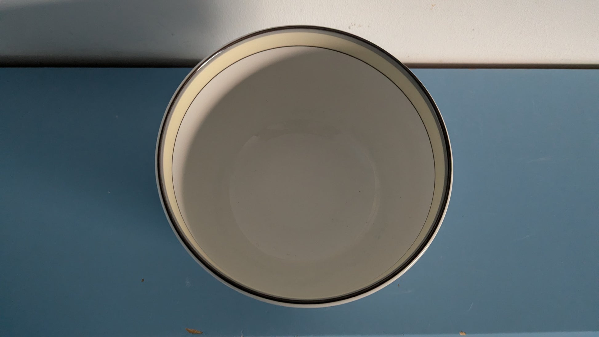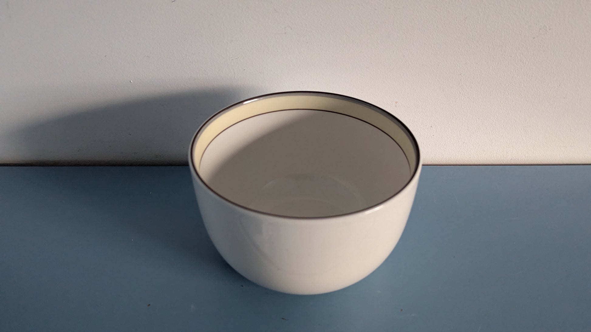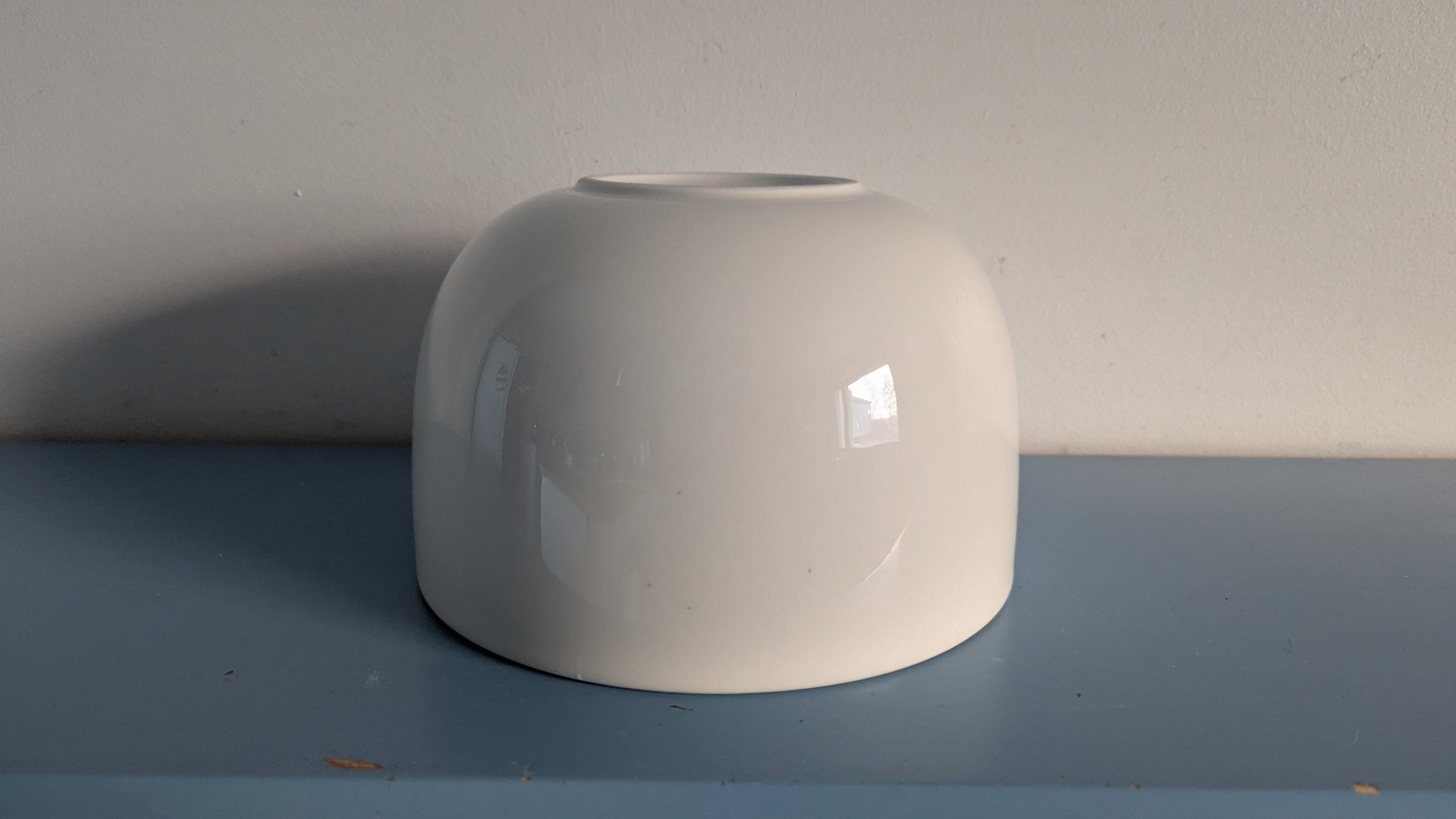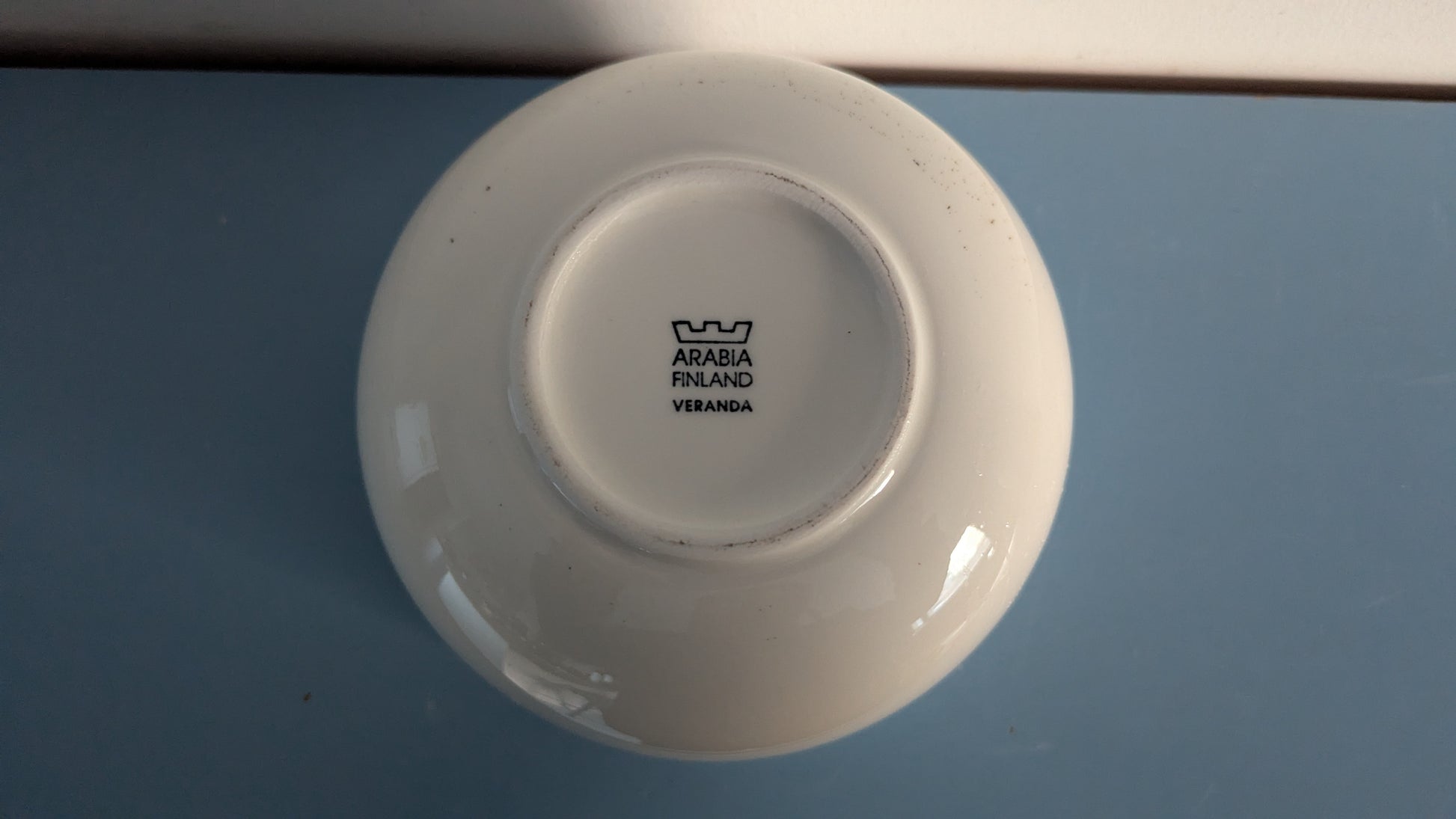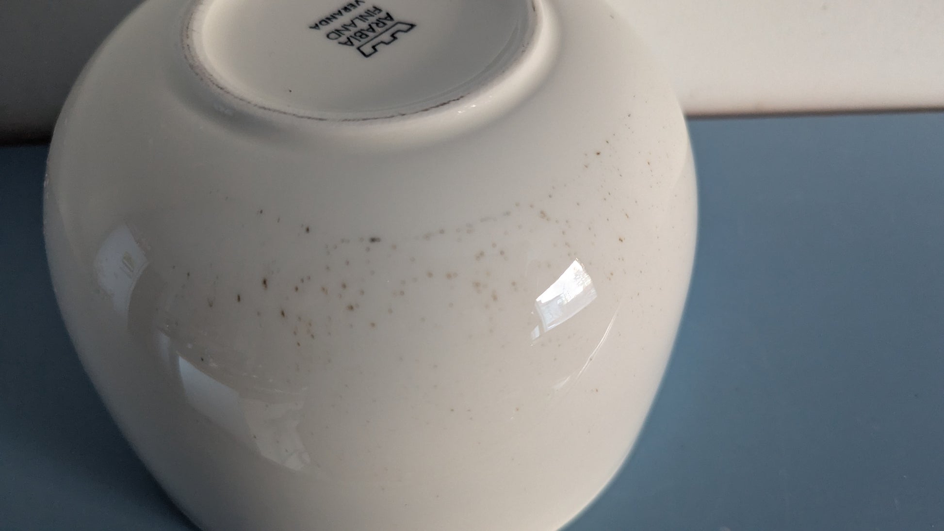 Ei iskemiä, halkeamia tai naarmuja mutta kulhon toisella puolen harmaita / ruskeita pisteitä. Näyttäisi niin kuin olisi jäänyt lasitteen alle jo tekovaiheessa.