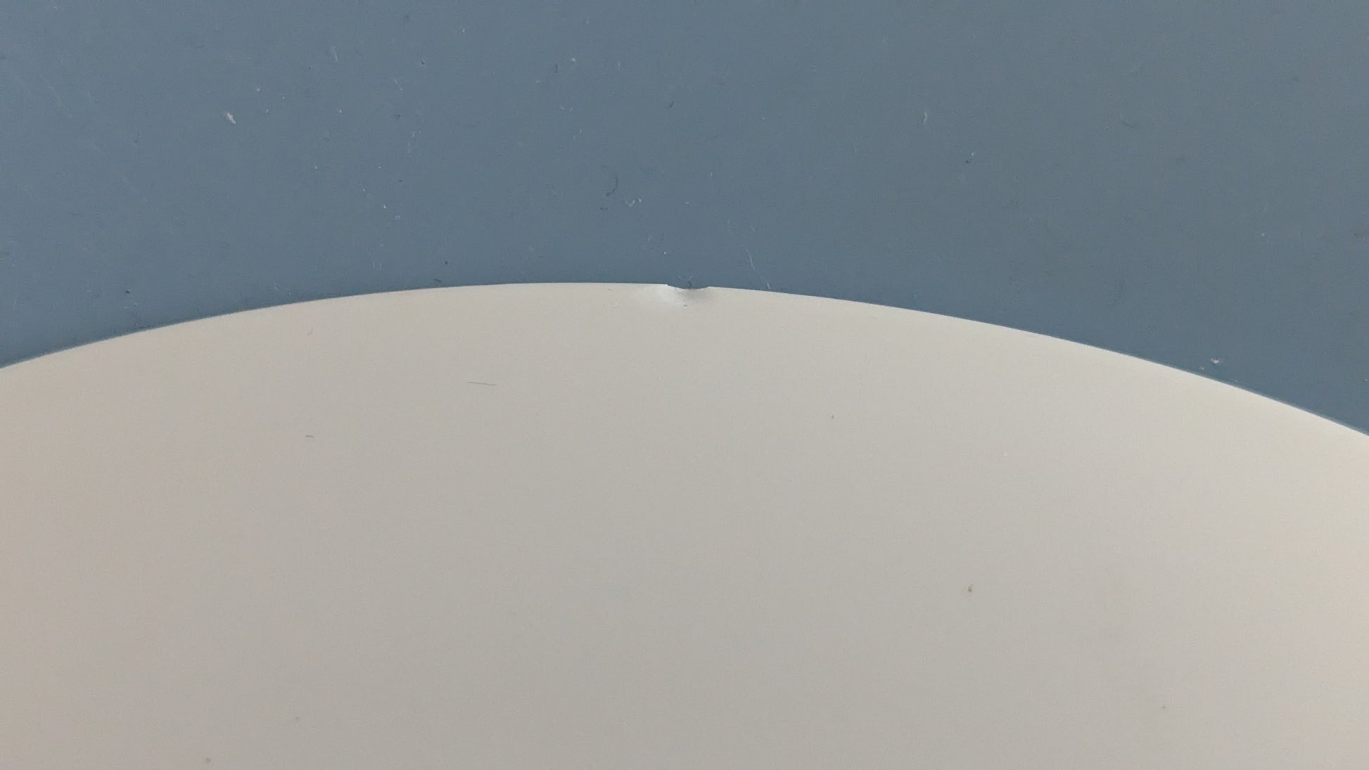 Ei halkeamia tai naarmuja. Takana viimeisen kuvan mukainen 3mm iskemä. Jää onneksi seinän puolelle eikä näy edestä käsin.