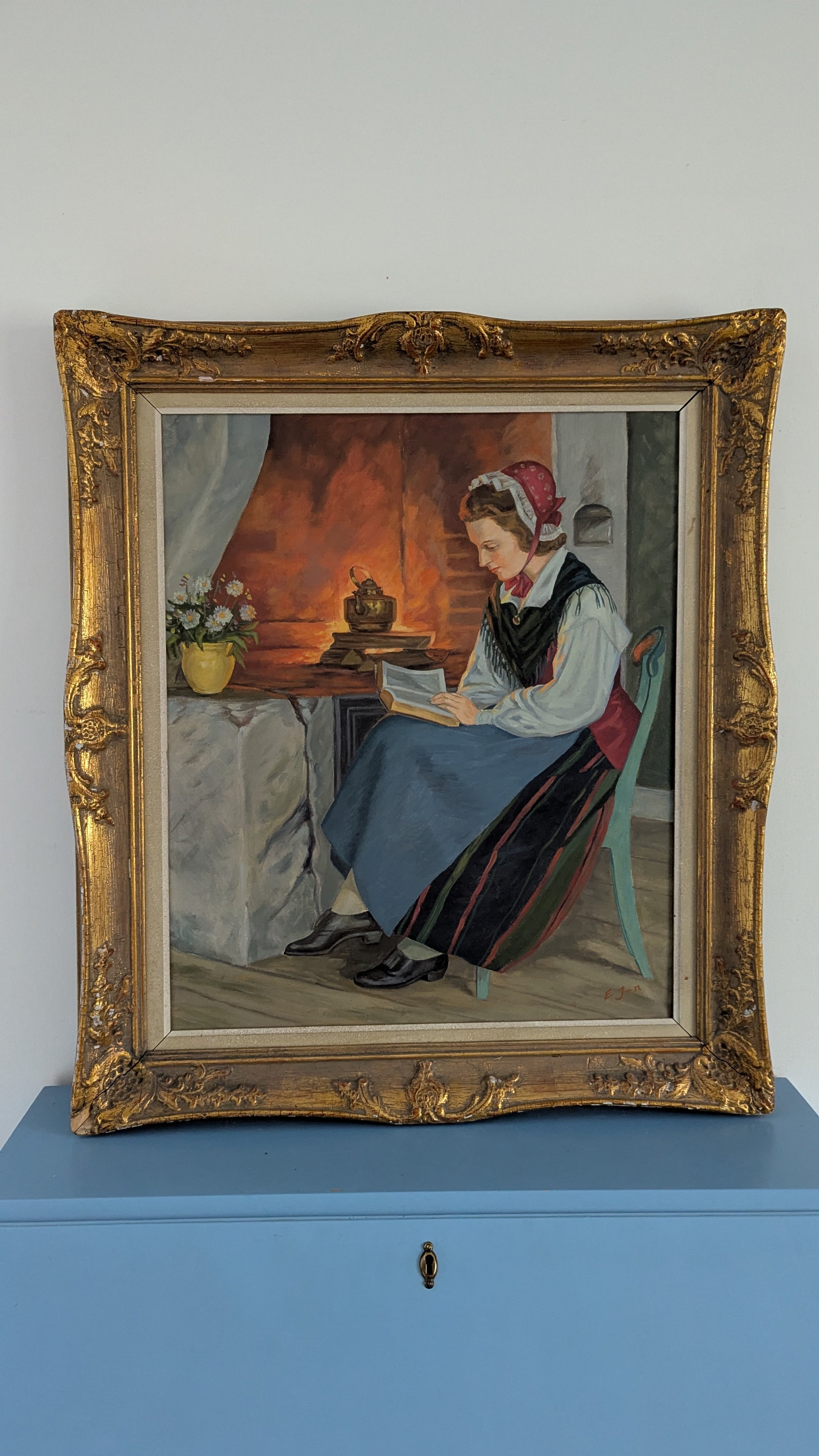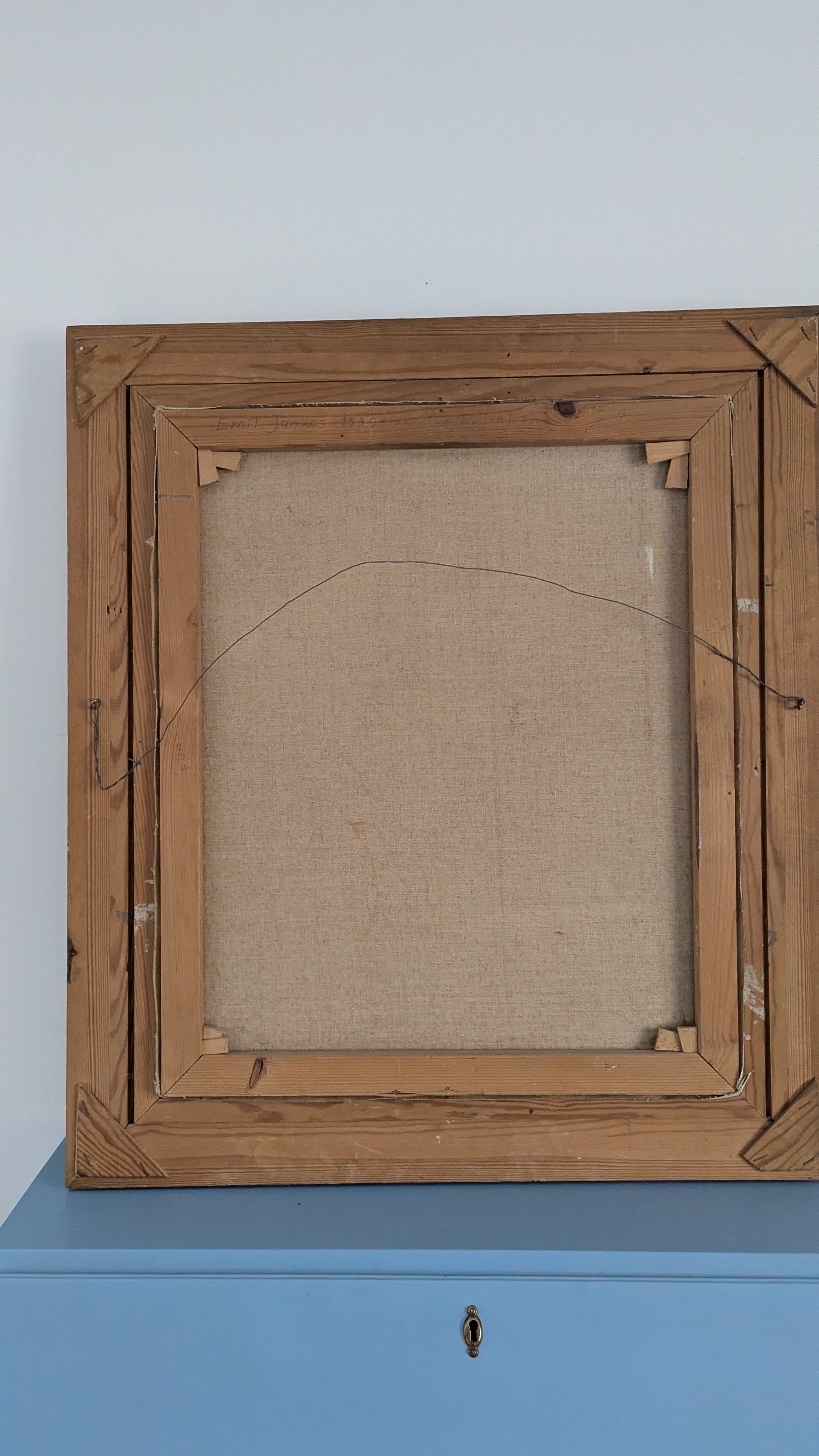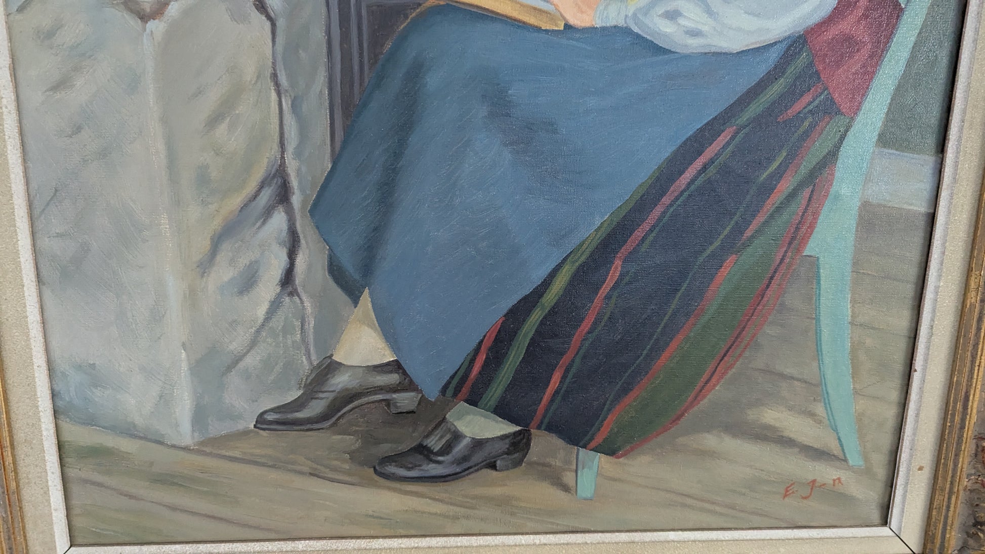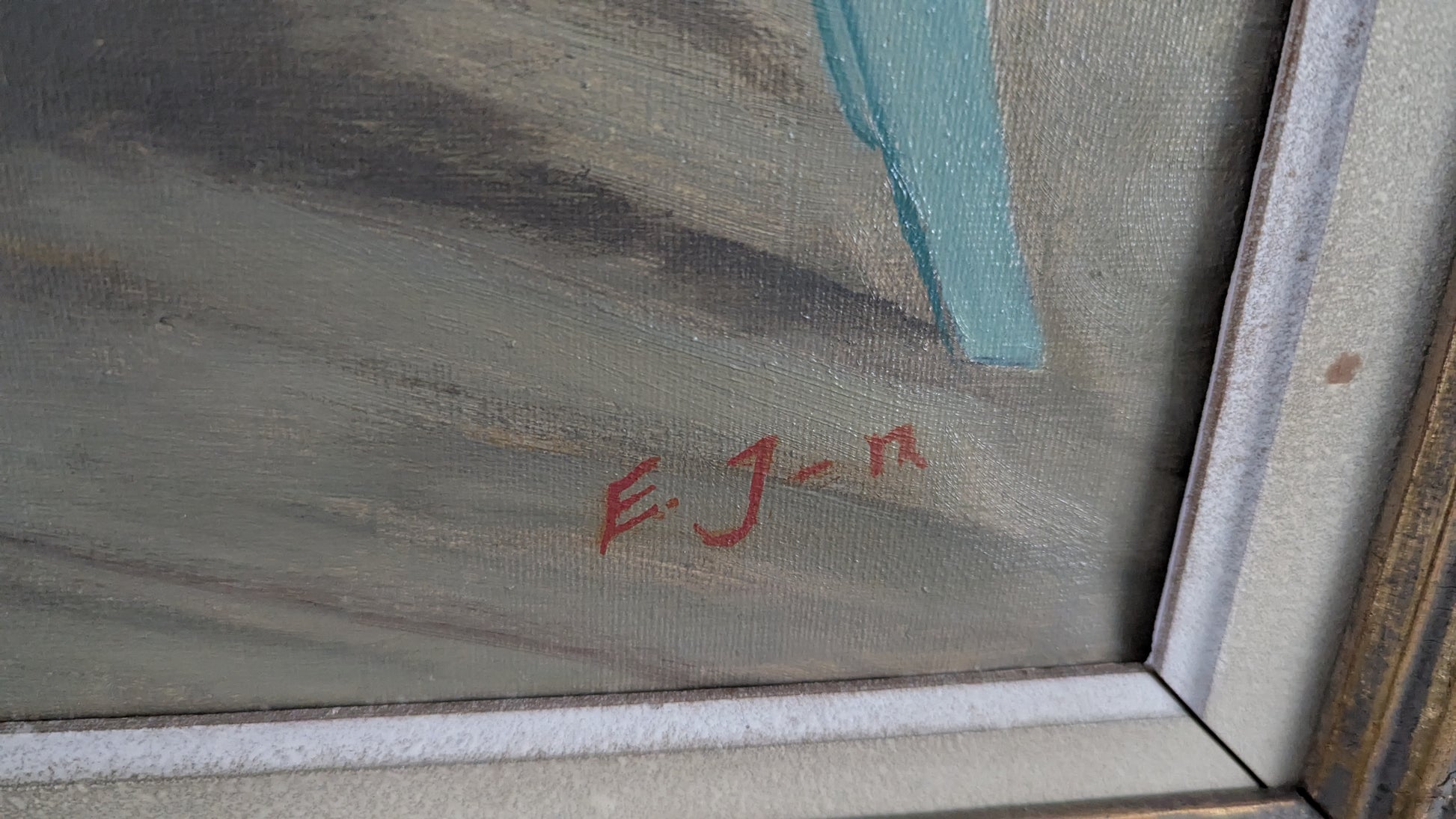 E.J-n signeerattu öljyvärityö kankaalle. Takana kehyksiin kirjoitettu Emil Jankes 1920-luku mutta tuo ei varmaan totta. Tuollaista signeerausta ei löydy Emil Jankesin töistä.