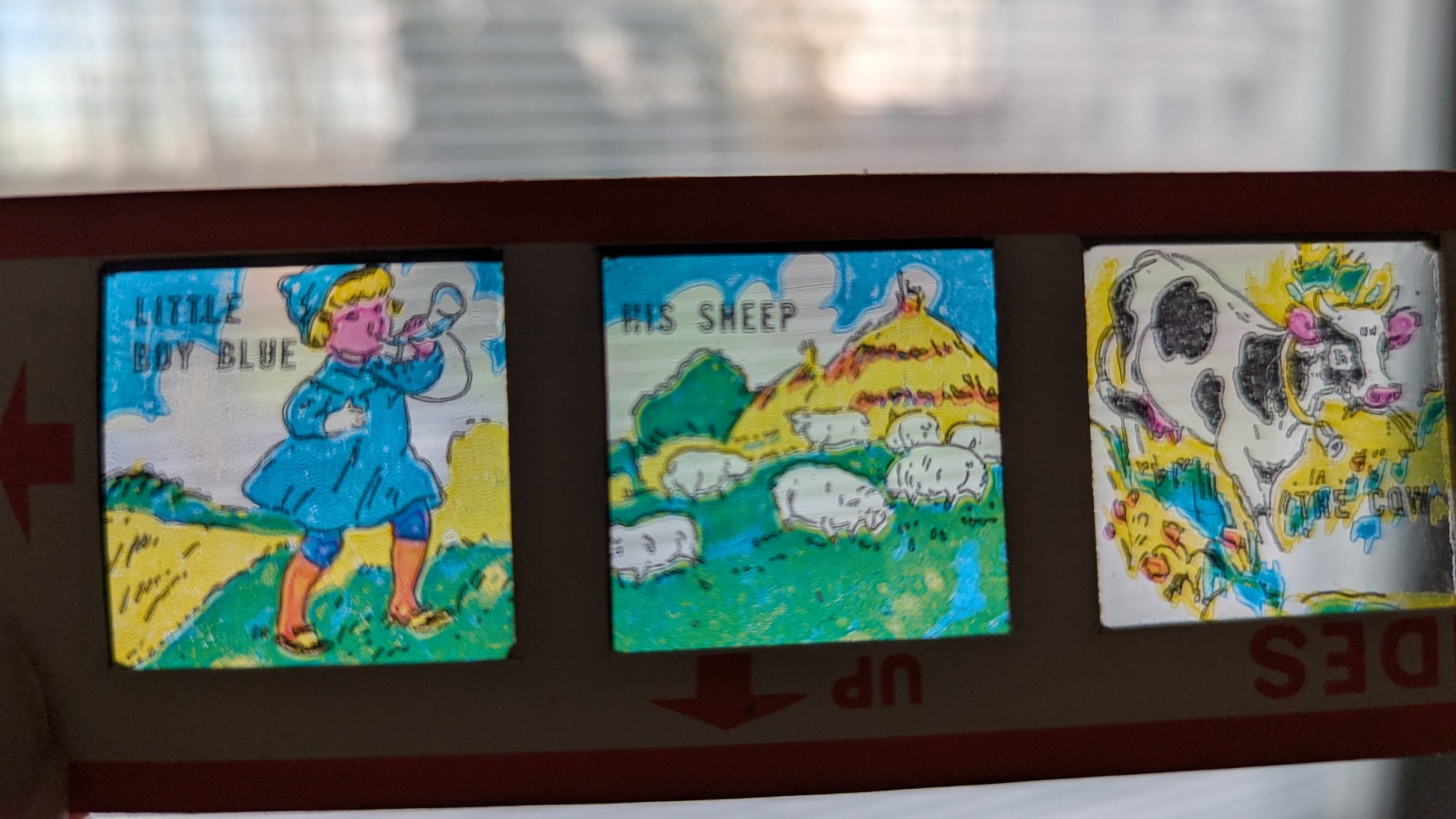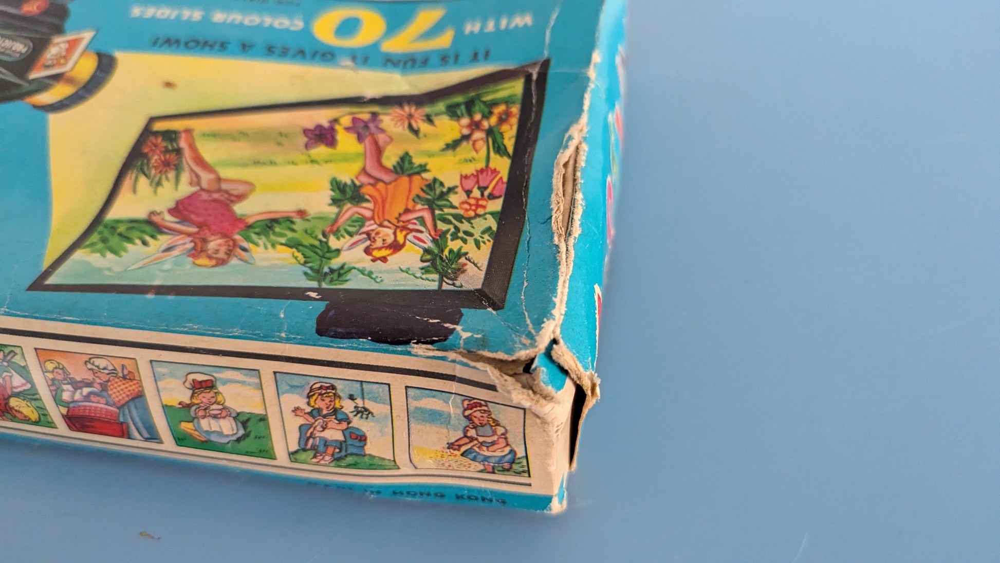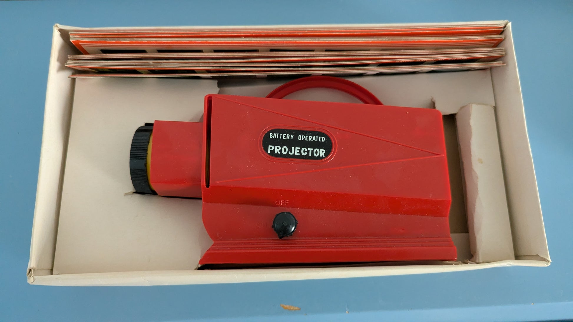 Alkuperäisessä paketissa oleva lasten muovinen projektori. Sisältää 10kpl levyjä, joissa jokaisessa seitsemän eri kuvaa eli kuvia yhteensä 70kpl.