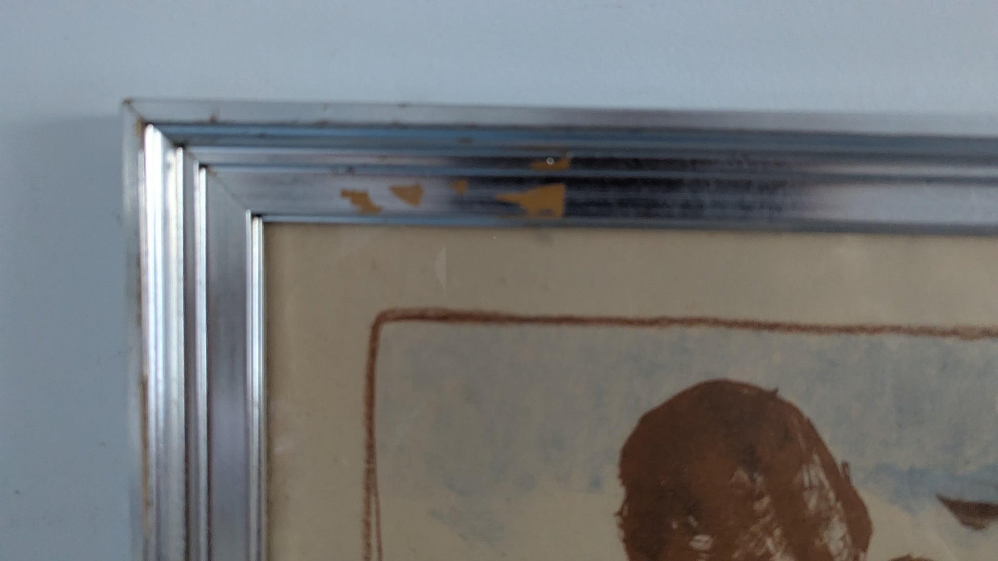 Kehyksissä lasi. Kehysten oikeasta yläkulmasta hopeamaali hieman lähtenyt pois. Näkyy viimeisessä kuvassa.