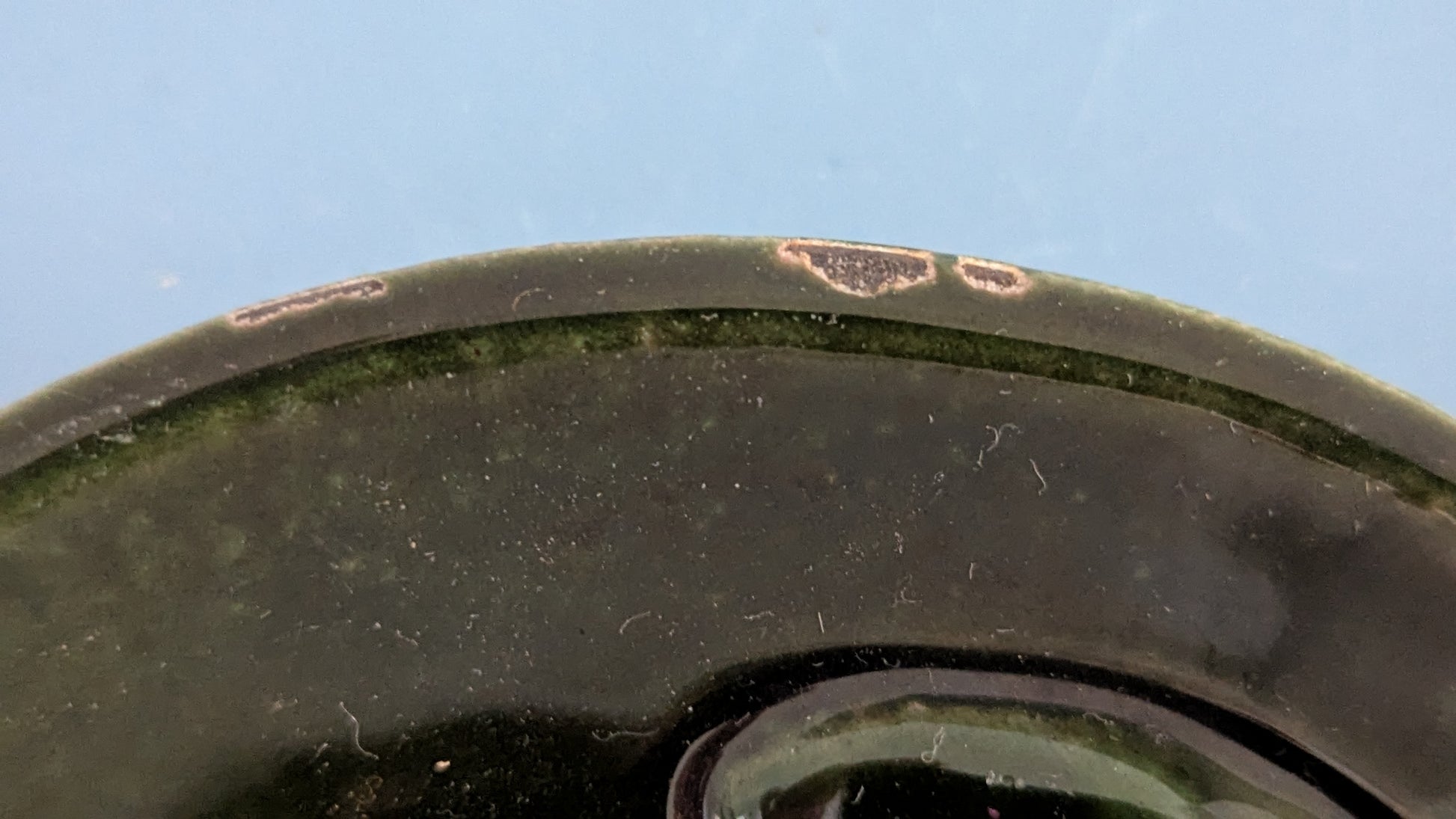 Reunassa, saukon pään yläpuolella, pari kohtaa mistä emalointi lähtenyt pois. Muuten todella vähäistä käyttökulumaa.