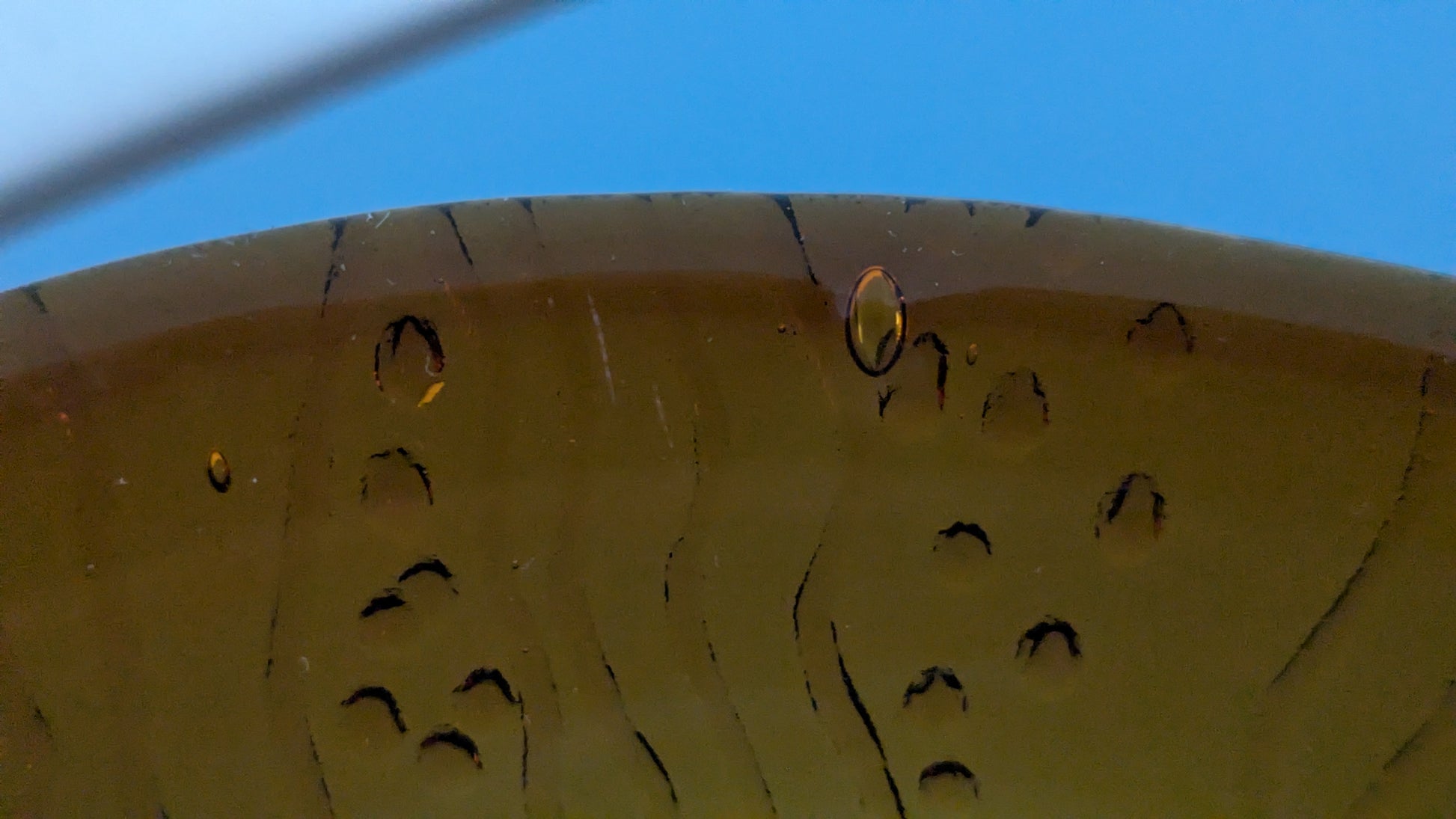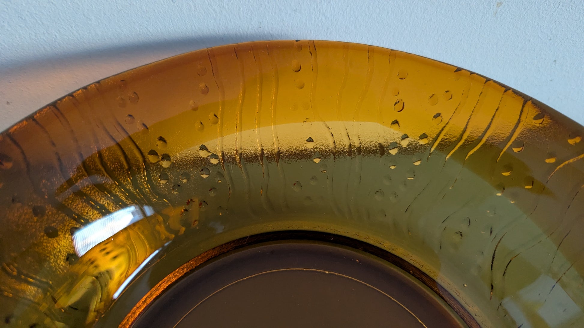 Ei iskemiä, halkeamia tai naarmuja. Lasimassan sisään jäänyt viimeisen kuvan mukainen 5mm ilmakupla.
