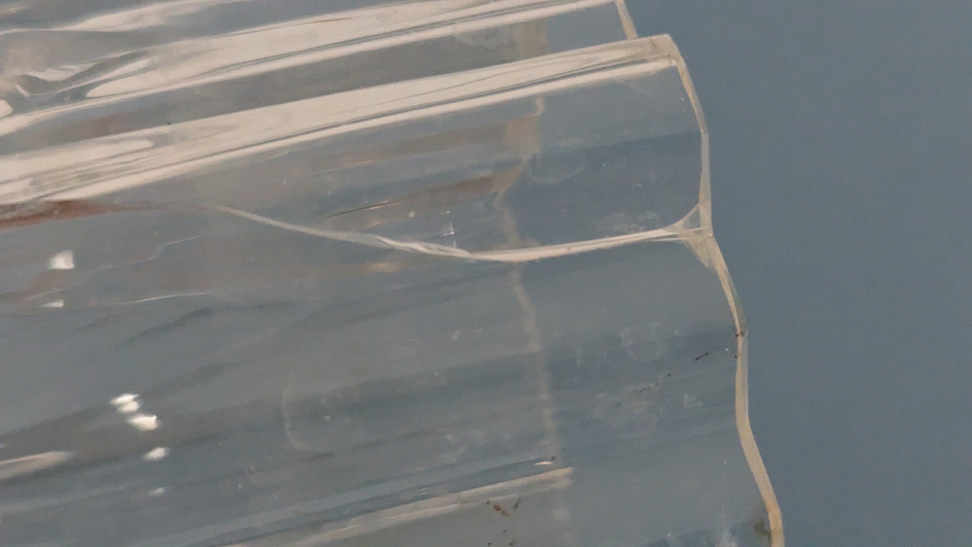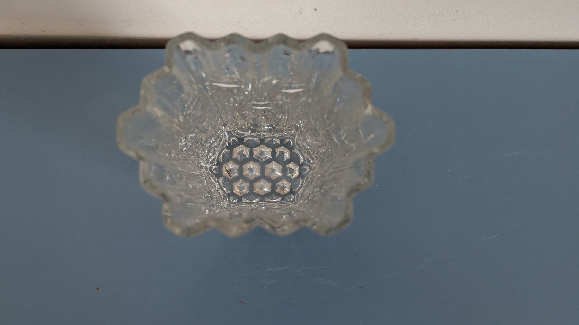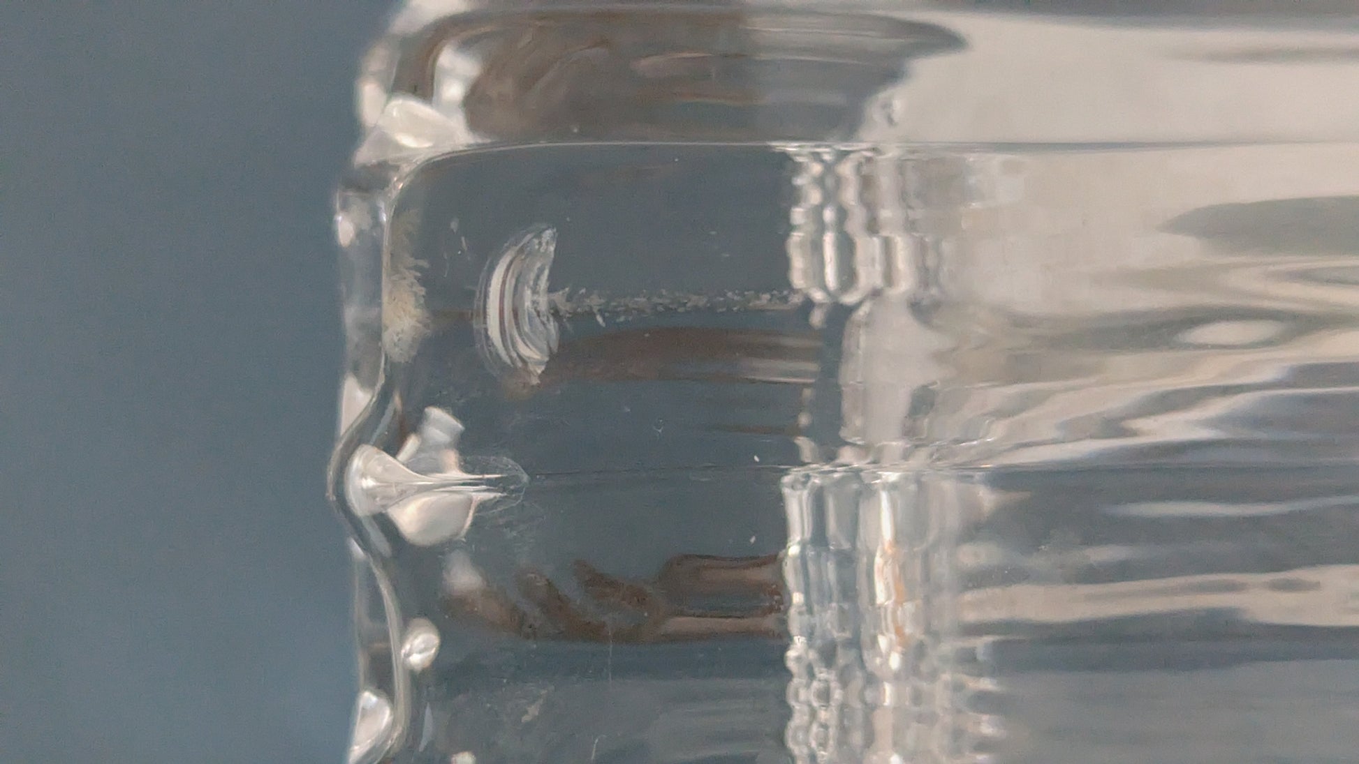 Vähäistä käyttökulumaa. Pohjan tuntumassa viimeisen kuvan mukainen iskemä. Yläosassa noin 4.5cm halkeama, mikä näkyy viimeisessä kuvassa.