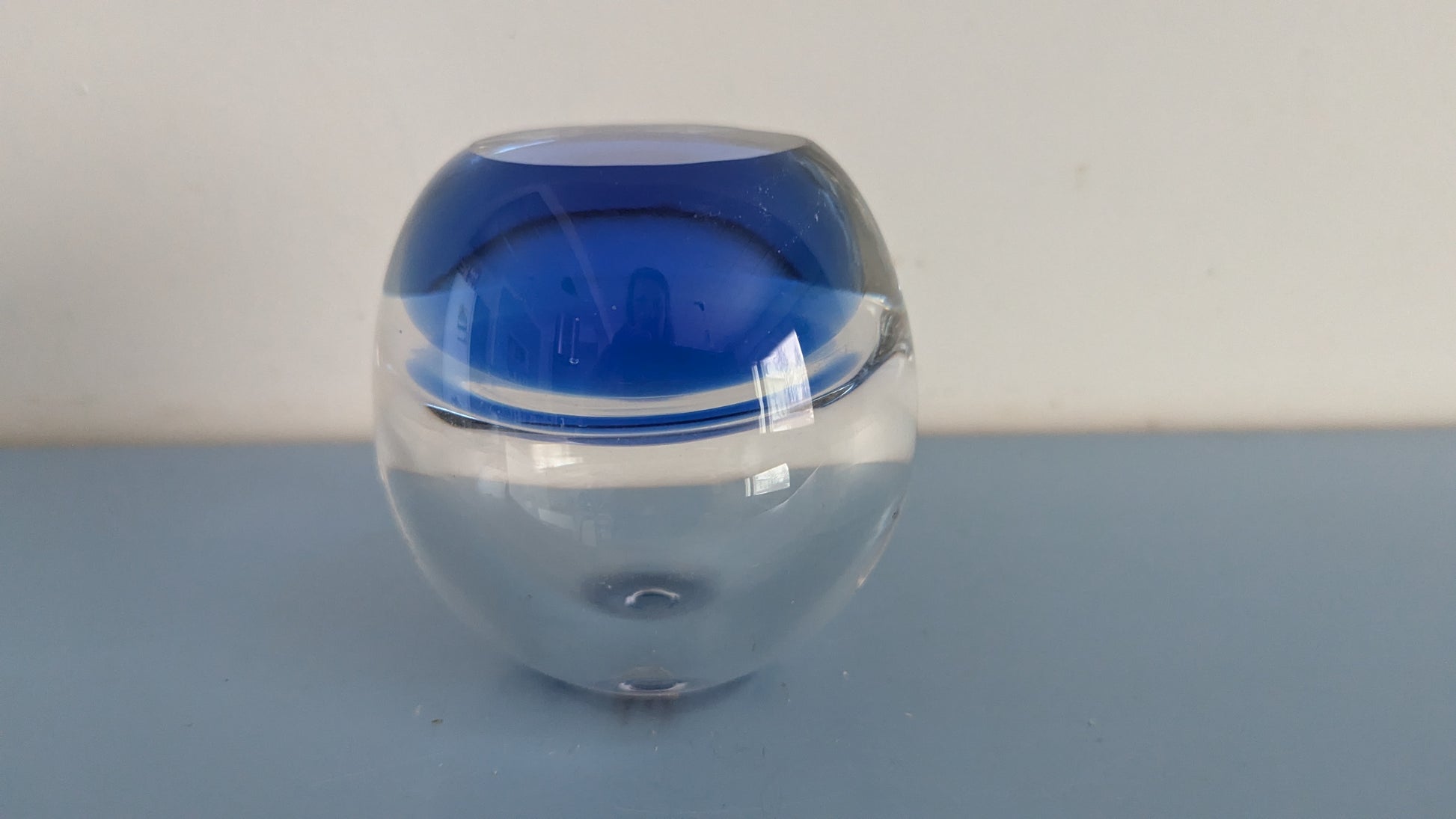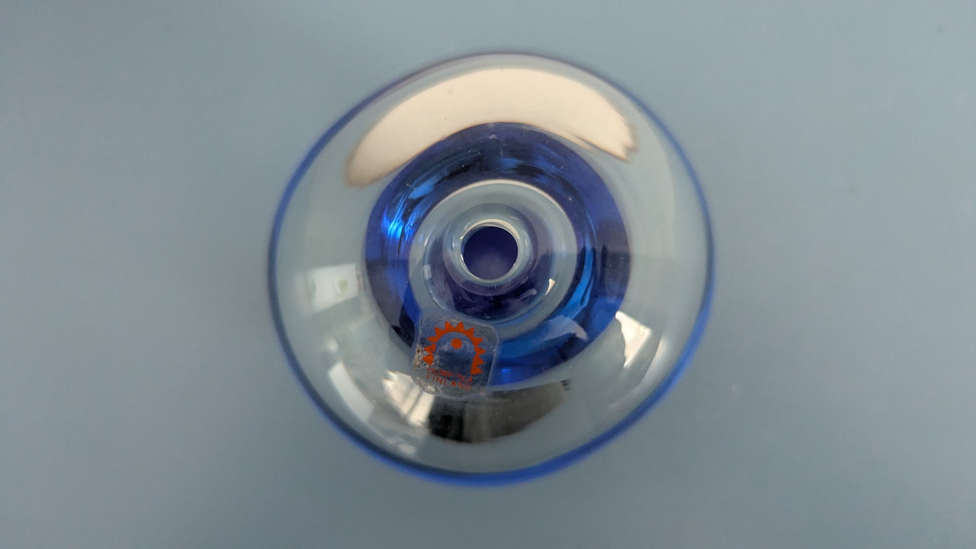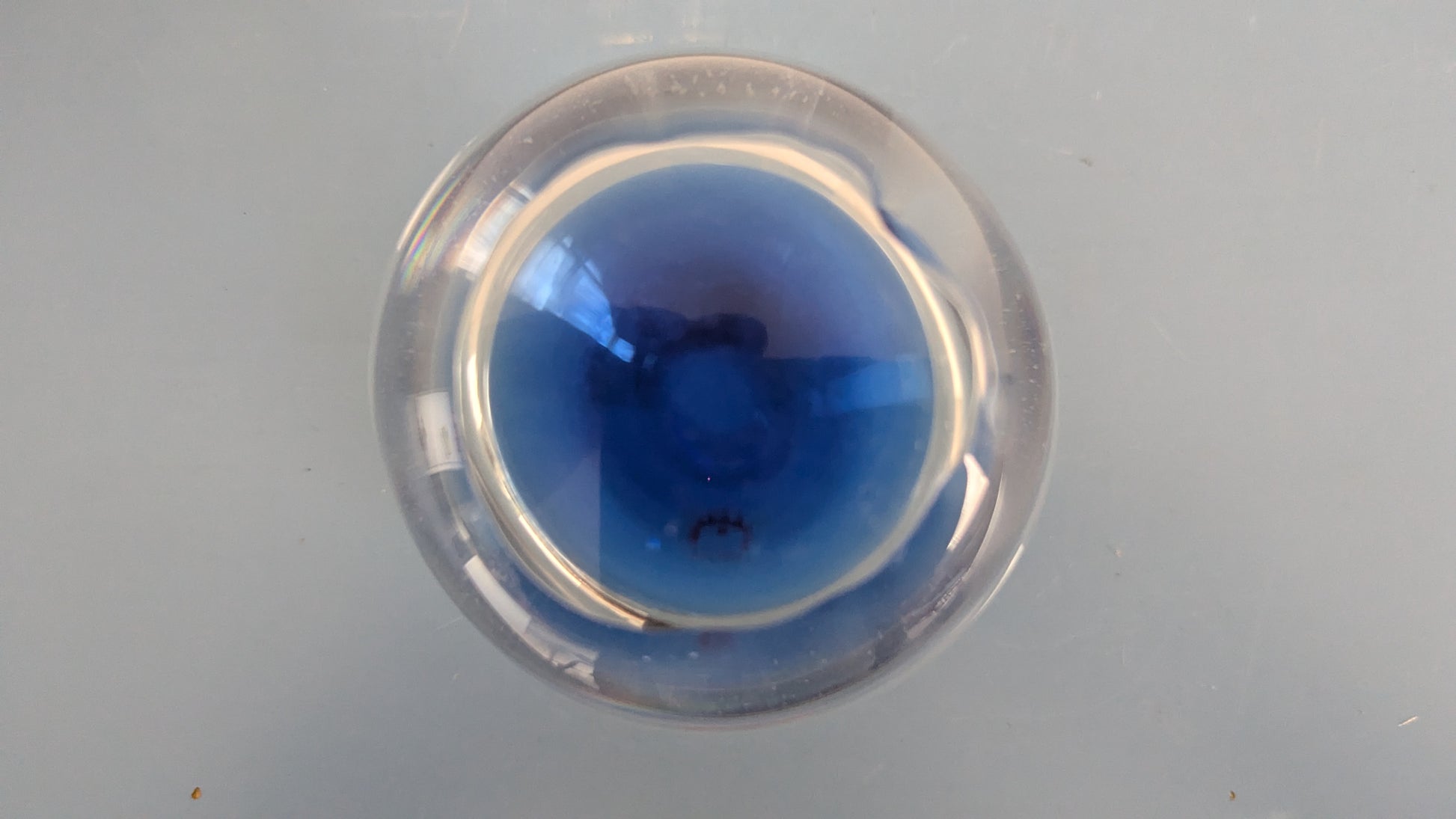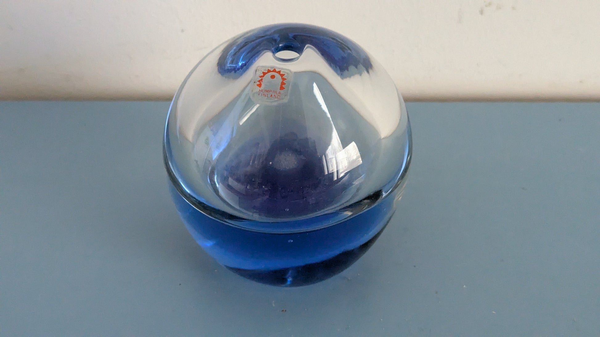 Erikoisempi Humppilan esine. Muistuttaa hieman Timo Sarpanevan Ukkospallo taidelasiesinettä. Myös siinä keskellä ylhäällä reikä ja sisältä ontto. Tämä ei tosin täysin ontto. Ainoastaan kirkas osuus on onttoa kun taas sininen osa on kokonaan lasimassaa. Ukkospallossa yleensä yläosa on tummempi ja alaosa kirkkaampaa lasia kun taas tässä se on päinvastoin. Suunnittelijasta ei tietoa. Vastaavaa ei löytynyt myöskään kirjoista tai netistä.