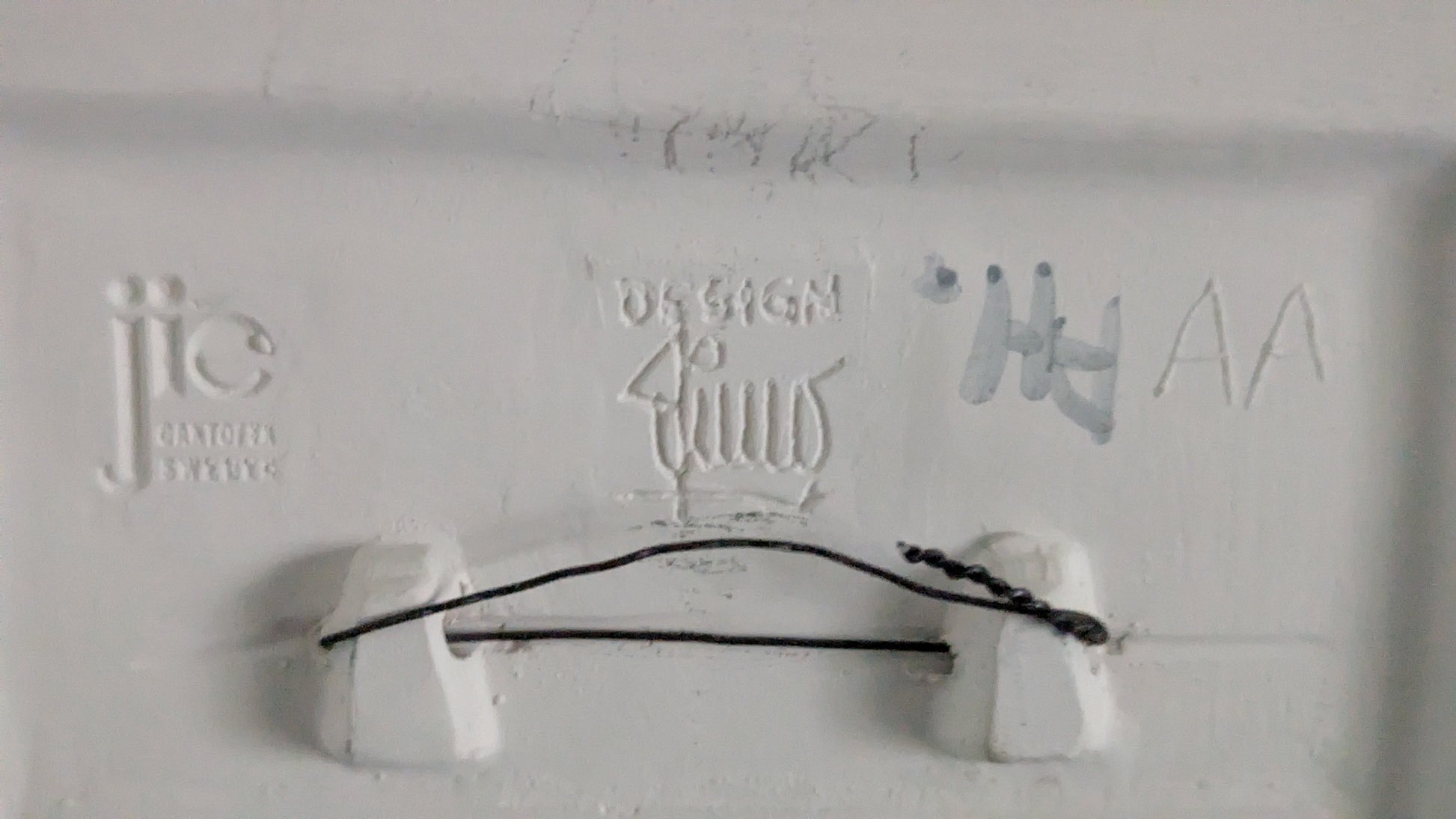 Takaosassa on syväleimattu sana Jie, mallinumero (788), teoksen nimi suomeksi ja ruotsiksi ja Aimon signeeraus. Lisäksi kirjaimet AA joista ei tietoa mitä tarkoittavat ja lopuksi vielä maalarin tussi signeeraus.