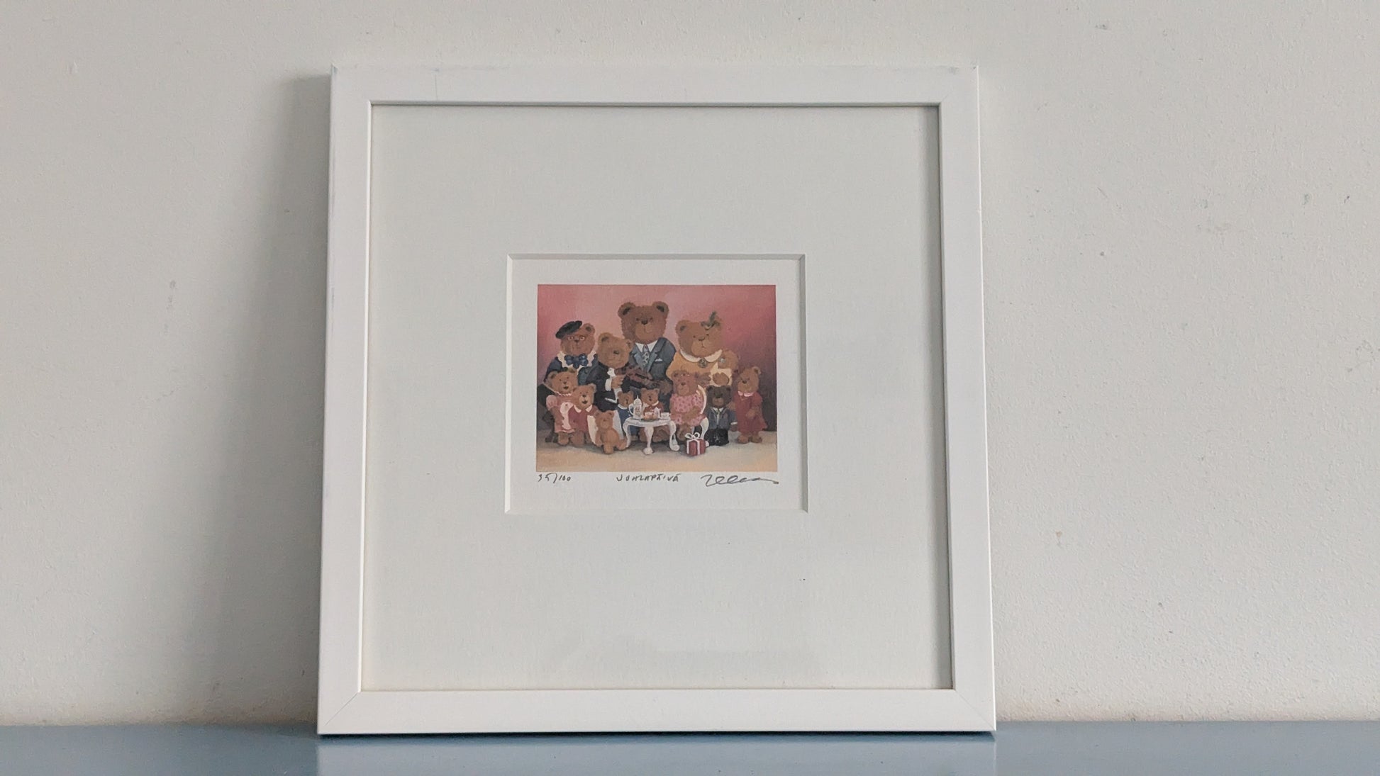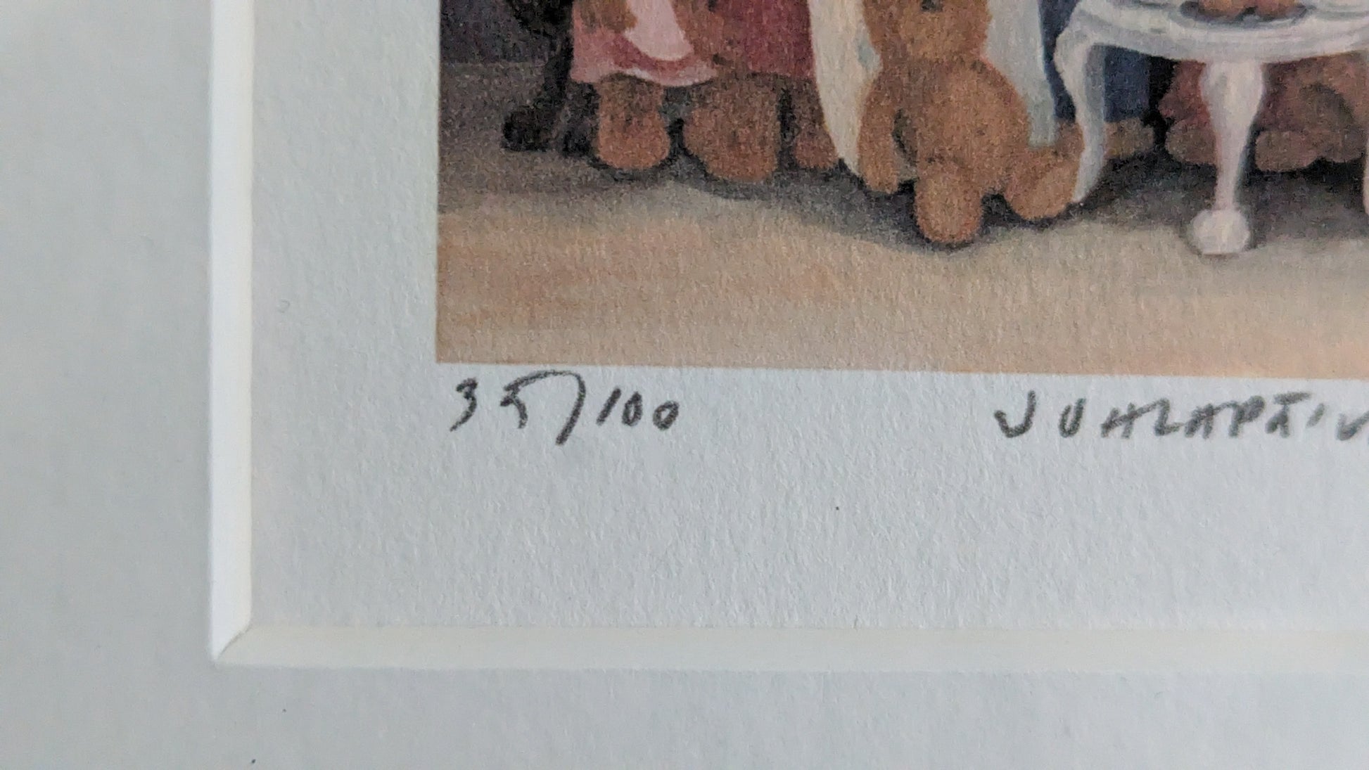 Teoksen alla numerointi 35/100 sekä teoksen nimi ja taiteilijan signeeraus.