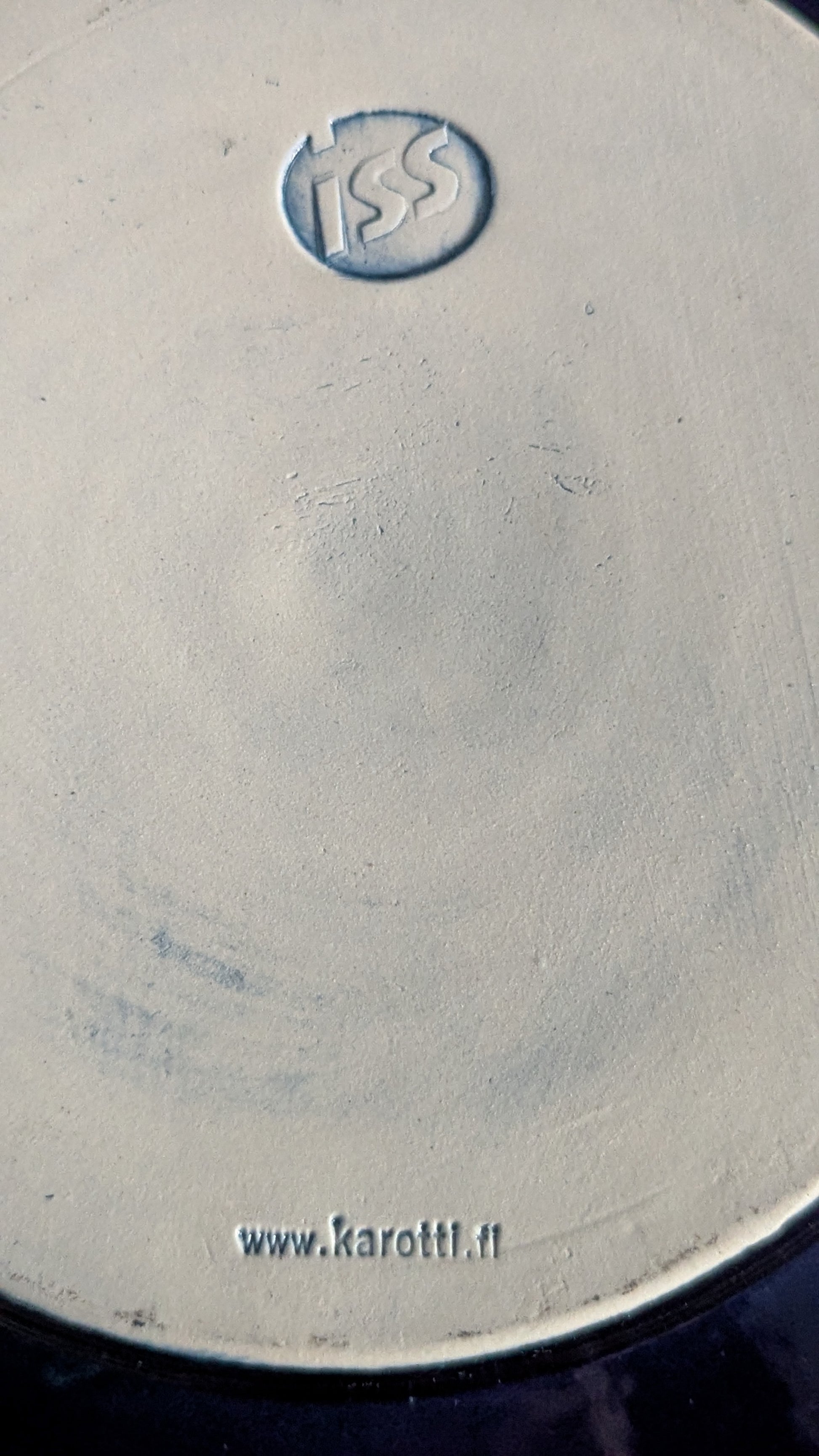 Karotti Studion tarra paikallaan. Pohjaan painettu yrityslogo eli tässä tapauksessa ISS eli ollut ilmeisesti jonkinlainen yrityslahje. Lisäksi pohjassa osoite www.karotti.fi.
