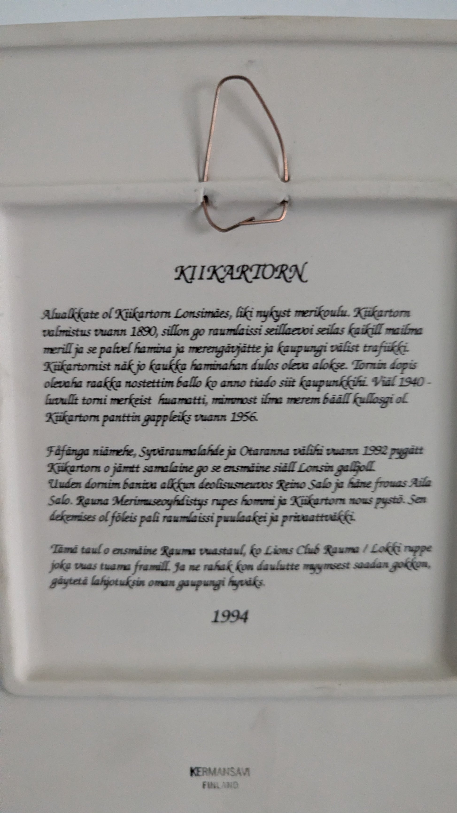 Kermansavi Rauma Kiikartorn / Kiikartorni Seinälaatta (1994, Lions Club Rauma)