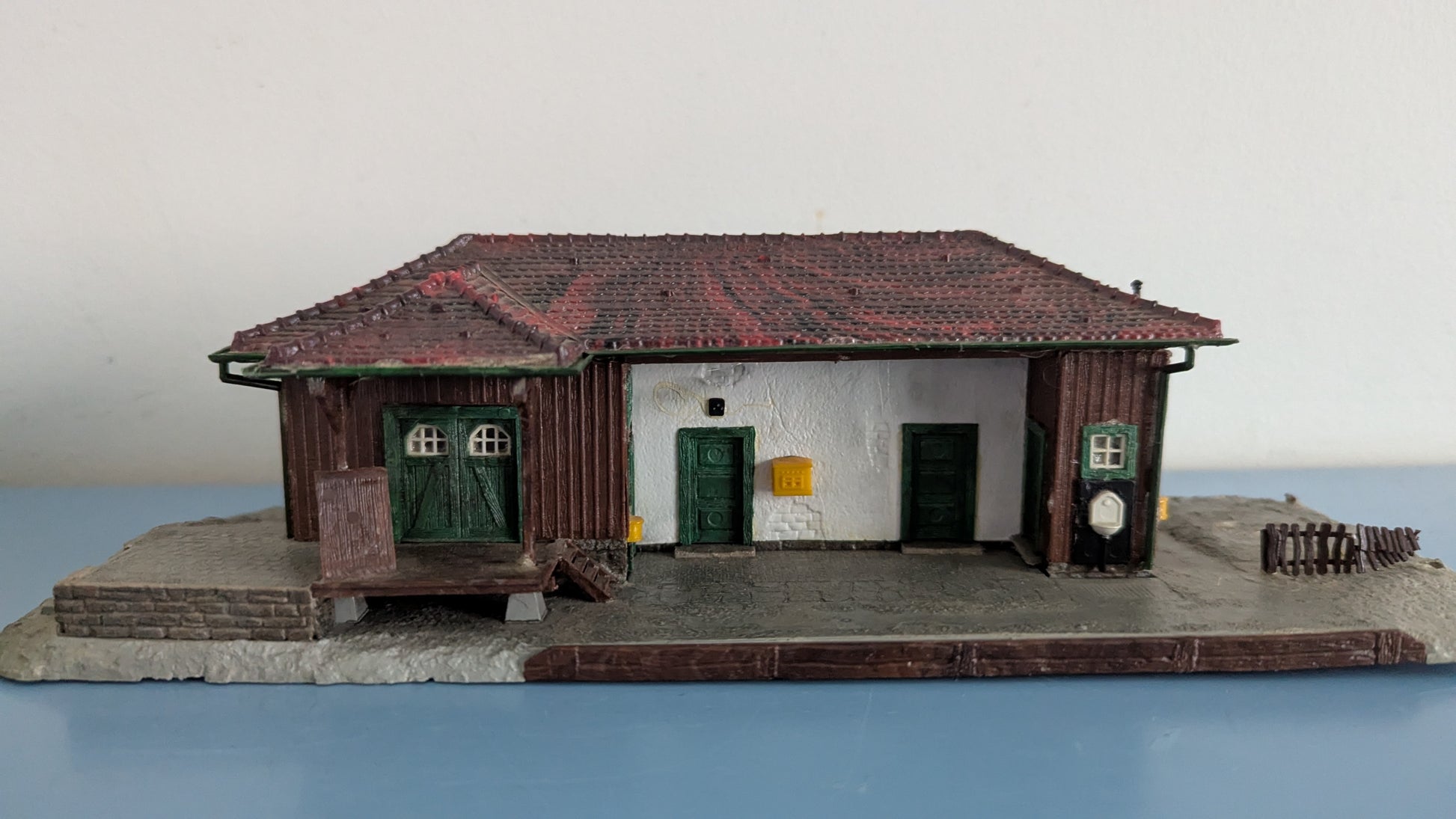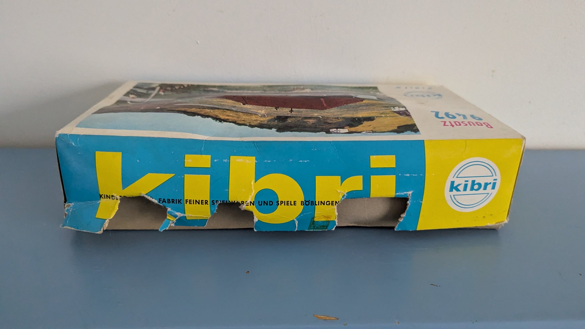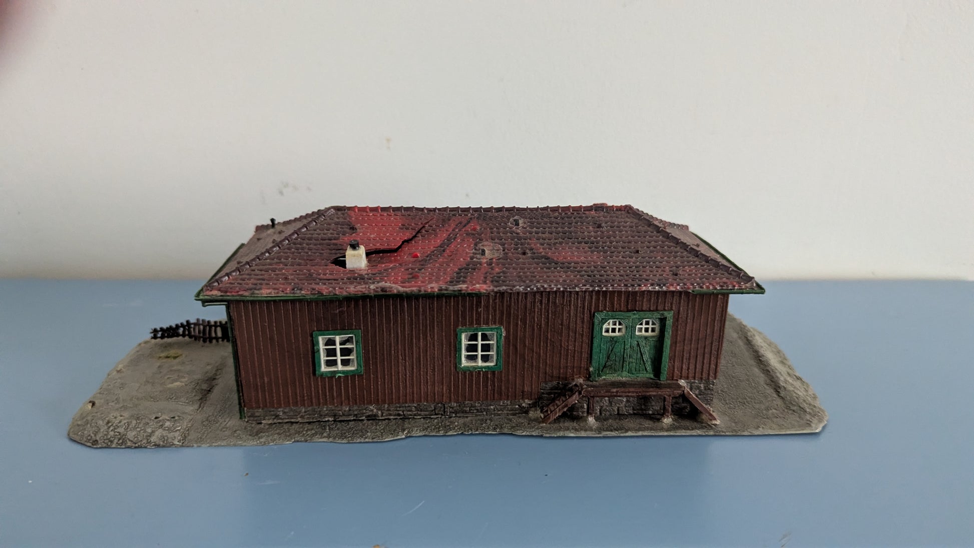 Rakennettu, Alkuperäisessä laatikossa. Löytyy ainakin Kibrin vuoden 1963 katalogista. Ainakin rakennuksen oikealla puolen ollut aitausta mutta nyt siinä on aidasta vain yksi puoli. Voi olla muitakin puutteita. Katossa piipun vieressä viimeisen kuvan mukainen halkeama. Muuten näyttäisi olevan kunnossa. Tosin pakkauksessa hieman sanomista.