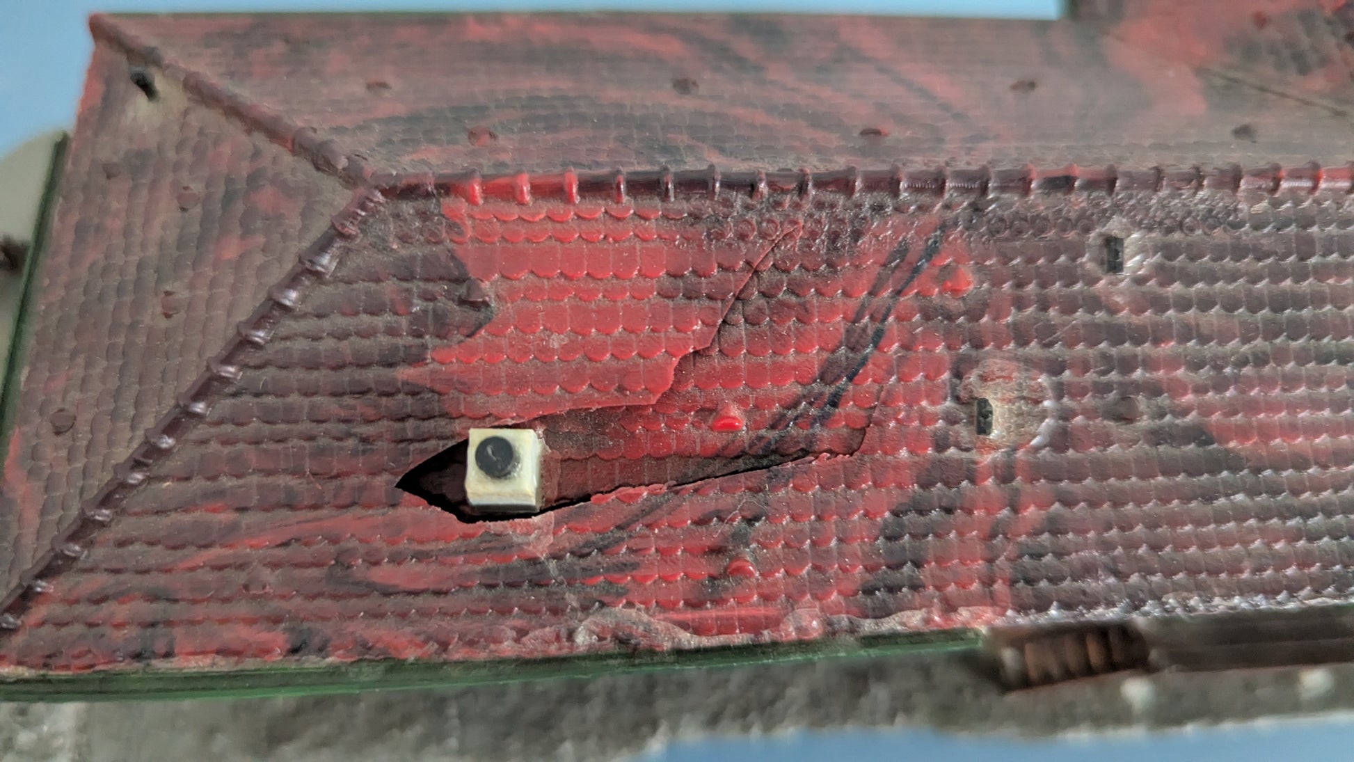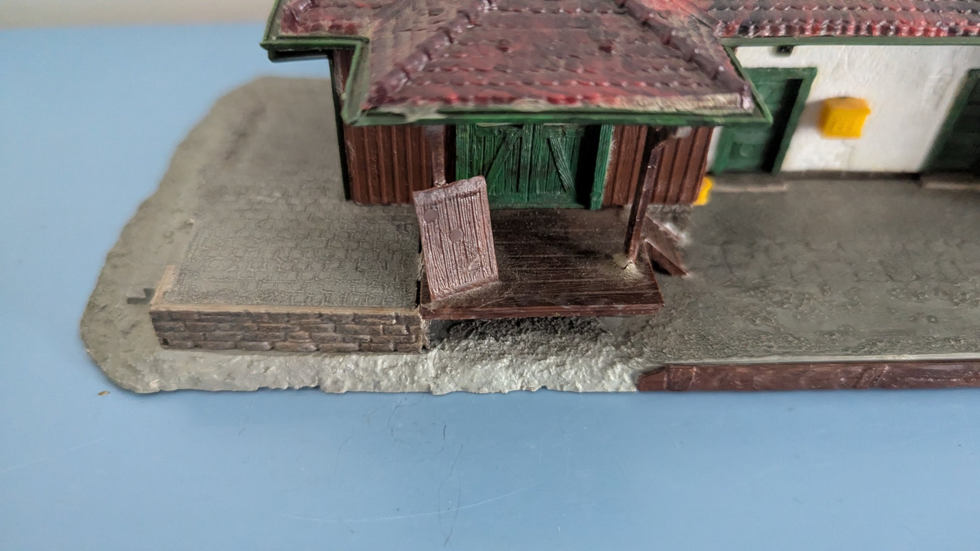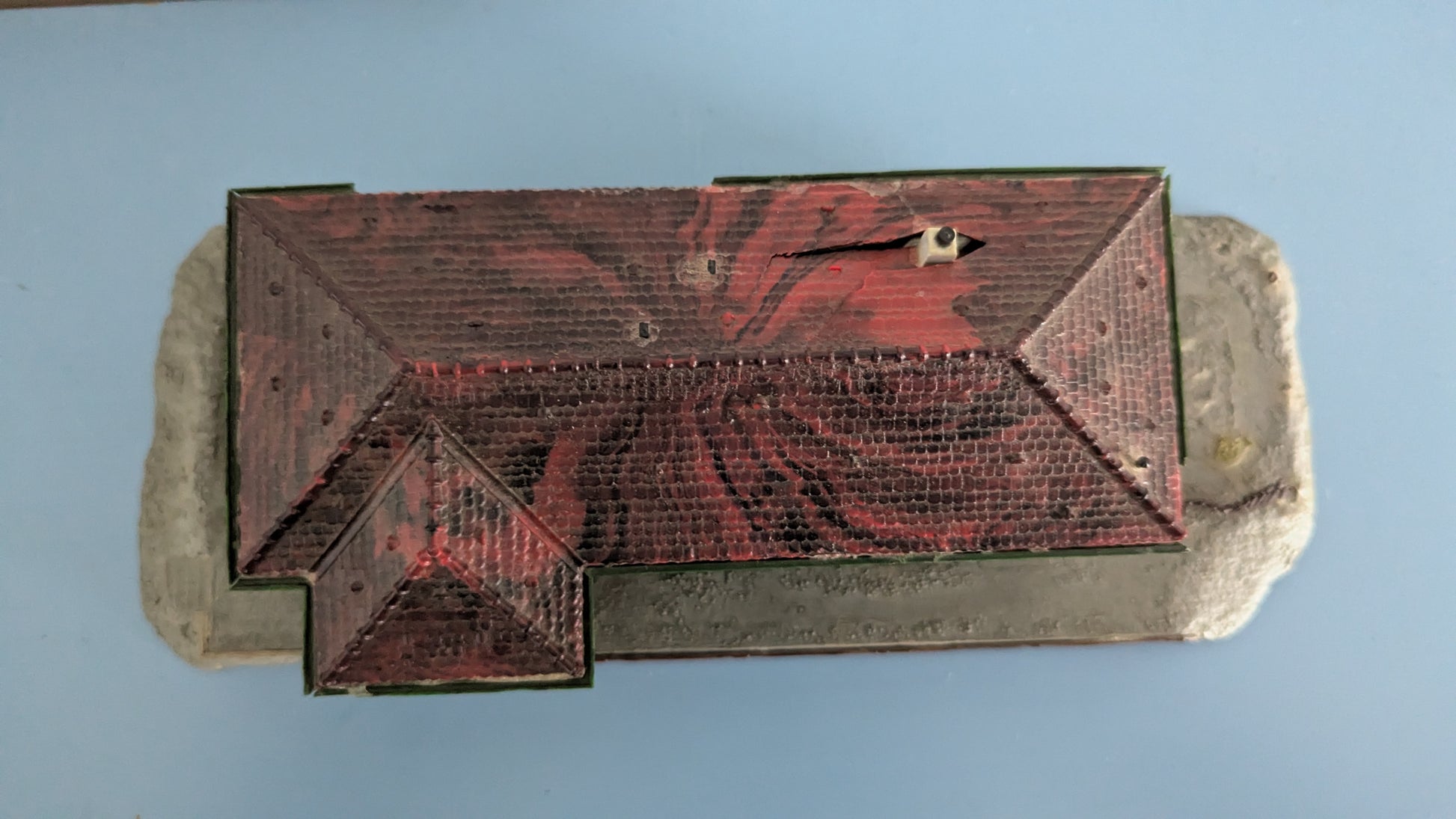 Rakennettu, Alkuperäisessä laatikossa. Löytyy ainakin Kibrin vuoden 1963 katalogista. Ainakin rakennuksen oikealla puolen ollut aitausta mutta nyt siinä on aidasta vain yksi puoli. Voi olla muitakin puutteita. Katossa piipun vieressä viimeisen kuvan mukainen halkeama. Muuten näyttäisi olevan kunnossa. Tosin pakkauksessa hieman sanomista.