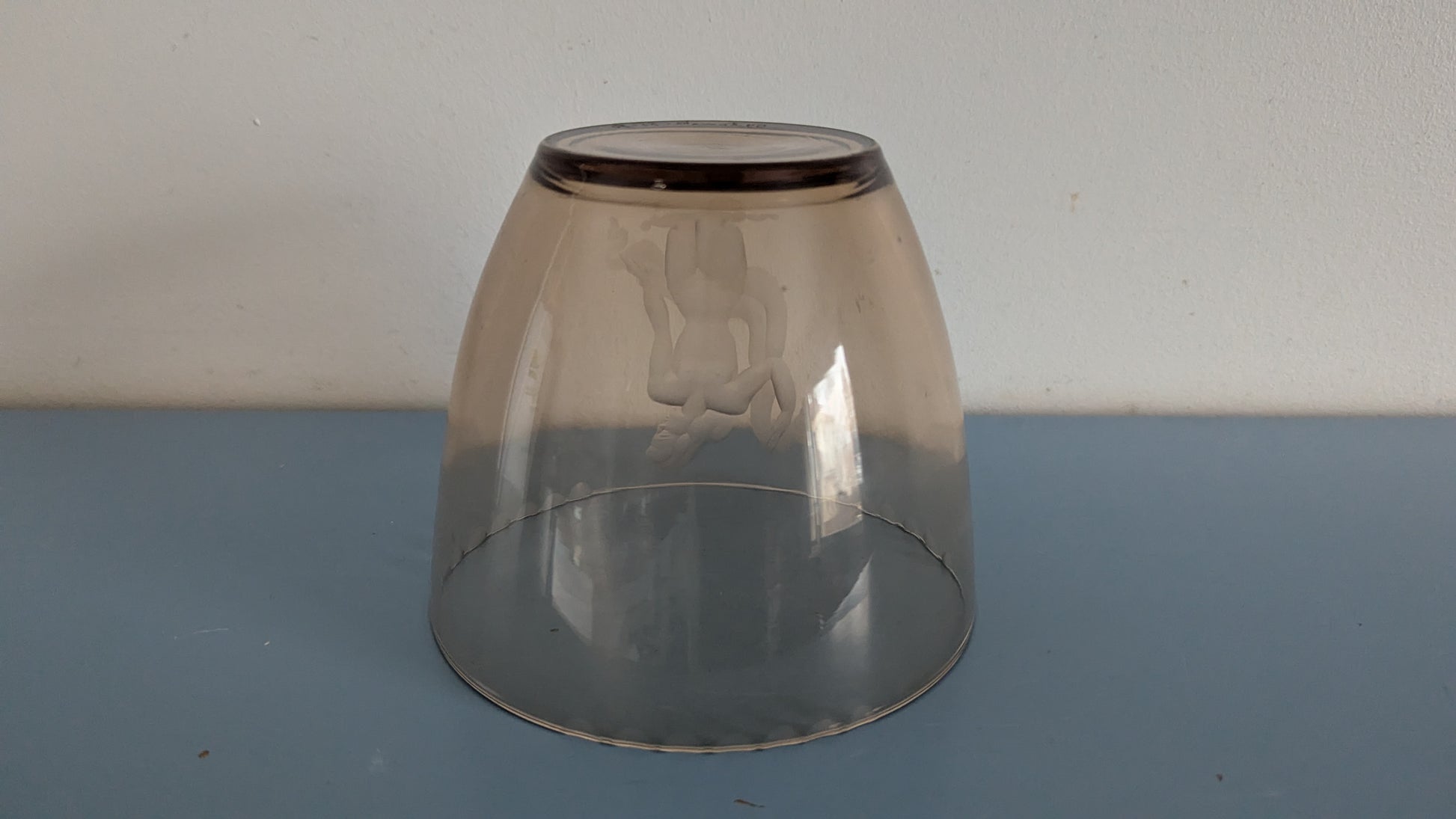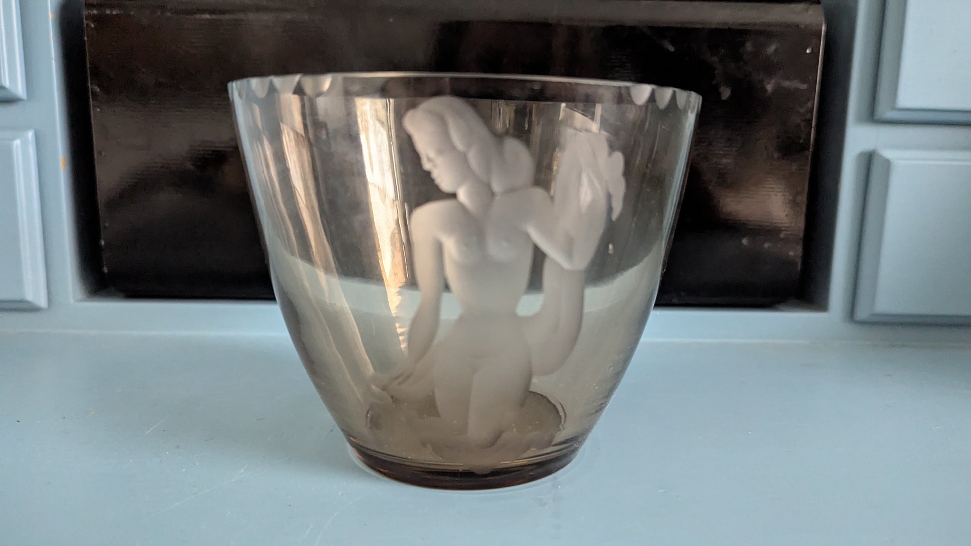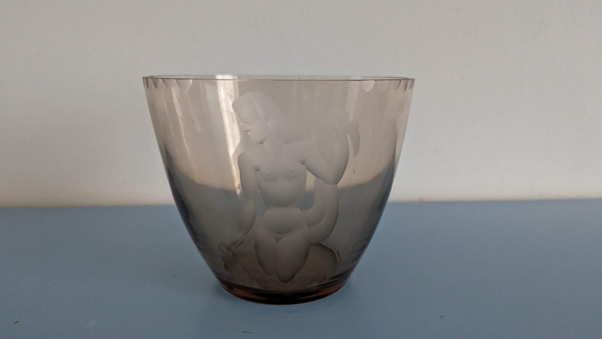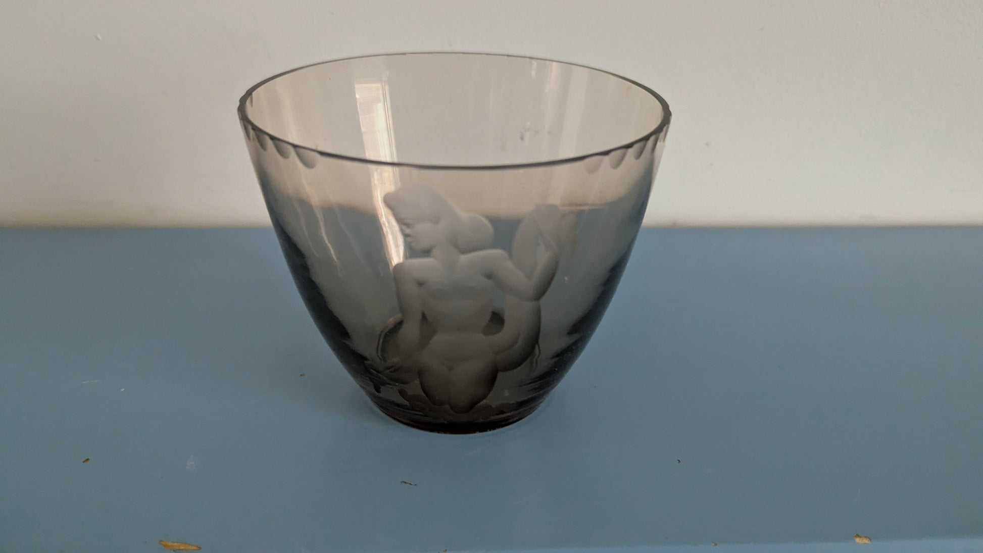 Materiaali: Pyörittäen puhallettu lasi, reuna hiottu, kuvio kaiverrettu