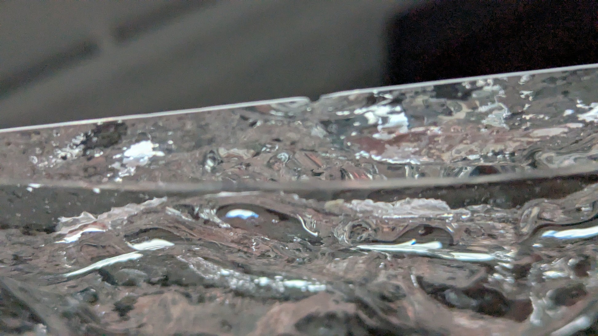 Ei halkeamia. Pohjassa siirtelystä tullutta naarmua. Yläreunan ulkoreunassa yksi noin 2mm iskemä, mikä näkyy viimeisessä kuvassa.