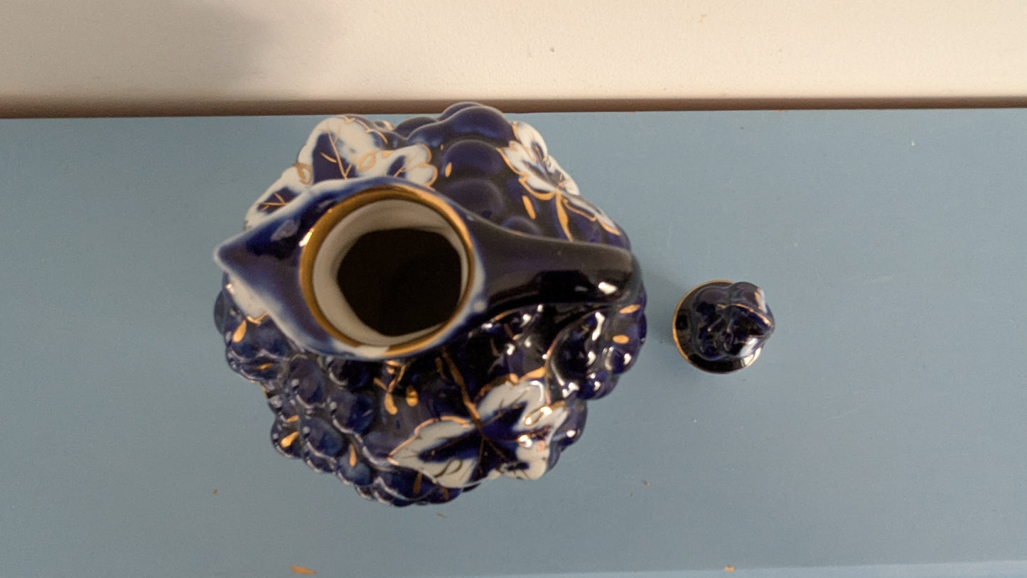Ei halkeamia tai naarmuja. Kultaus säilynyt erinomaisessa kunnossa. Suuaukon sisäpuolella viimeisen kuvan mukainen 5mm kokoinen iskemä. Korkin ollessa paikalla iskemä ei näy. Korkki peittää sen.
