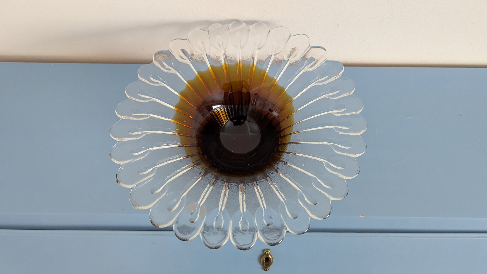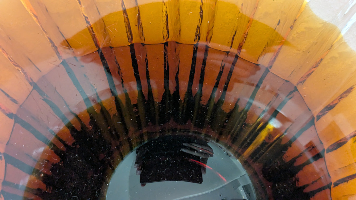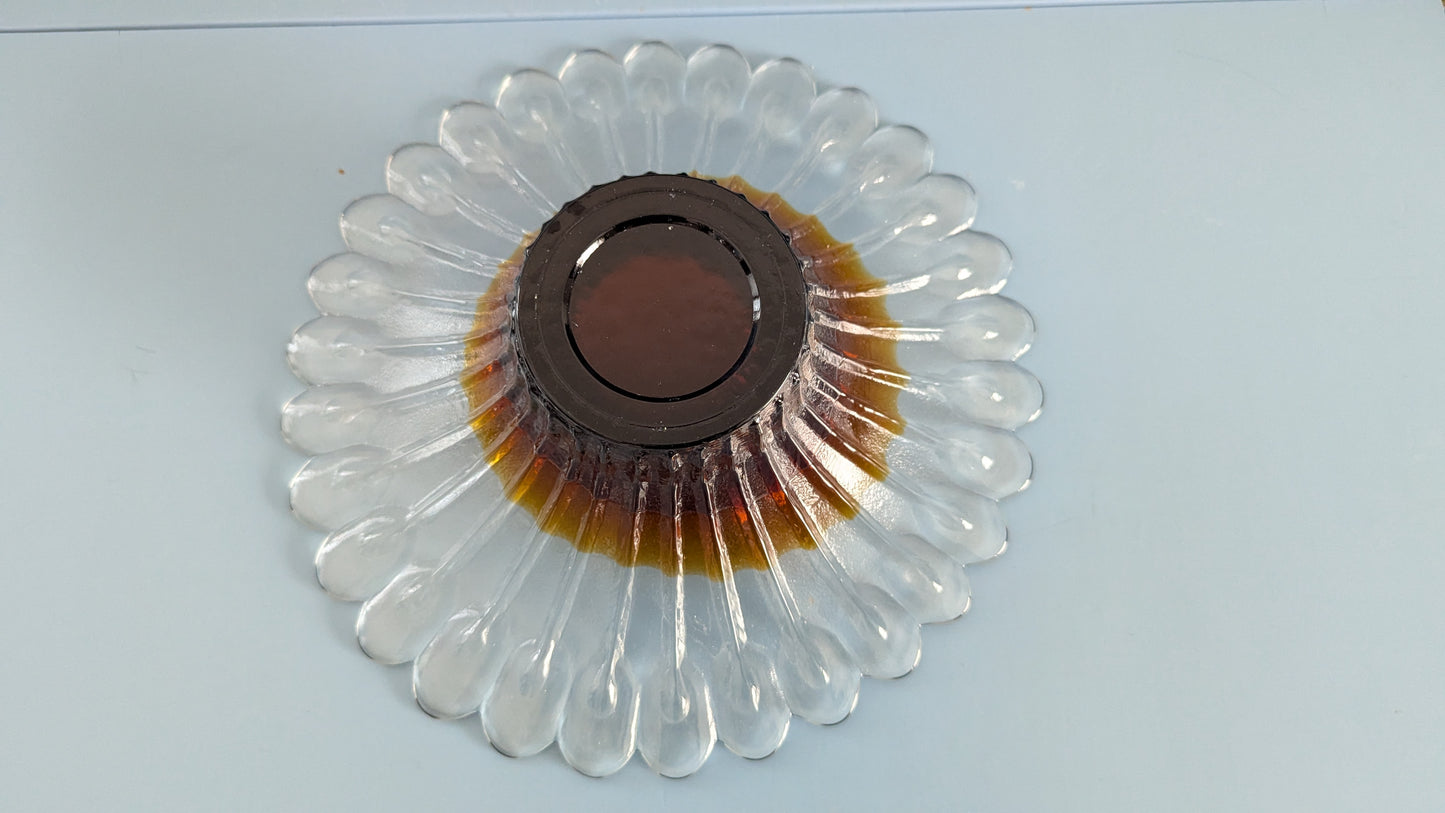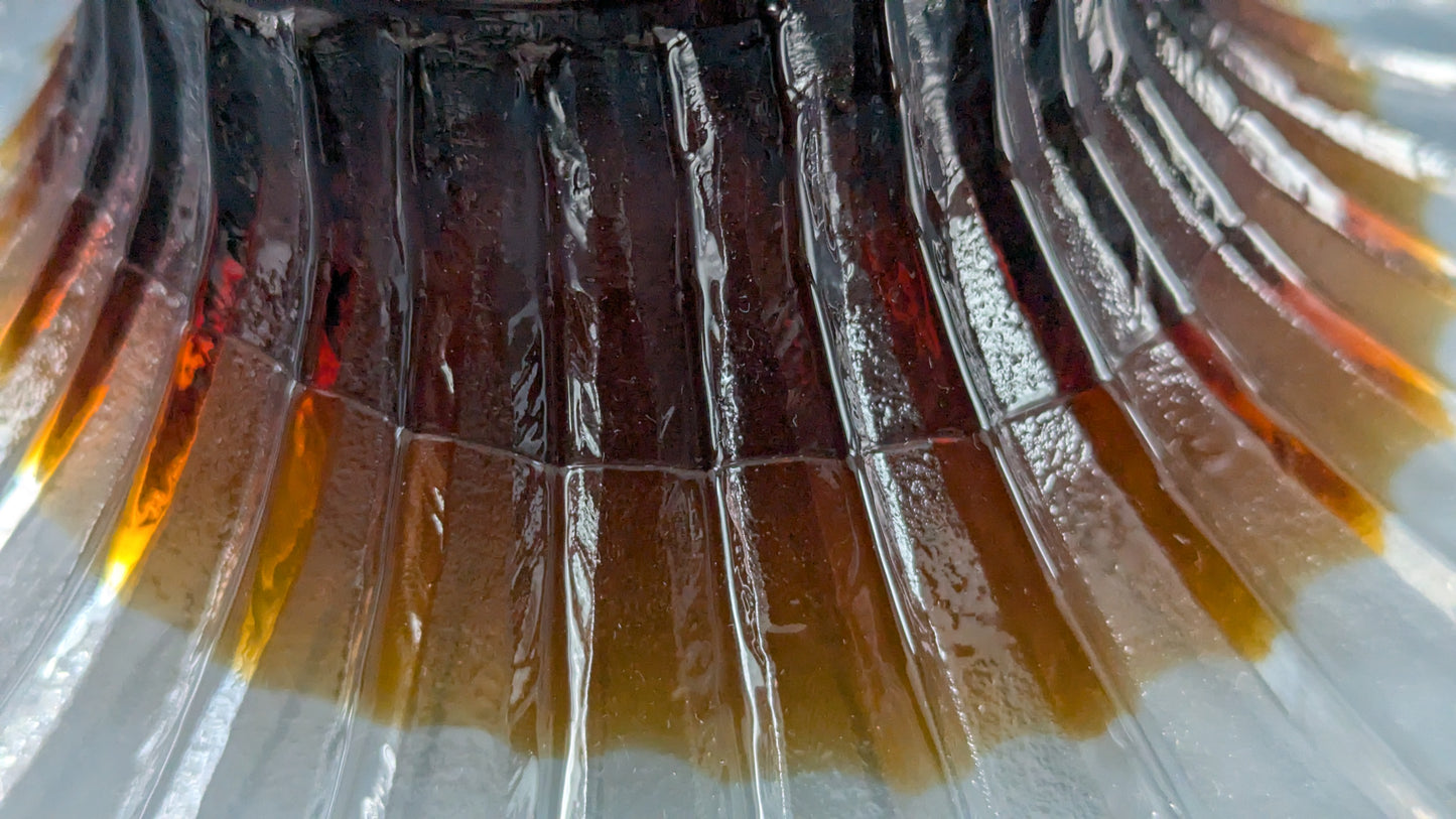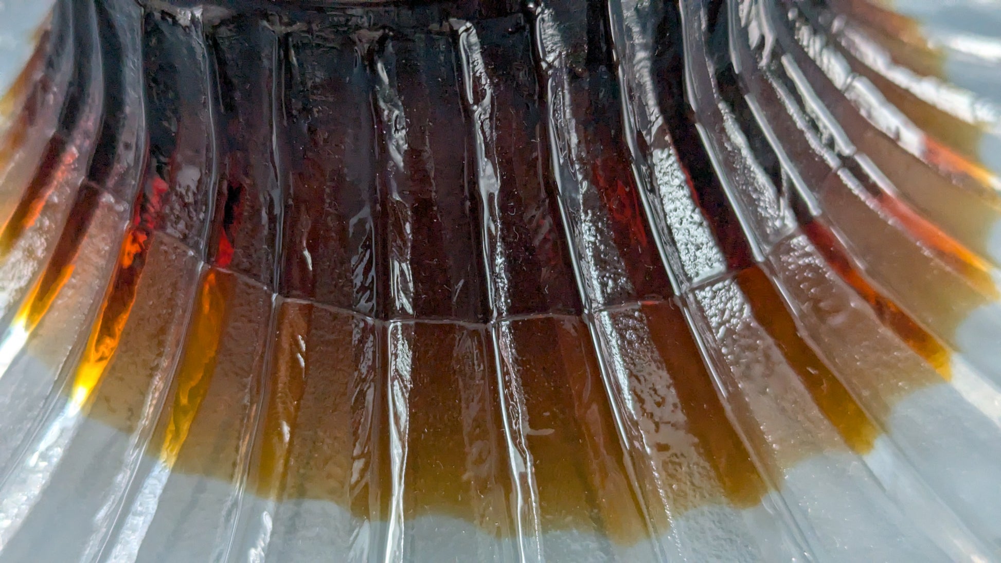 Ei iskemiä tai halkeamia. Vähäistä käyttökulumaa. Tummanruskean ja vaaleanruskean välinen kohta selkeästi näkyvissä. Näkyy kahdessa viimeisessä kuvassa.