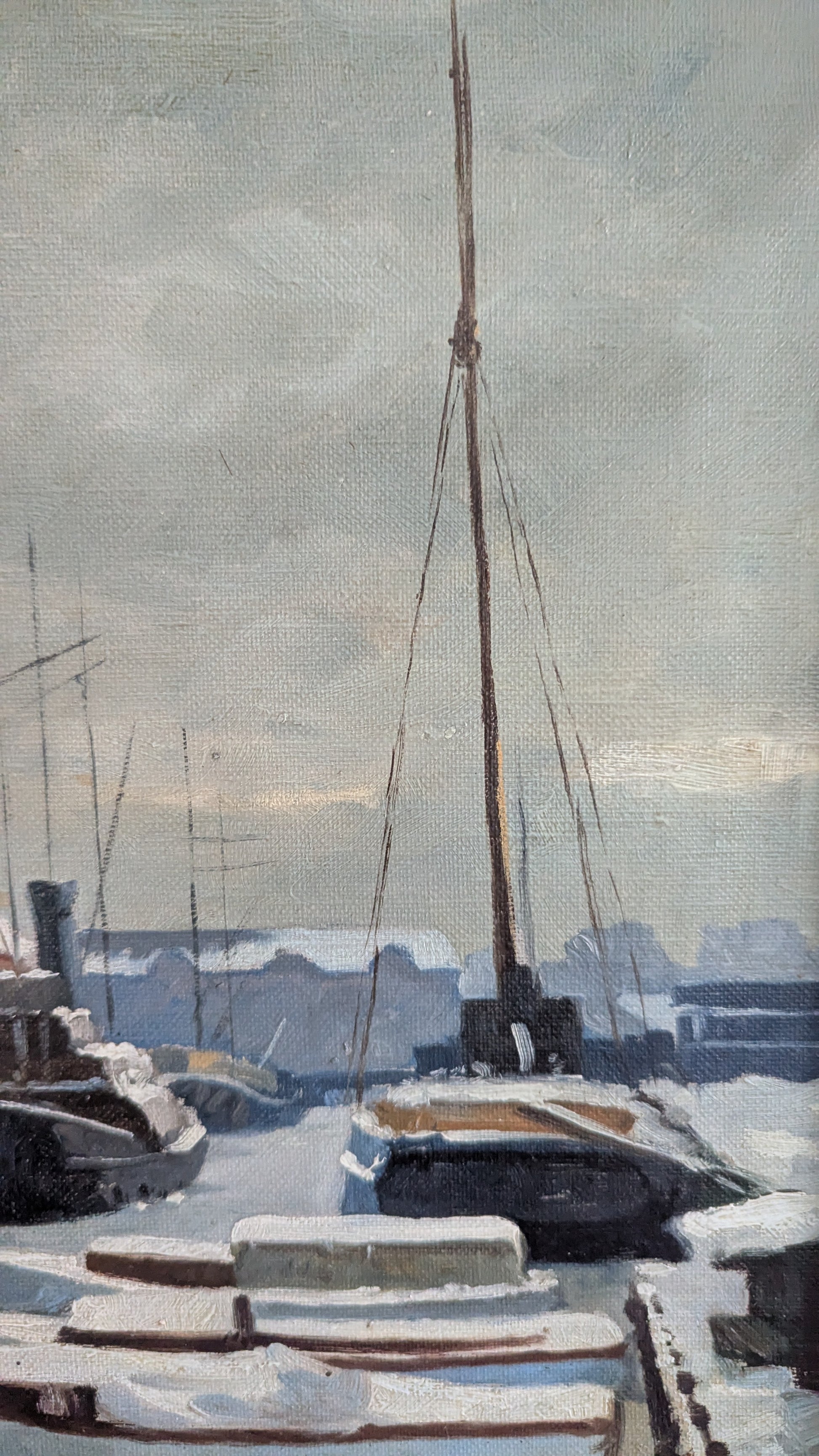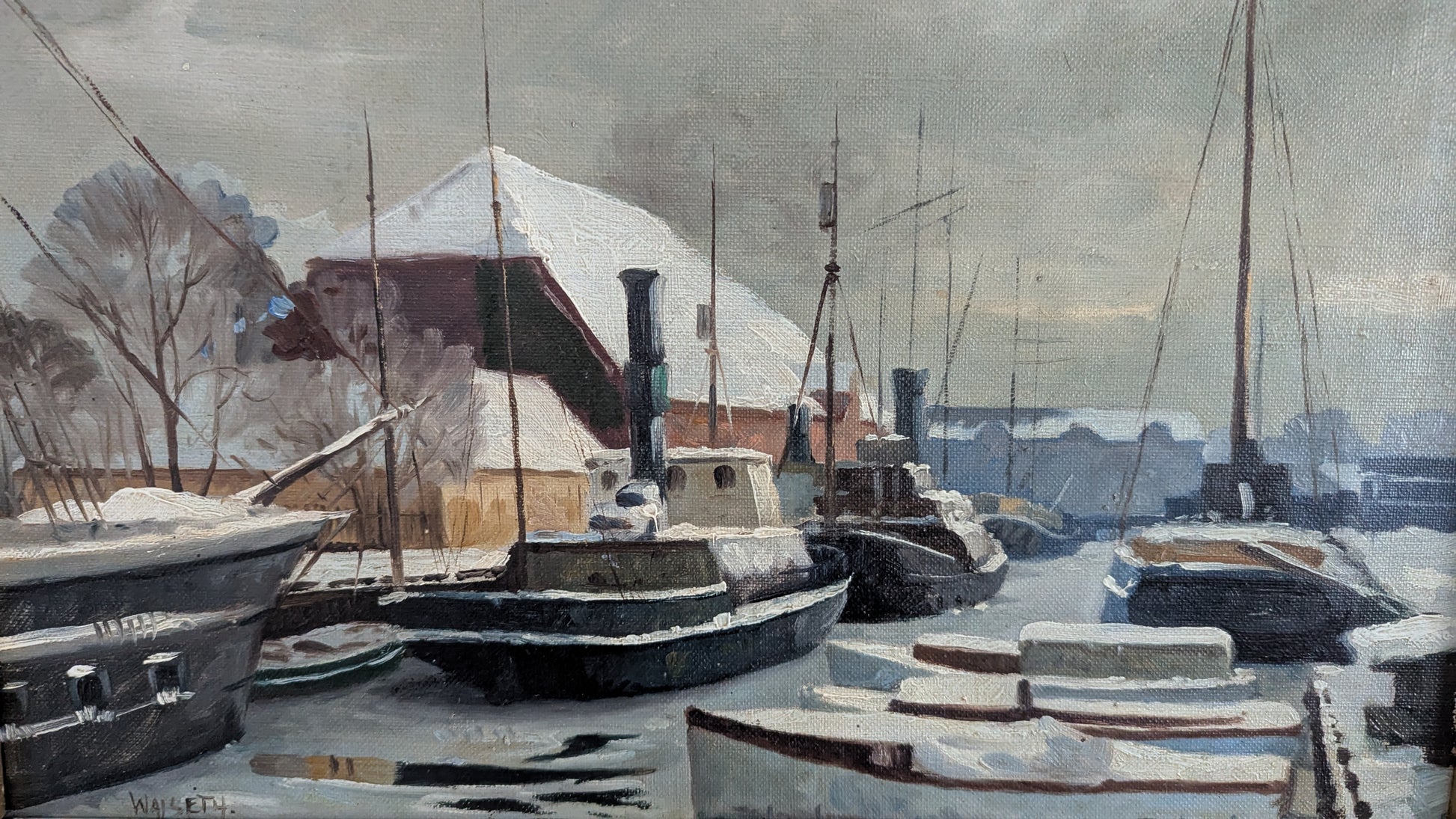 Väitetty Niels Walsethin (Tanska, 1914-2001) signeeraama öljyvärimaalaus kankaalle. Teos signeerattu Walseth. Taakse kirjoitettu myöhemmin tussilla Niels Walseth 1914-.