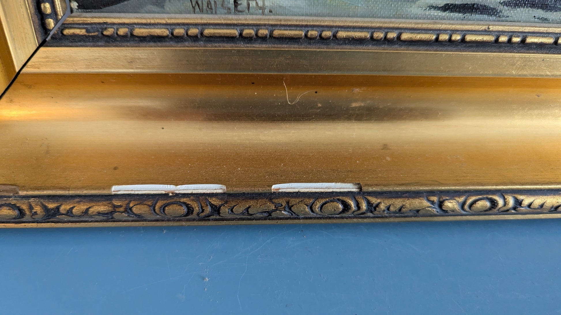 Kehyksissä lasi. Kehyksissä muutama viimeisen kuvan mukainen kolhu.