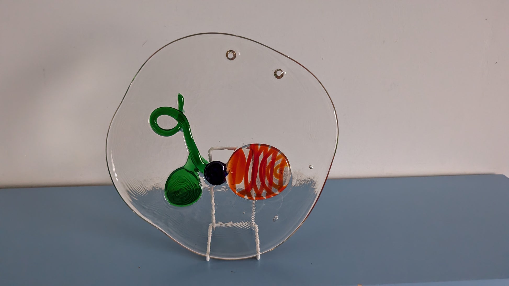 Ylhäällä lasissa kaksi reikää joista tämä saa roikkumaan seinälle tai ikkunalle.