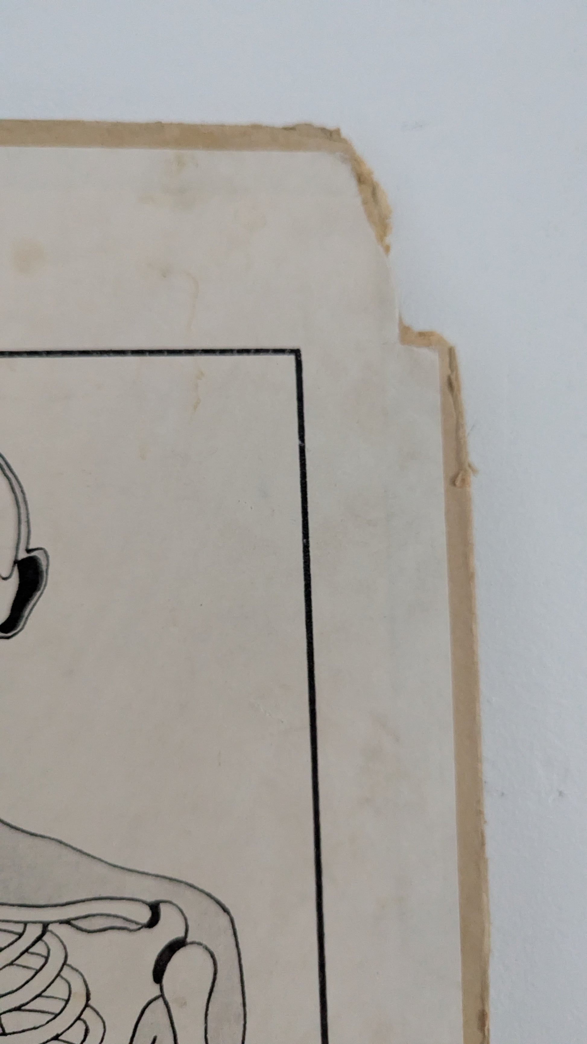 Oikeasta yläkulmasta puuttuu viimeisen kuvan mukainen palanen. Muissa kulmissa kulumaa. Hiukan kupera. Oikeaisi varmaan esim. painavan maton alla. Ei repeämiä.