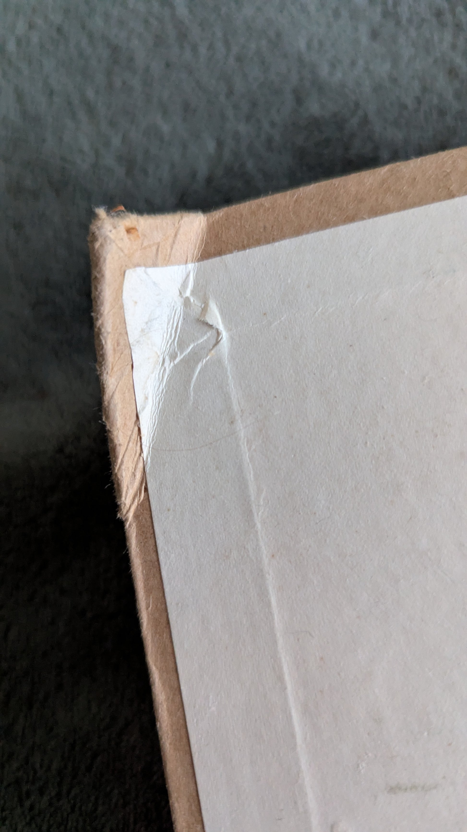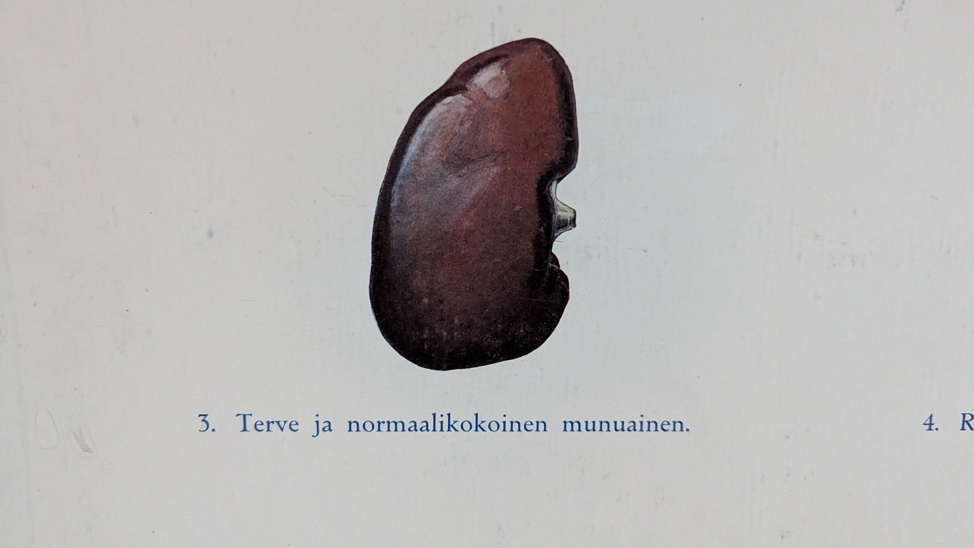 Oikeassa yläkulmassa viimeisen kuvan mukainen taittuma. Muut kulmat erinomaisessa kunnossa. Ylimmän kuvan eli terveen ja normaalikokoisen maksan alapuolella muutama kosteusvaurio, mikä näkyy toiseksi viimeisessä kuvassa. Vastaava kohta toisella puolen moitteettomassa kunnossa. Ainoastaan tuohon kuvan päälle valunut vettä mutta ei paljoa sillä muuten se näkyisi myös toisella puolen. Hiukan kupera. Oikeaisi varmaan esim. painavan maton alla.
