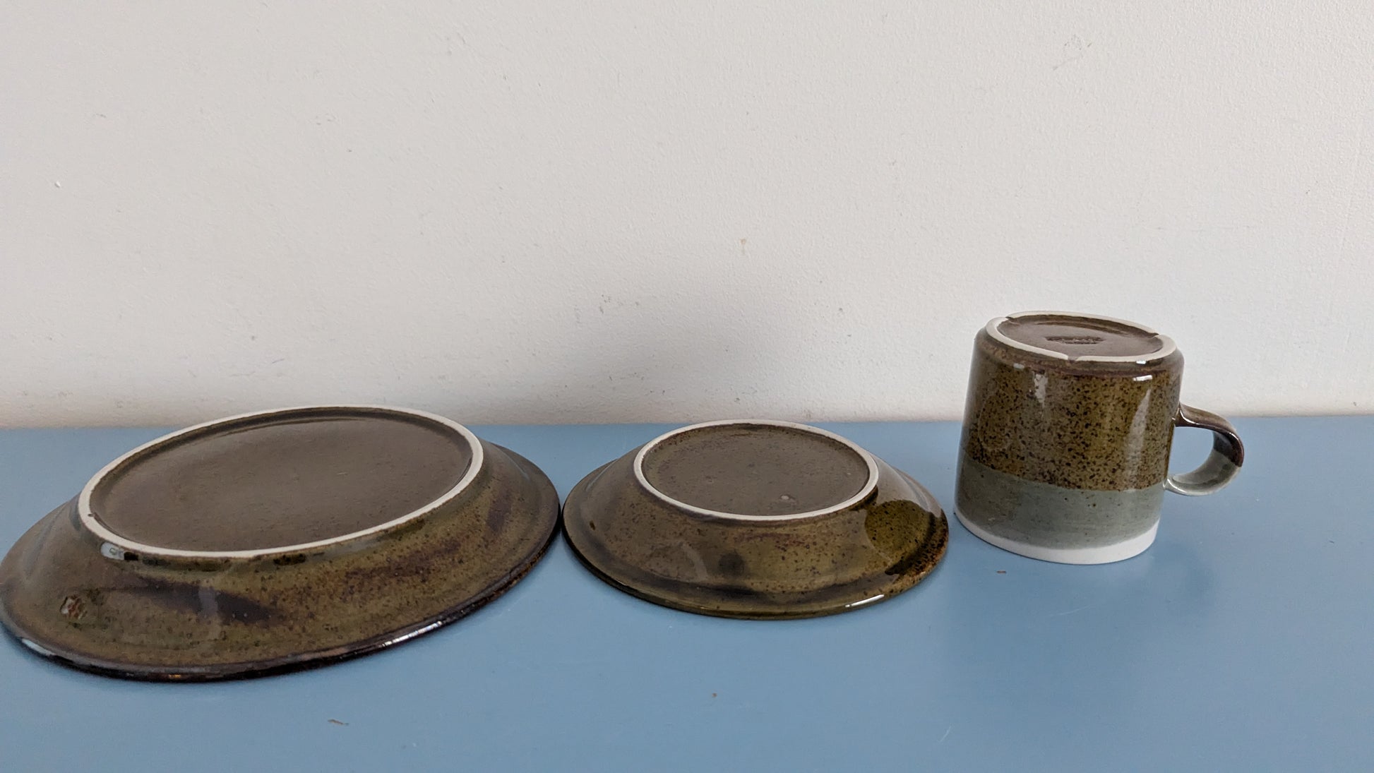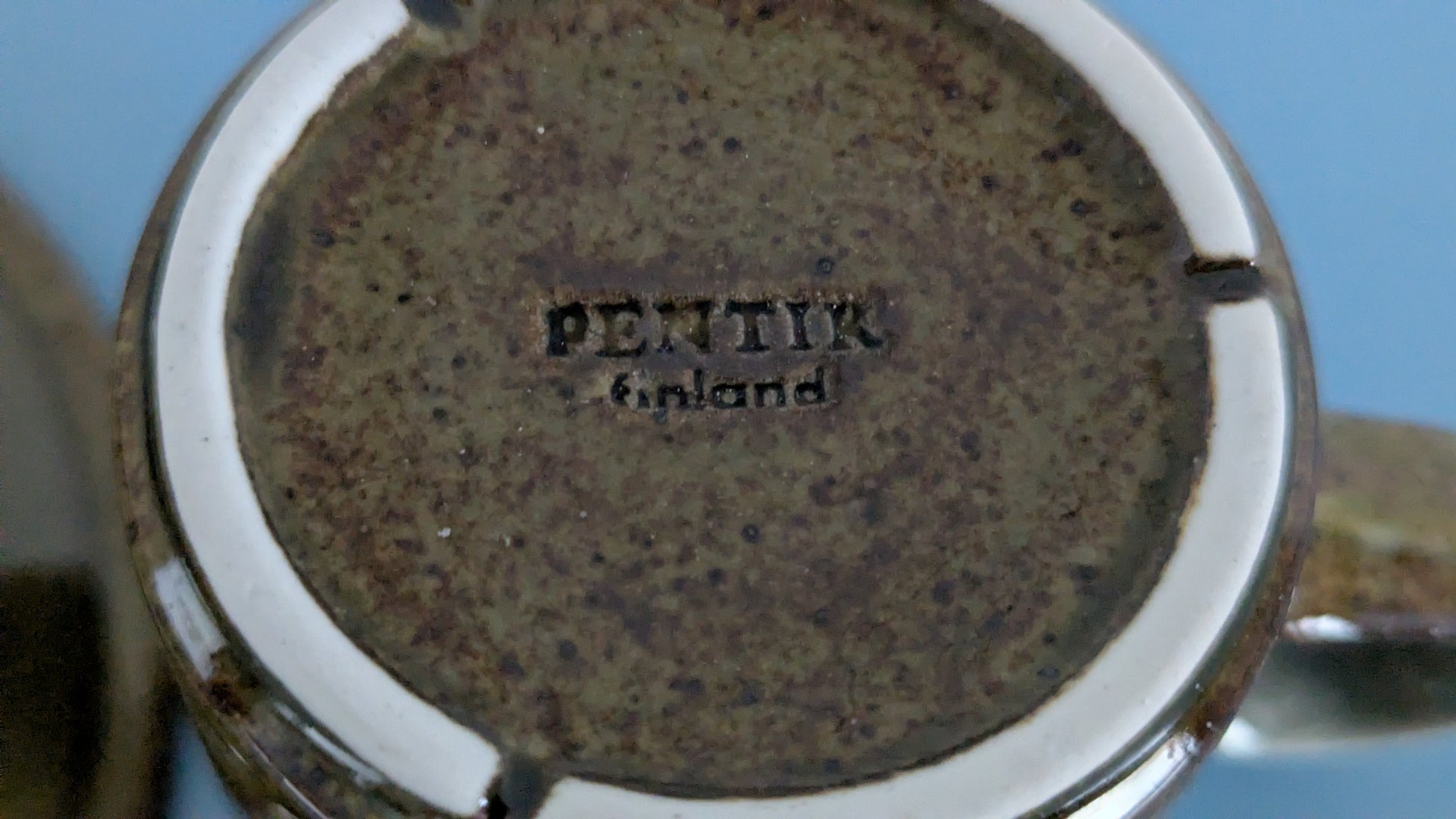 Kuppien pohjassa Pentik Finland leimat. Lautasissa ei leimoja.