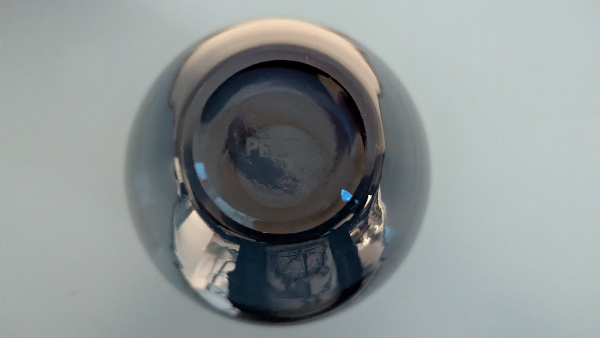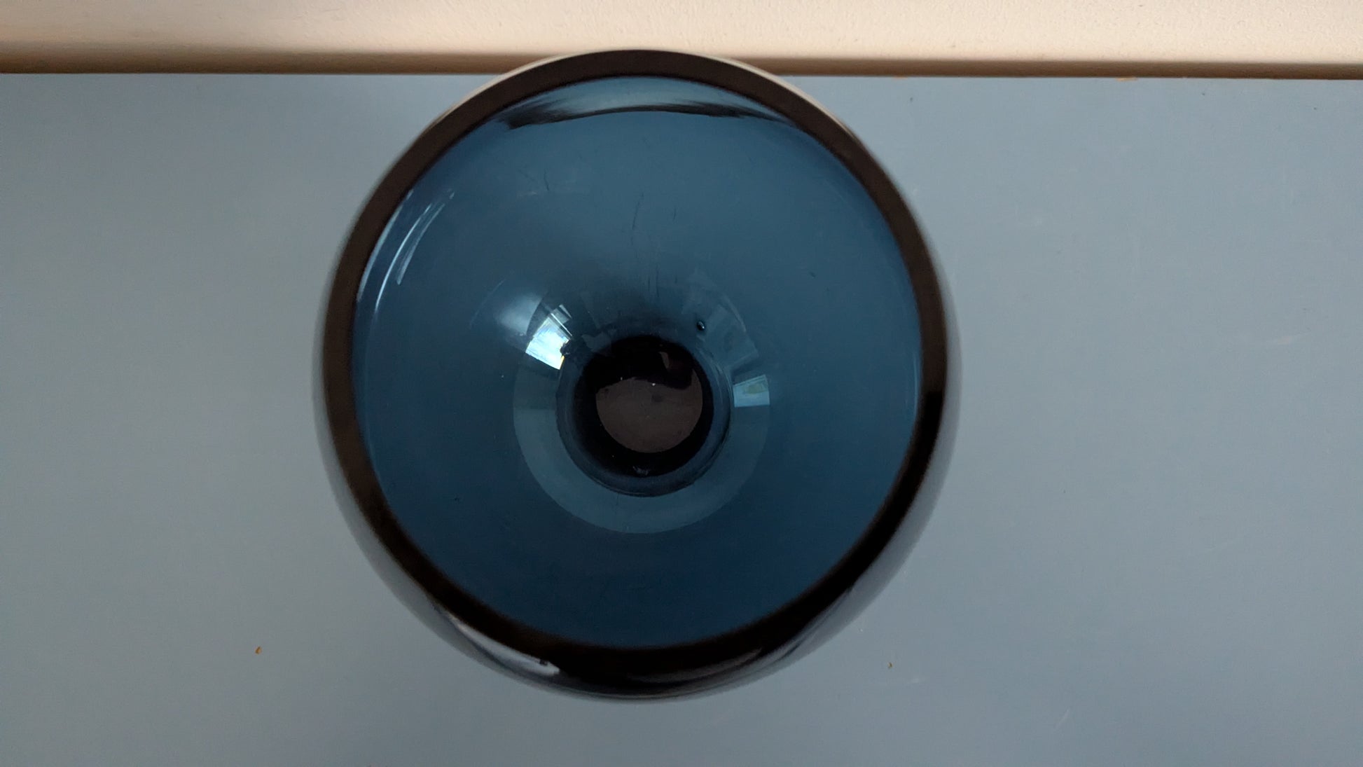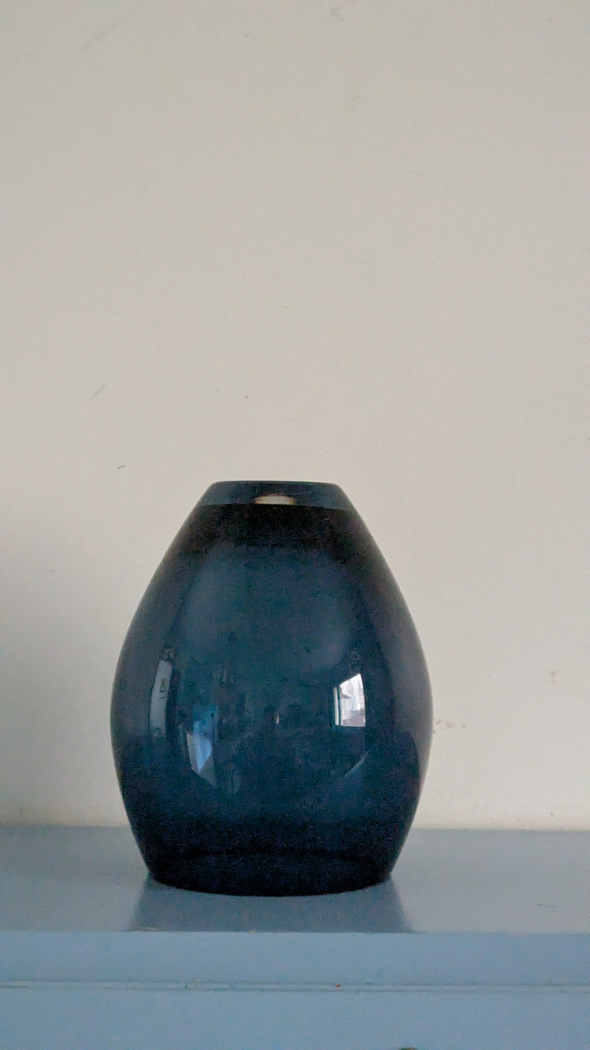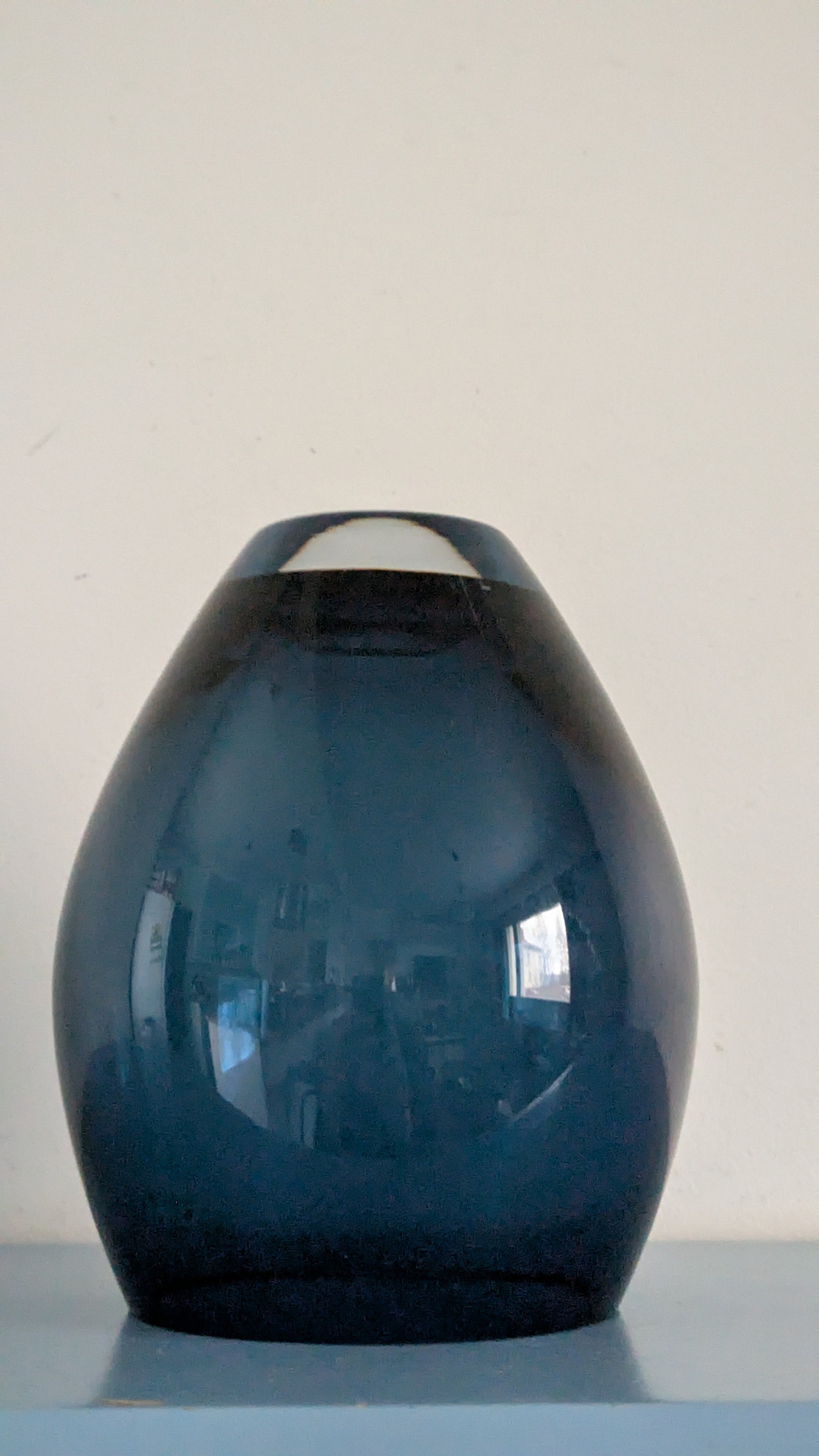 Pohjassa Pentikin leima. Ei iskemiä tai halkeamia. Yhdellä puolen hiusnaarmuja, joita ei saanut kuvaa. Maljakon alaosan lasimassaan jäänyt noin 1mm kokoinen ilmakupla, mikä näkyy viimeisessä kuvassa.