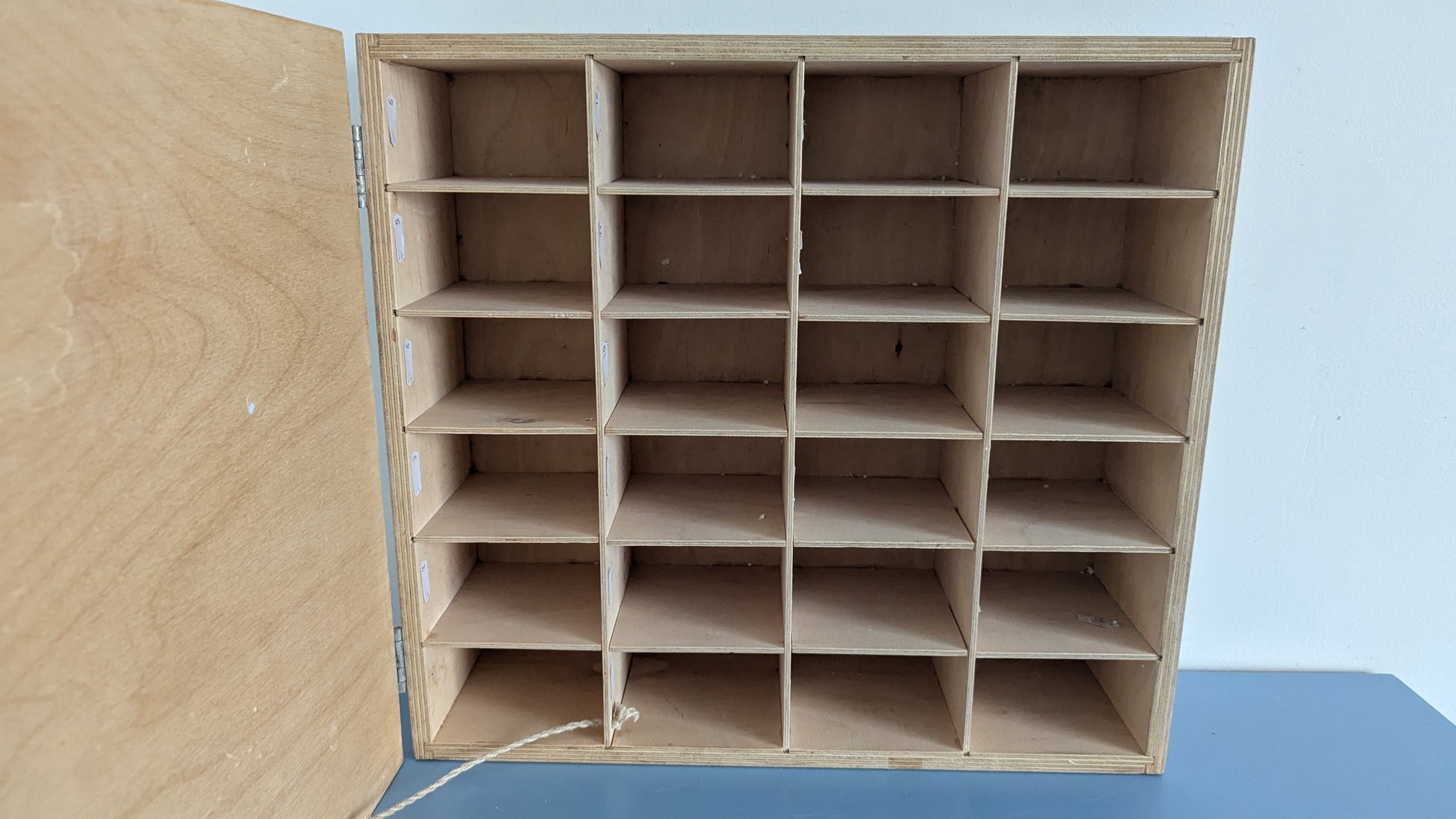 28 lokeroa sisältävä kaappi. Lokerikot noin 10cm leveitä, 6cm korkeita ja 12cm syviä. Jostain syystä kaikki lokerikot numeroitu tarroilla.