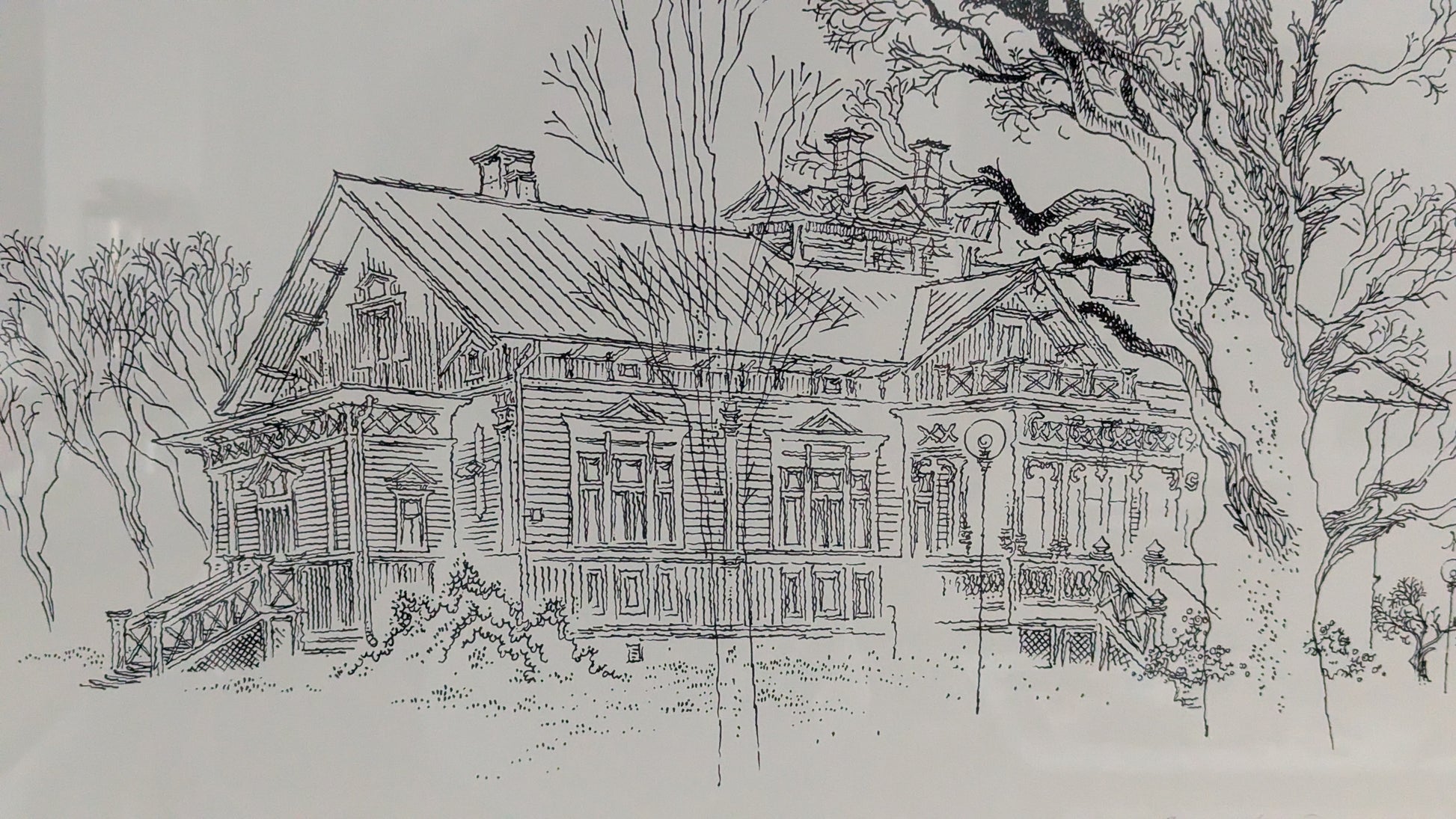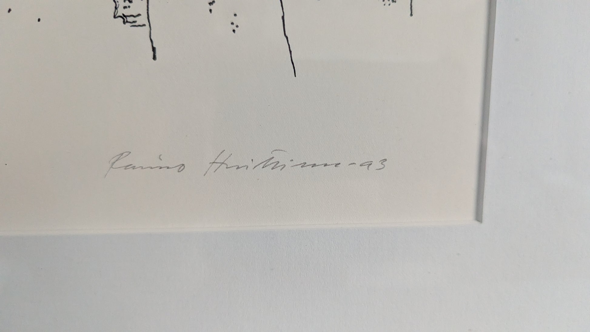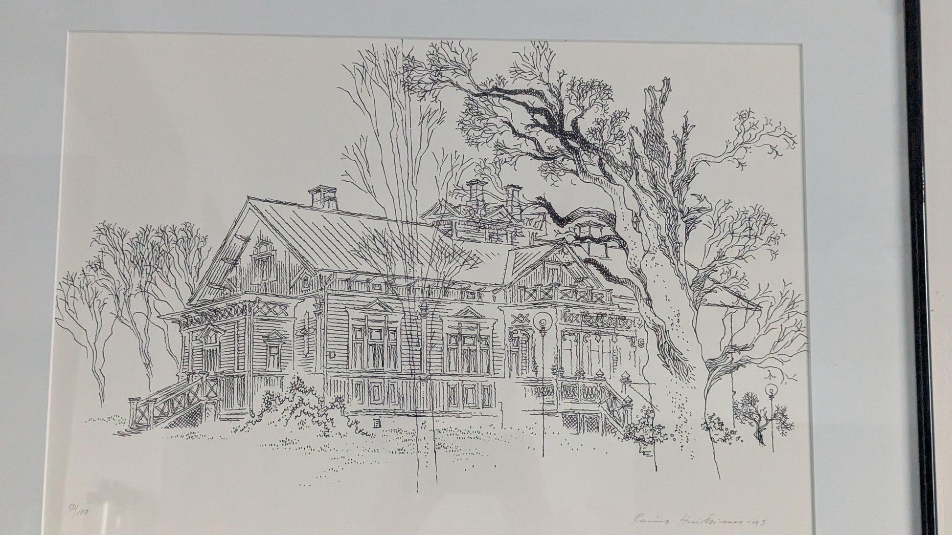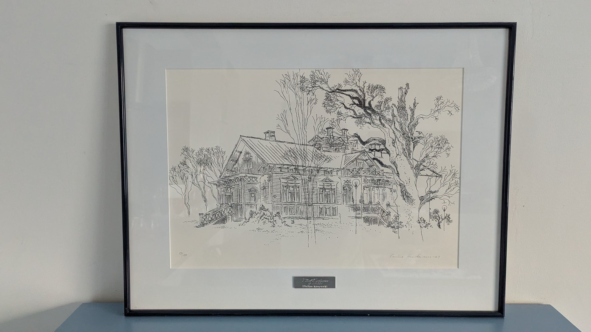 Raimo Huittisen signeeraama ja numeroima grafiikka vuodelta 1993. Aiheena Ulvilan kirkkoherranpappila Gammelgård.