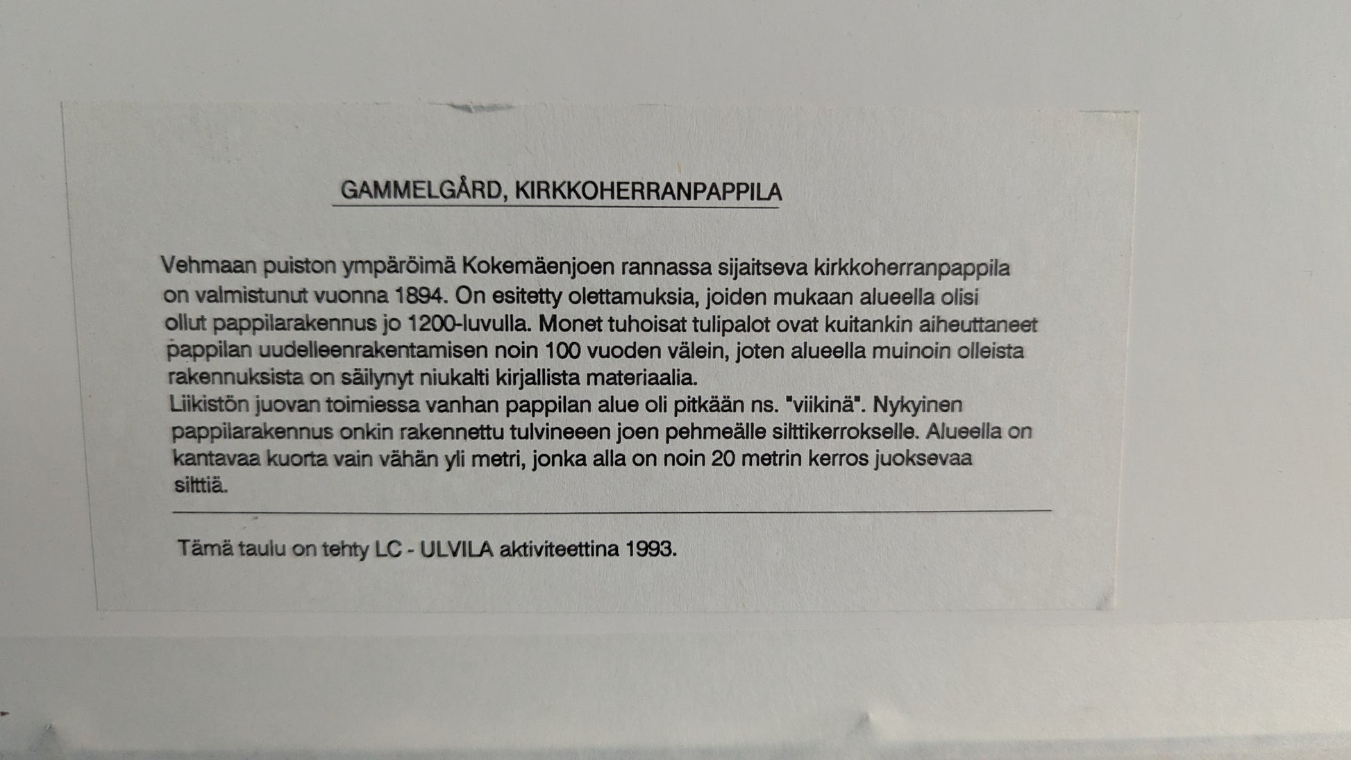 Kehyksissä lasi. Teoksen alle lasiin liimattu kaiverrettu metallilätkä. Teoksen takana pappilan historiaa. Teoksen tilaajana ollut Ulvilan Lions Club.