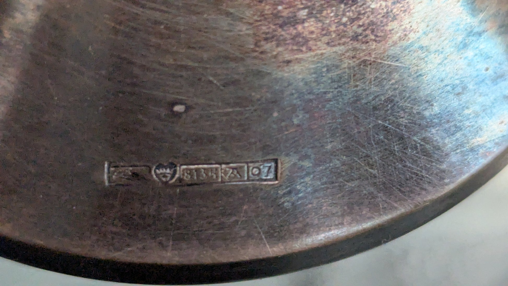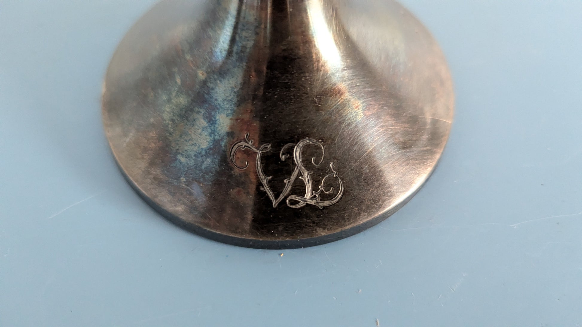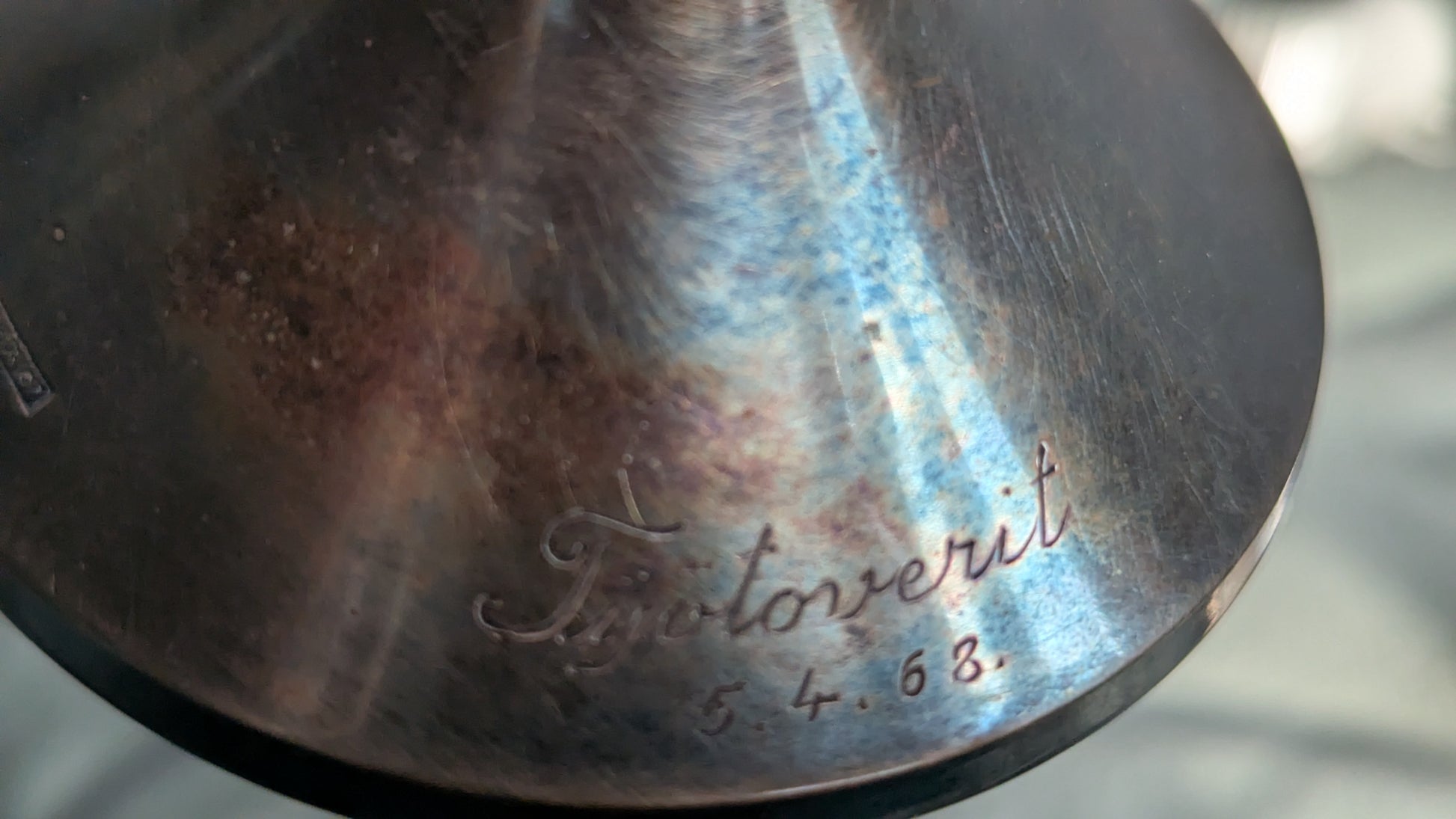 Ei iskemiä, halkeamia tai naarmuja. Hopeajalassa tummumaa. Jalassa kaiverrus VL Työtoverit 5.4.68.