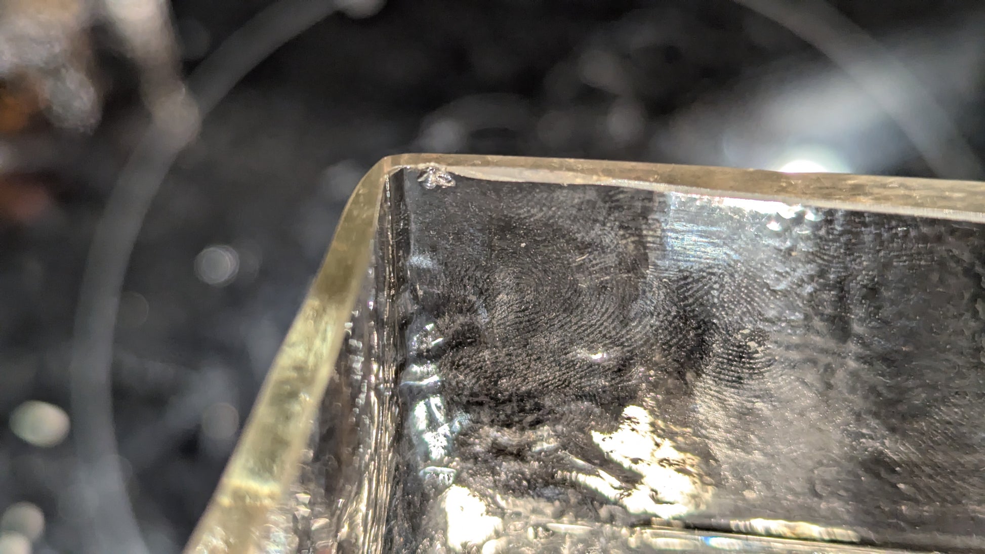 Ei halkeamia. Pohjassa vähäistä naarmuja siirtelystä. Yhdessä nurkassa noin 1mm iskemä, mikä näkyy viimeisessä kuvassa.