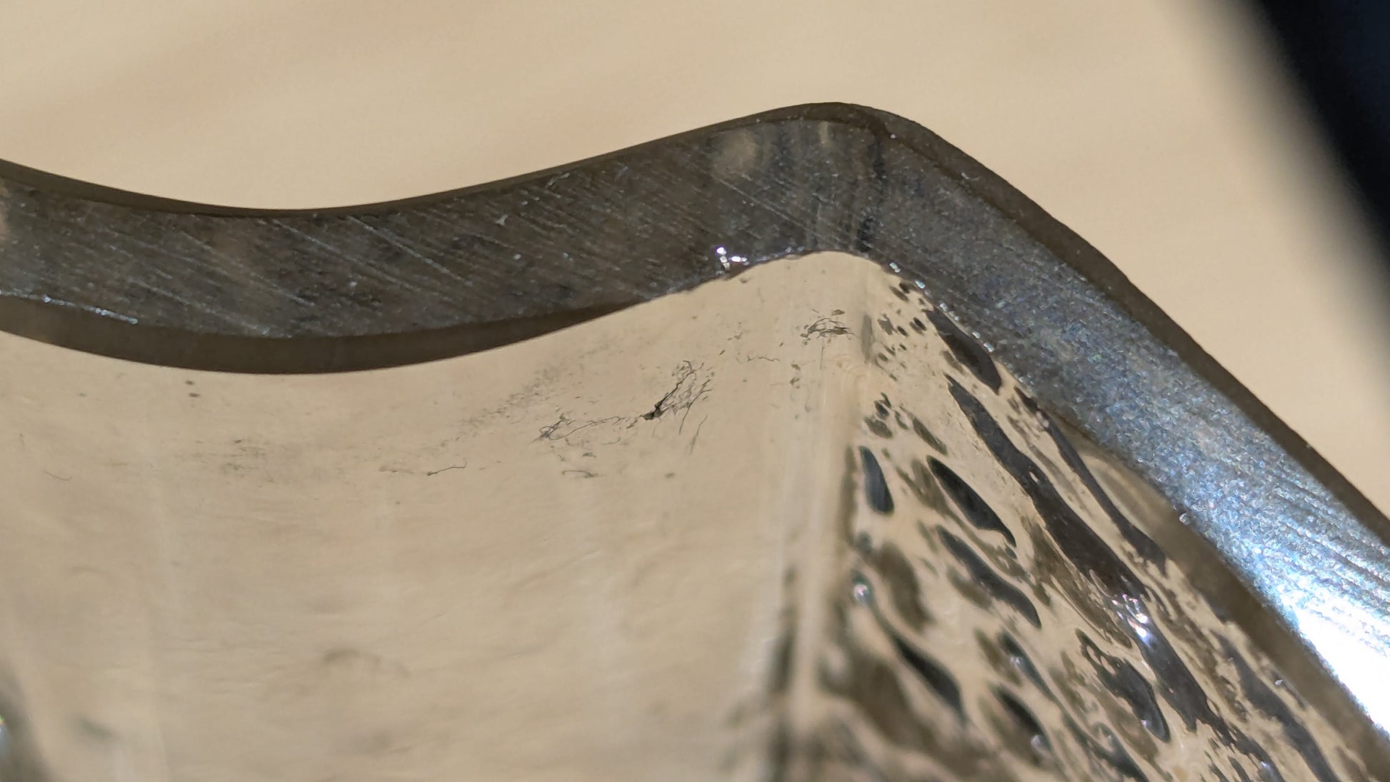 Ei halkeamia. Pohjassa siirtelystä tullutta naarmua. Suuaukon sisäreunassa yksi alle pienen pieni kynnellä tuntuva iskemä joka kooltaan noin puolimilliä.