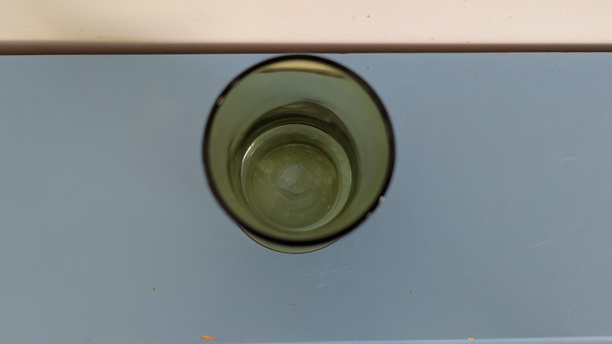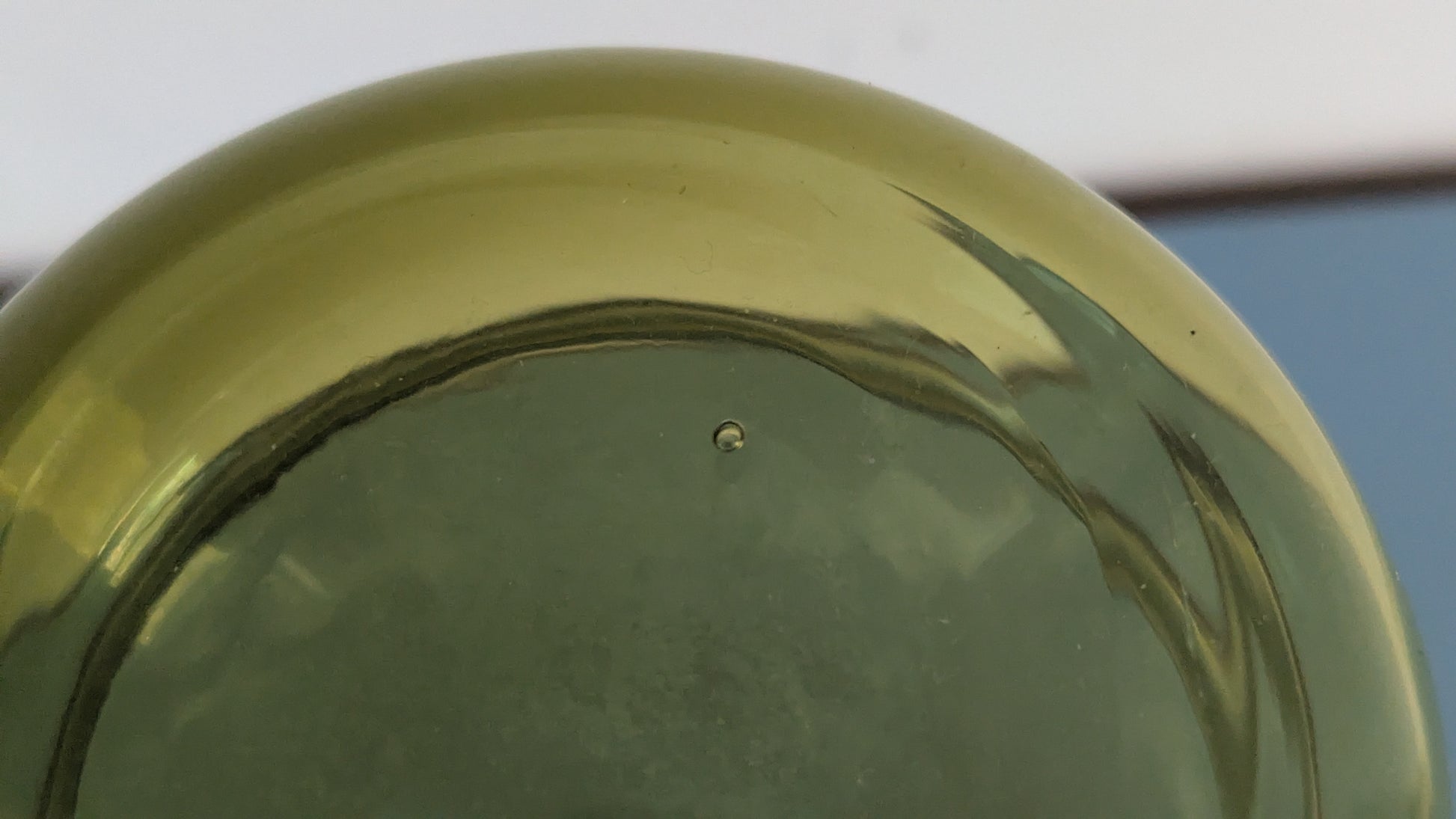 Ei iskemiä tai halkeamia. Pohjassa pientä naarmua siirtelystä. Pohjaan jäänyt myös yksi pieni ilmakupla, mikä näkyy viimeisessä kuvassa.