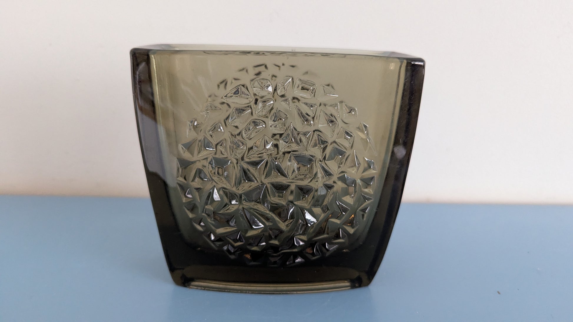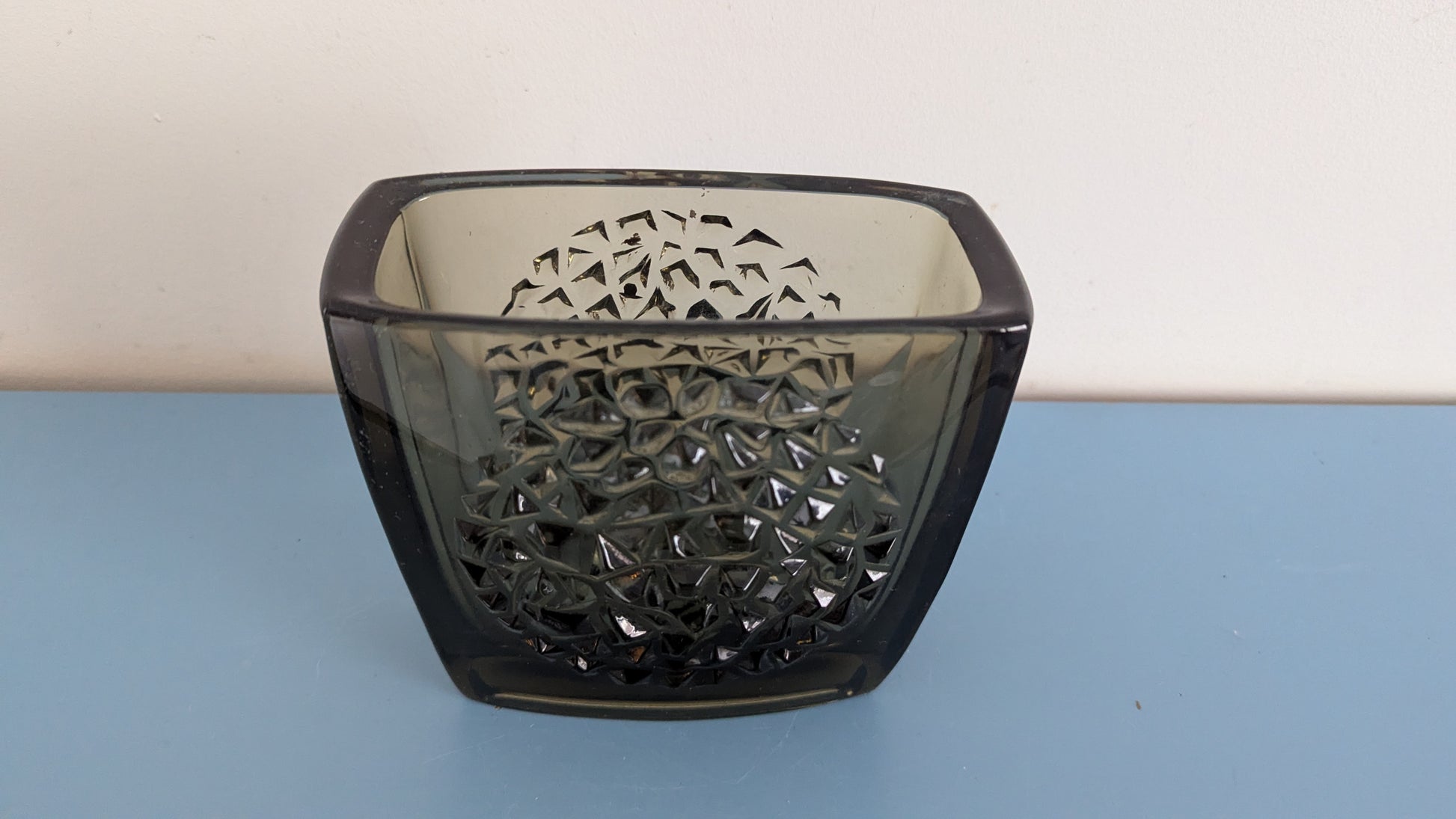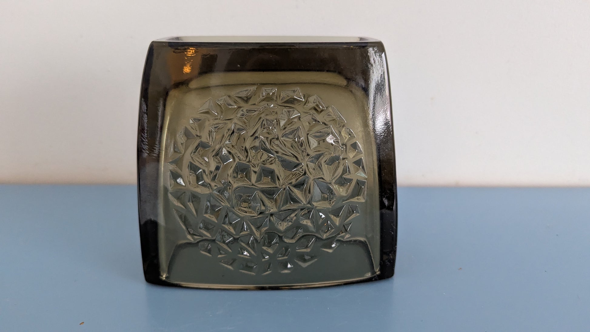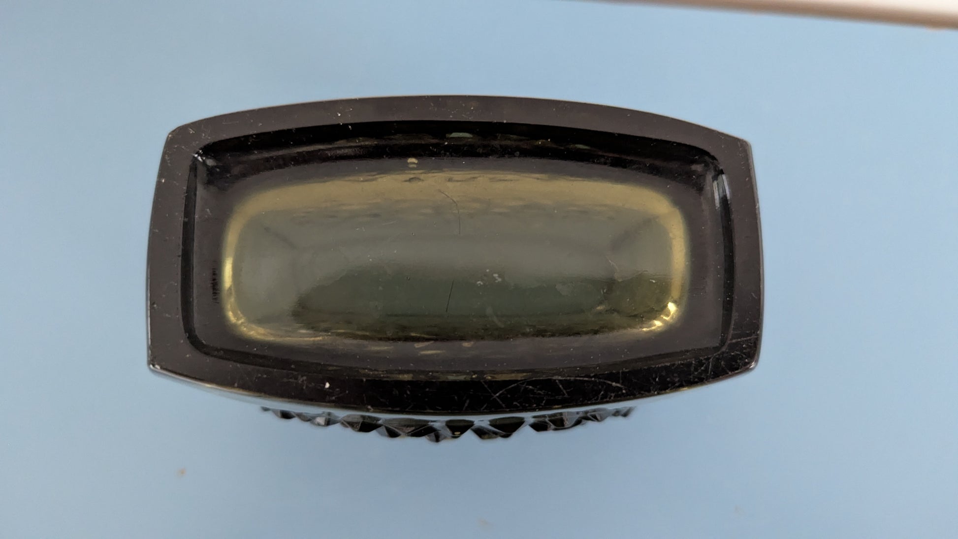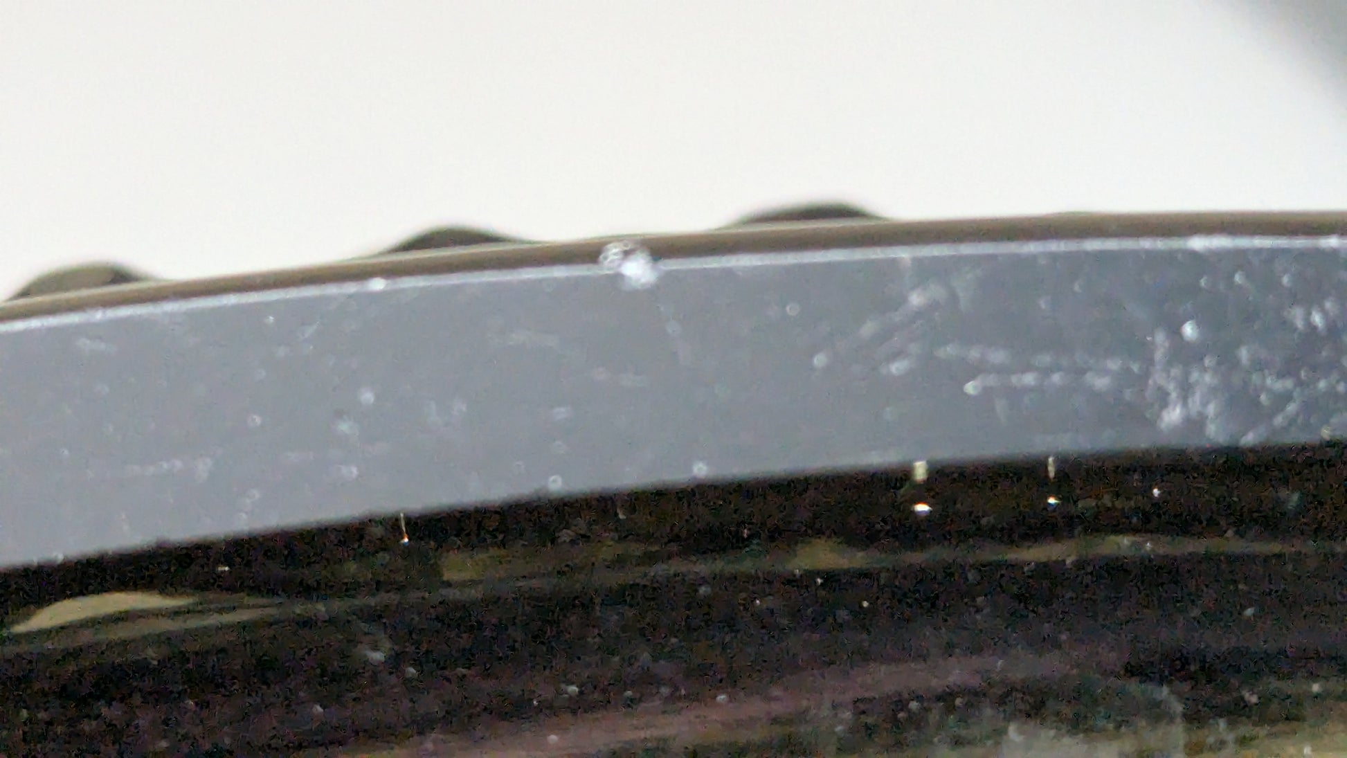 Ei halkeamia. Pohjaympyrässä naarmuja ja pieni kynnellä tuntuva iskemä. Näkyy viimeisessä kuvassa. Kuva otettu zoomilla. Näkyy juuri ja juuri paljaalla silmällä kun peilaa valossa.