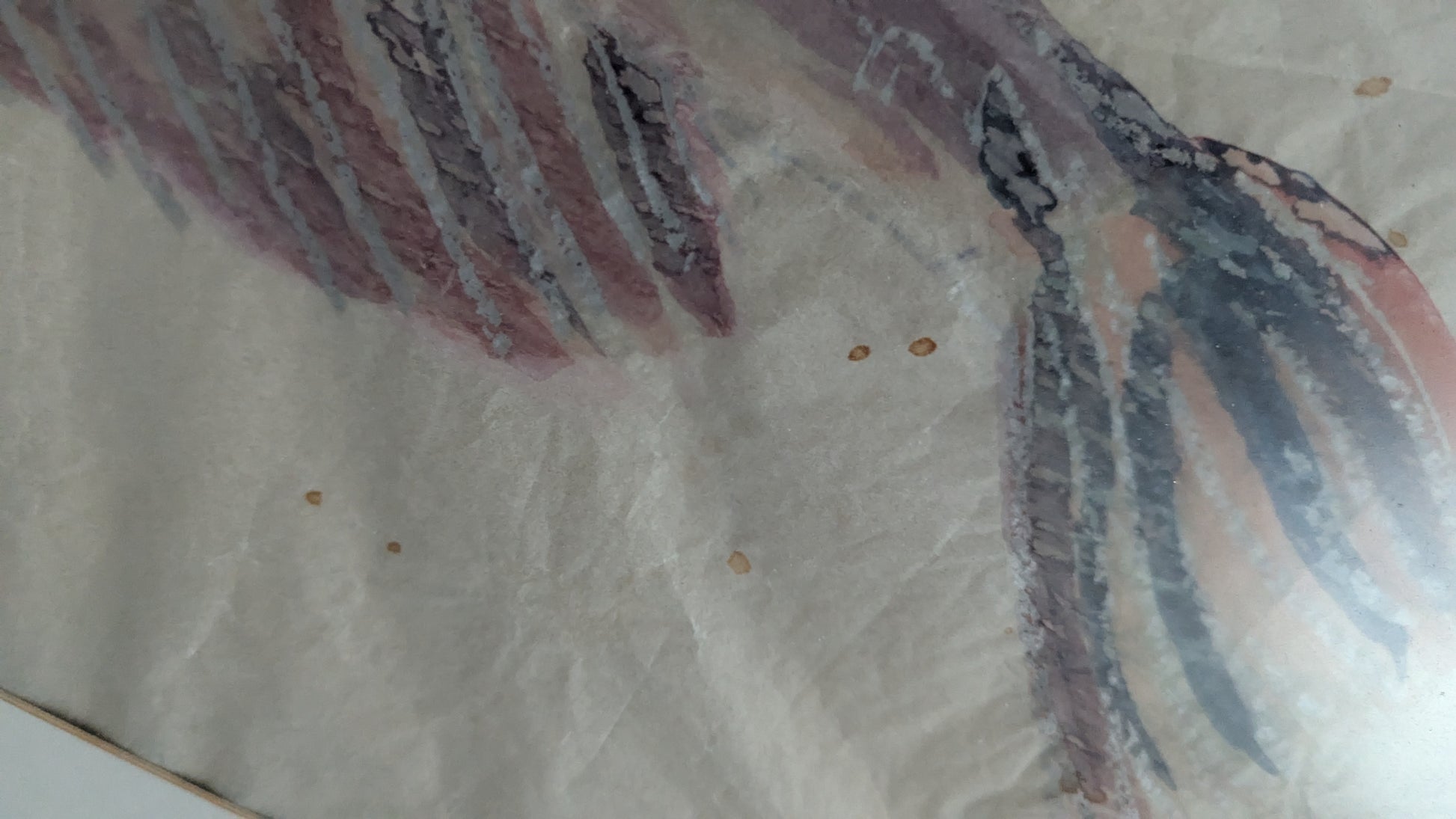 Kehyksissä lasi. Maalattu voipaperimaiselle paperille, joka todennäköisestä tahallaan rypistelty jotta kuvasta saadaan elävämpi. Teoksessa noin 15cm repeämä mikä teipattu taustapuolelta. Ajan myötä teippauksen liima tullut työstä läpi, mikä näkyy viimeisessä kuvassa.