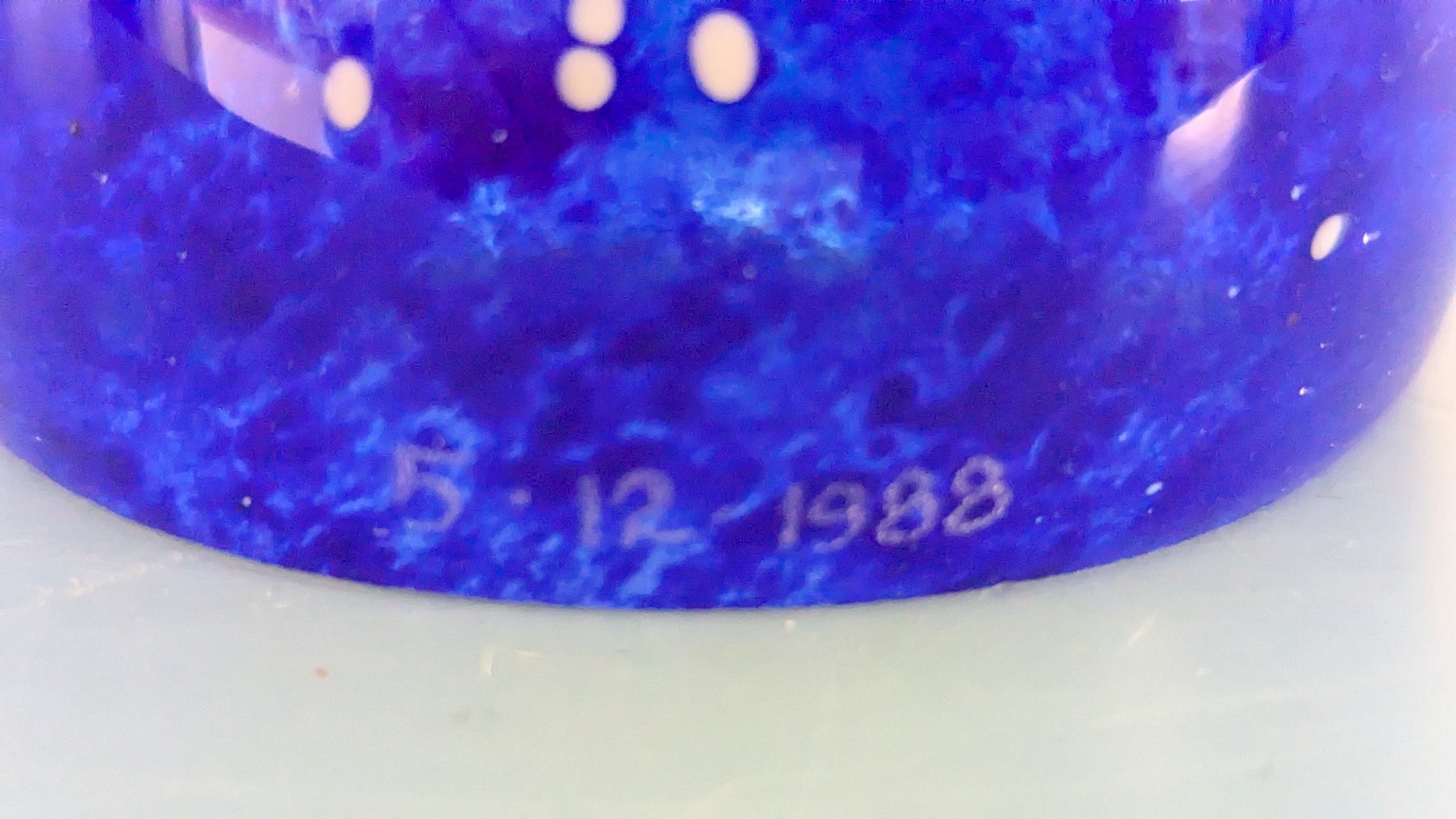 Ei iskemiä, halkeamia tai naarmuja mutta alaosassa kaiverrus 5.12.1988.