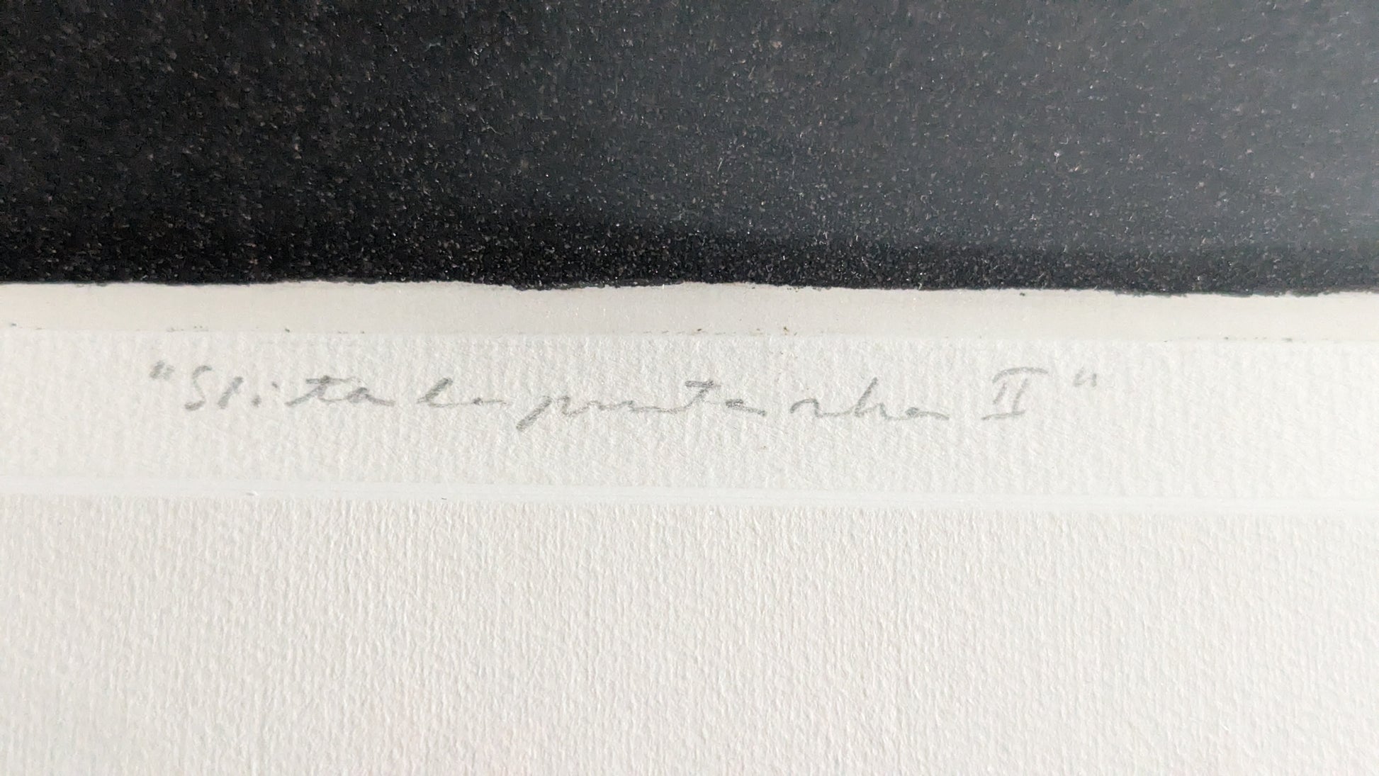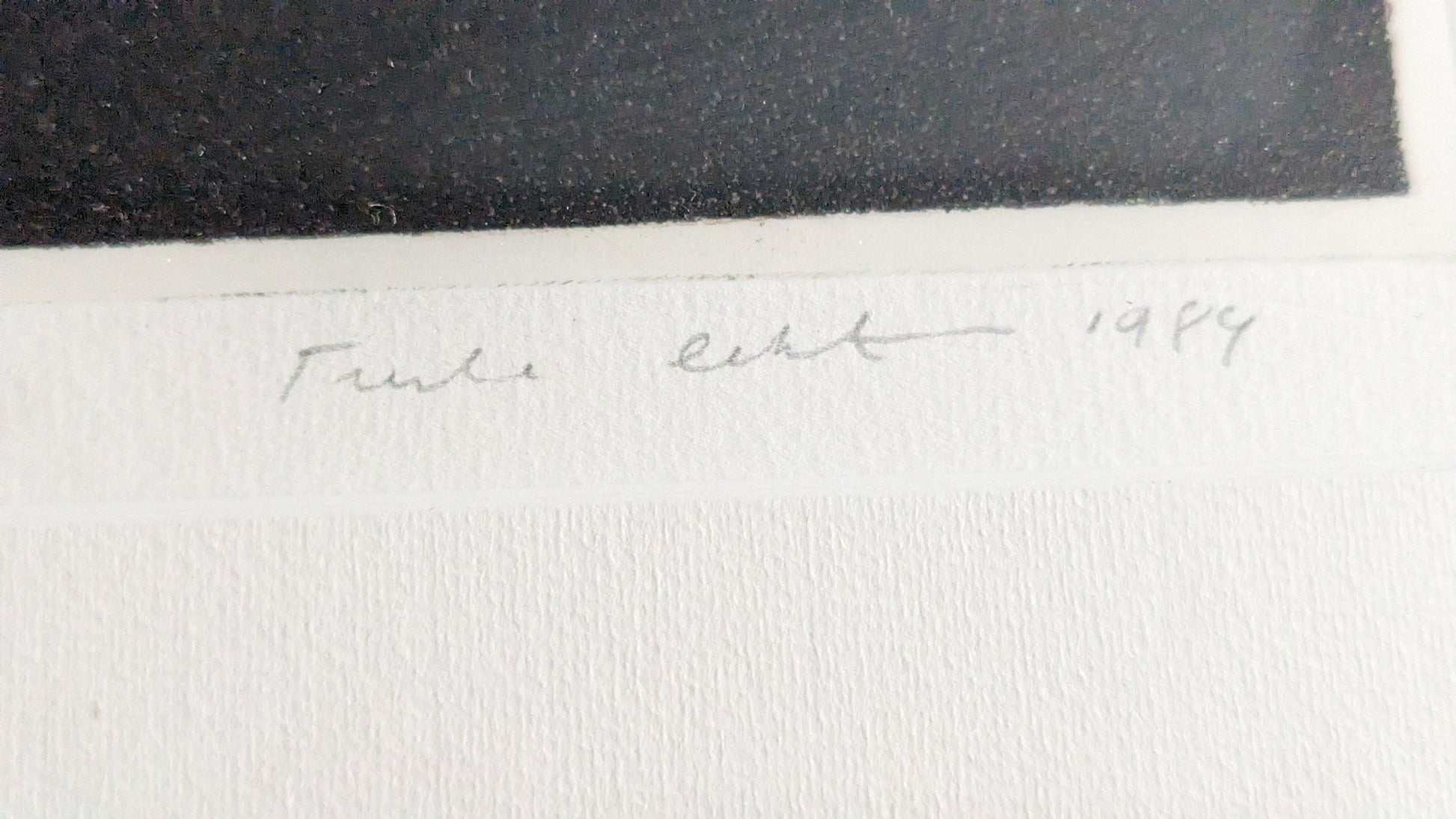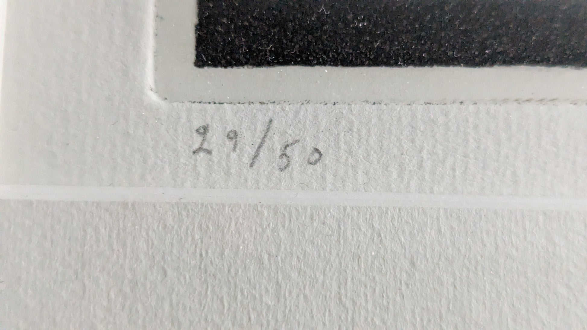 Teoksen alla numerointi 29/50, teoksen nimi, taiteilijan signeeraus ja vuosiluku 1984.