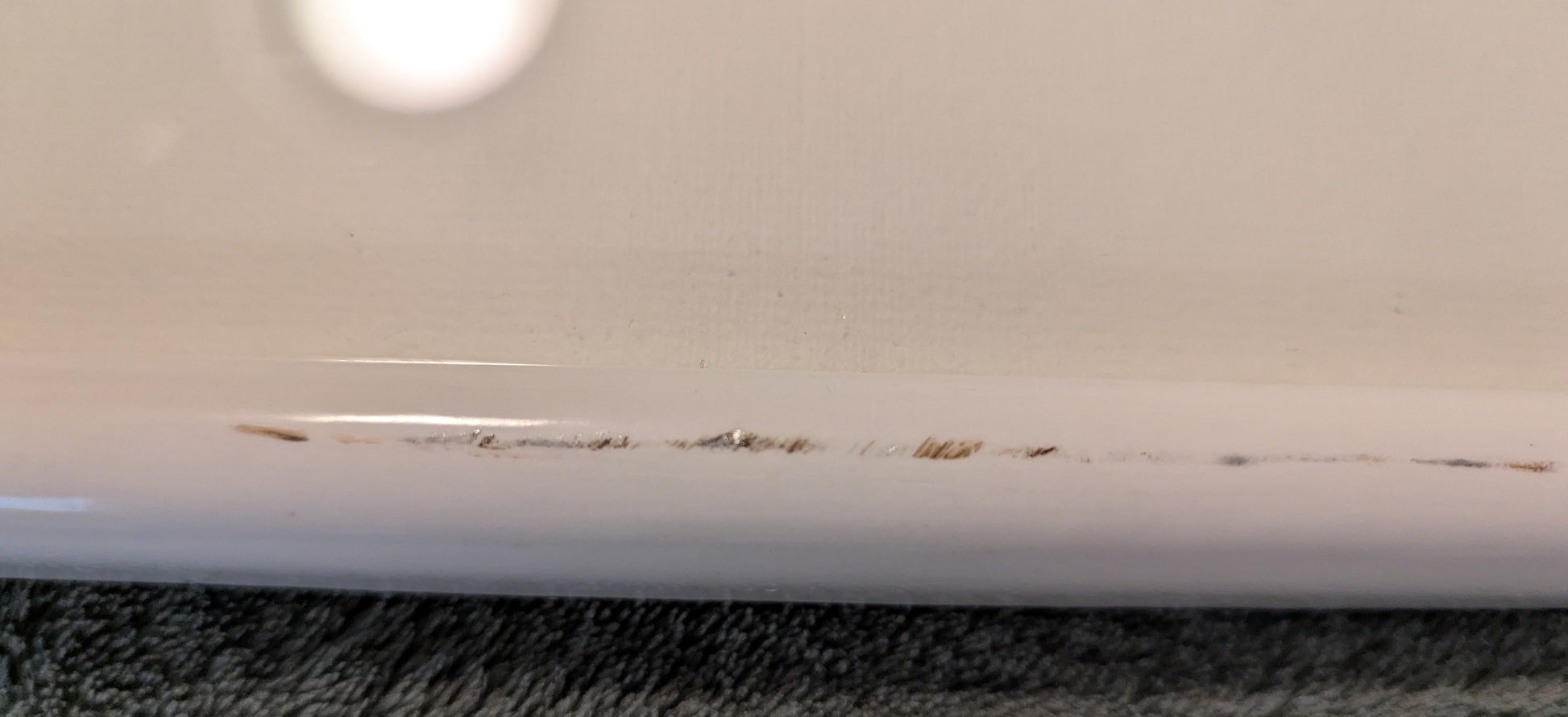 Kehyksissä lasi. Kehyksen alaosassa naarmua, mikä näkyy viimeisessä kuvassa.
