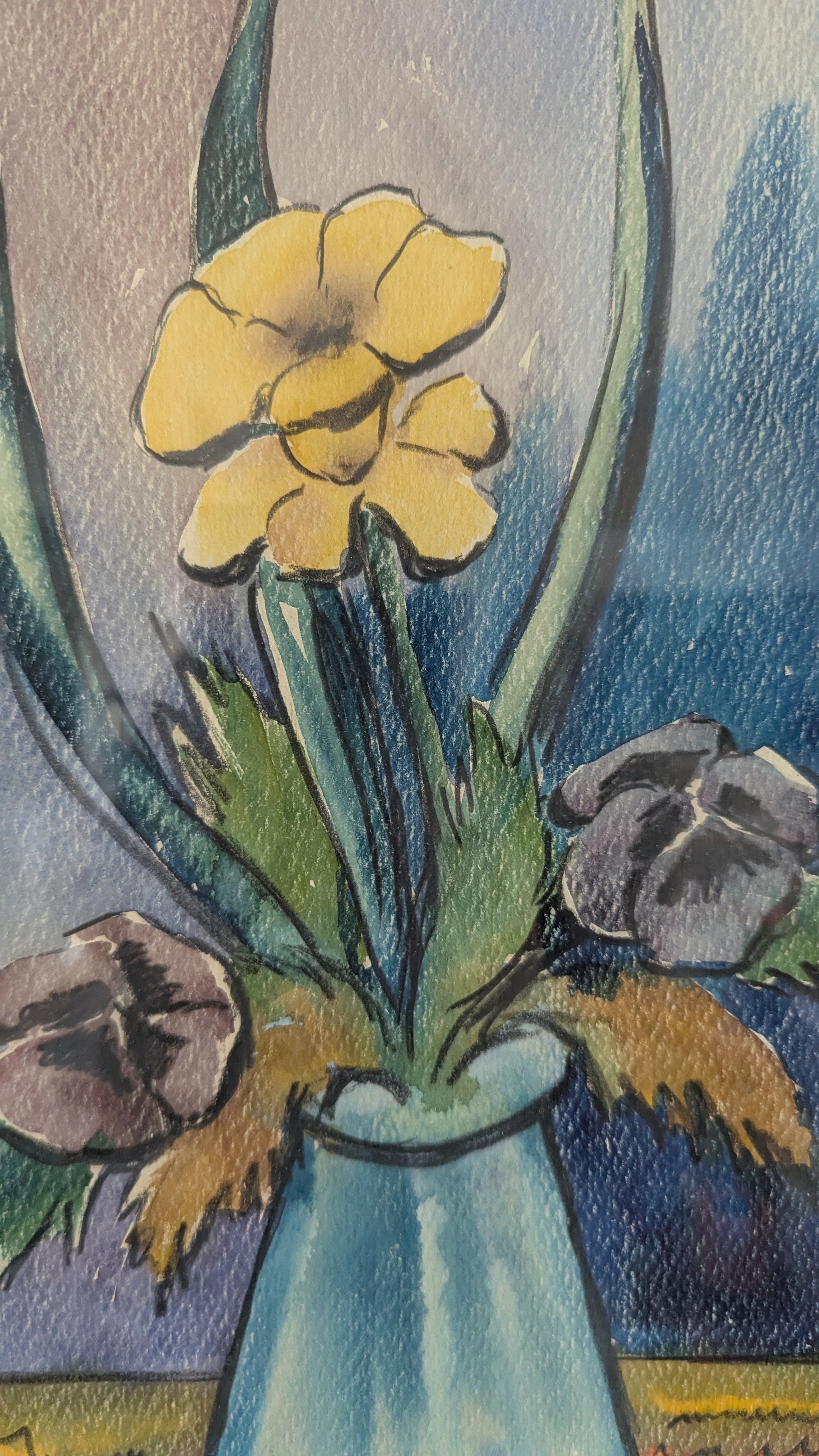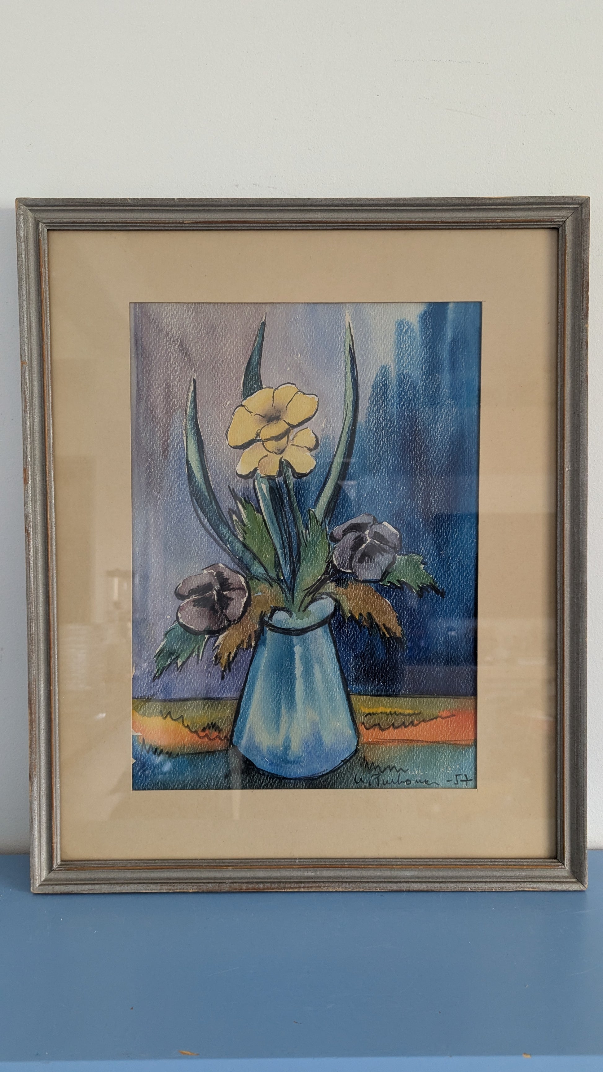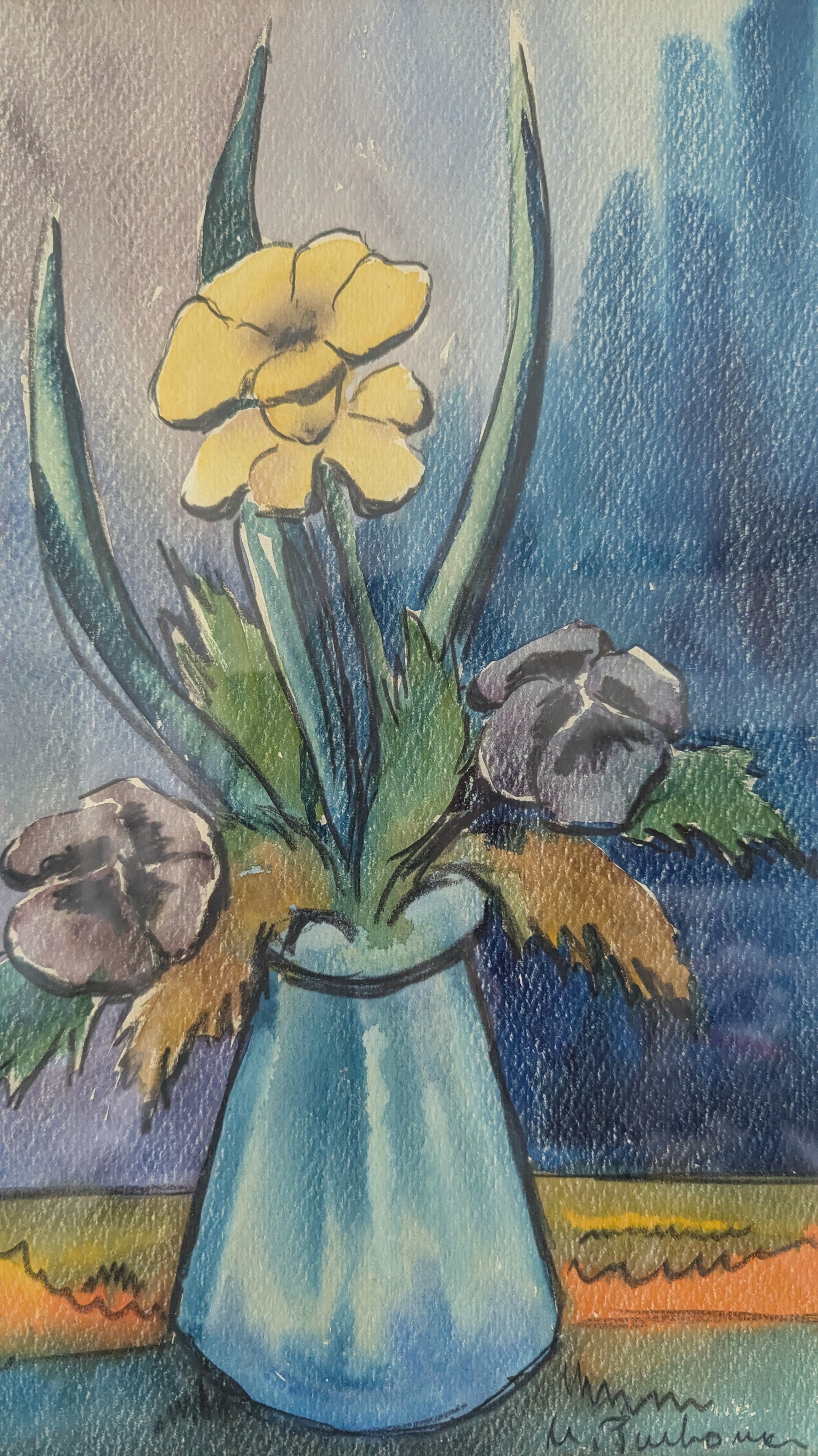 Urpo Purhosen signeeraama sekatekniikkatyö (vesiväri/pastelli) vuodelta 1957.