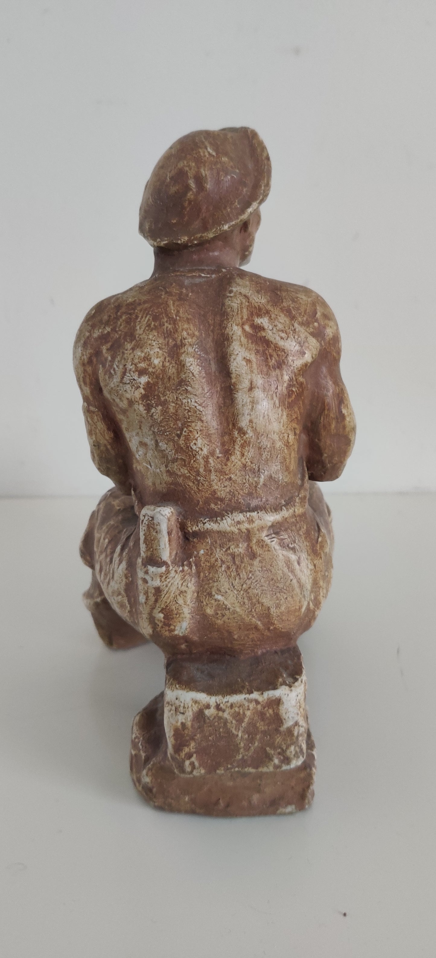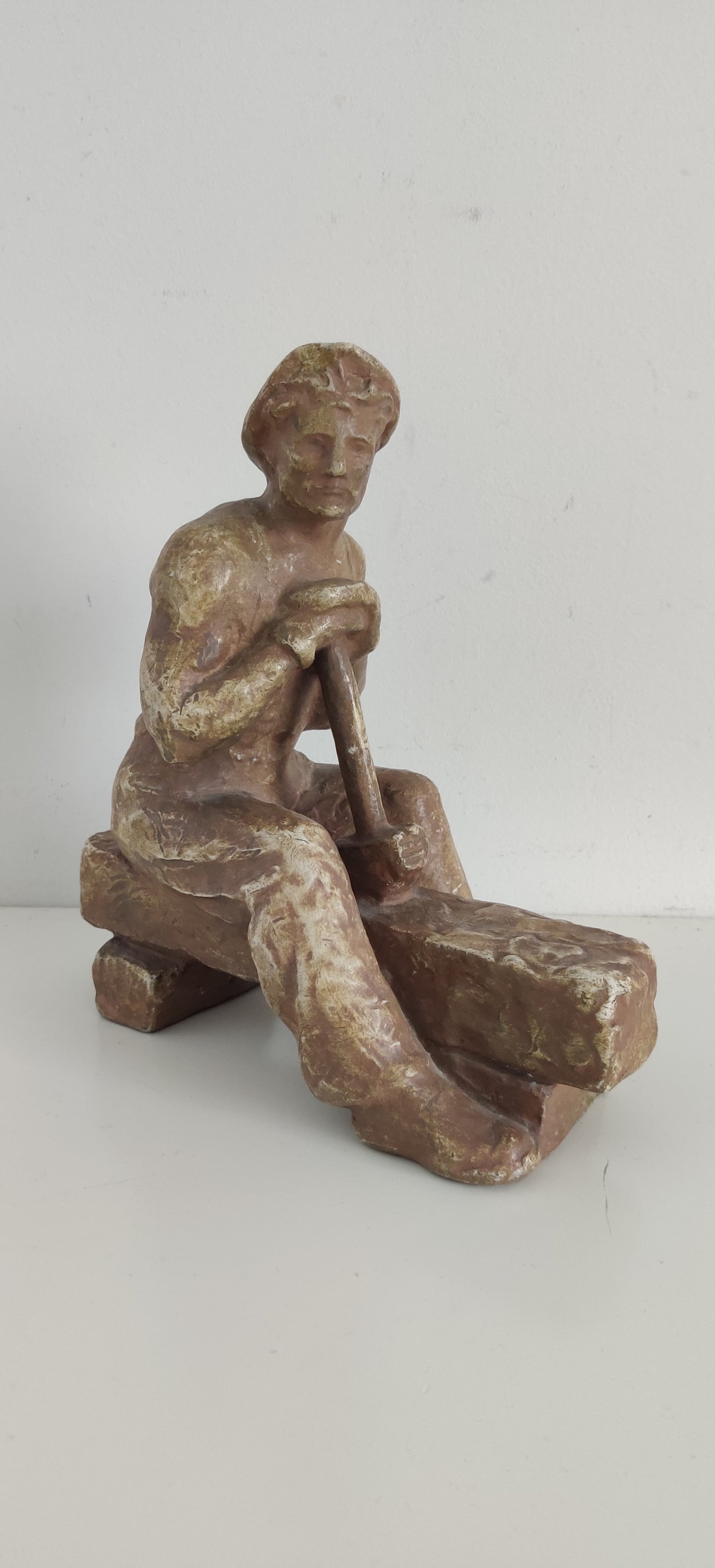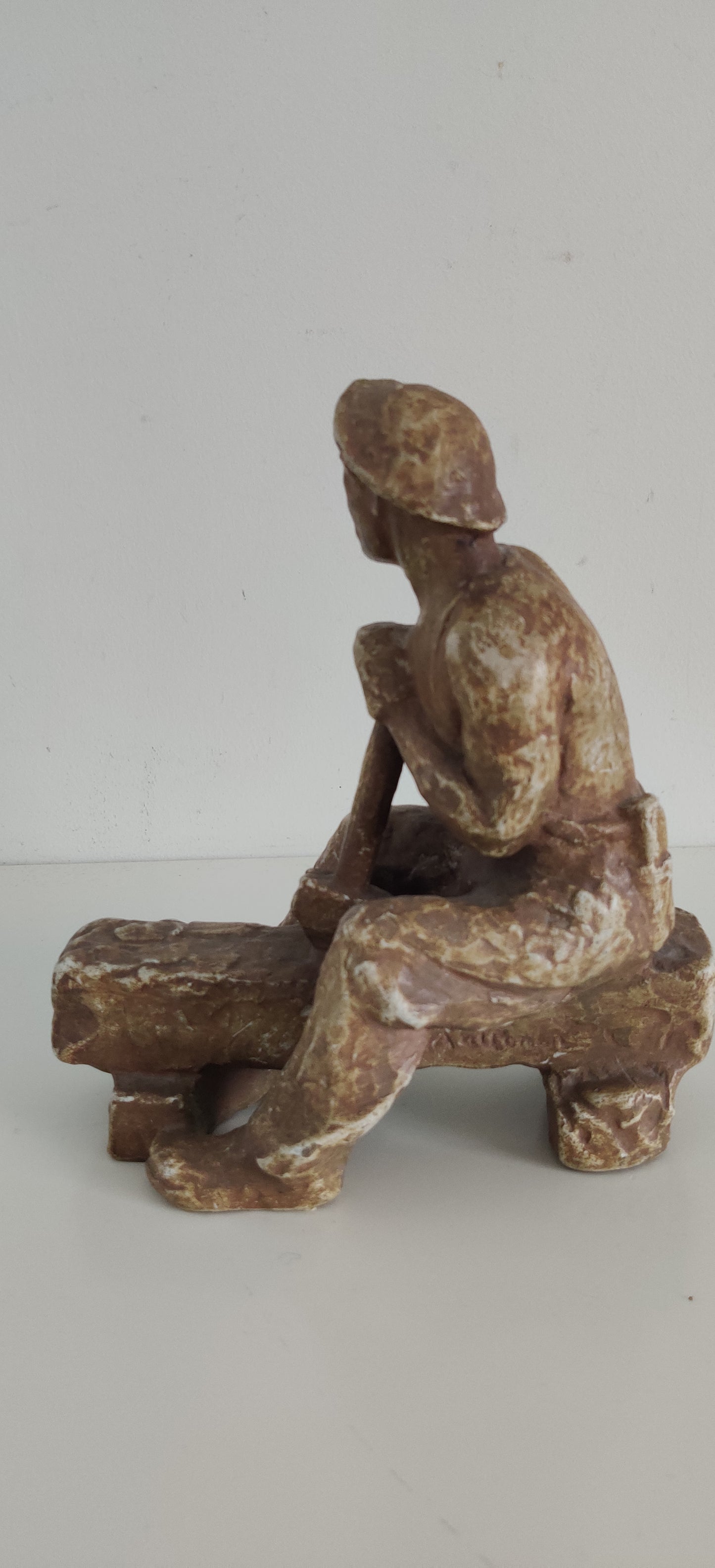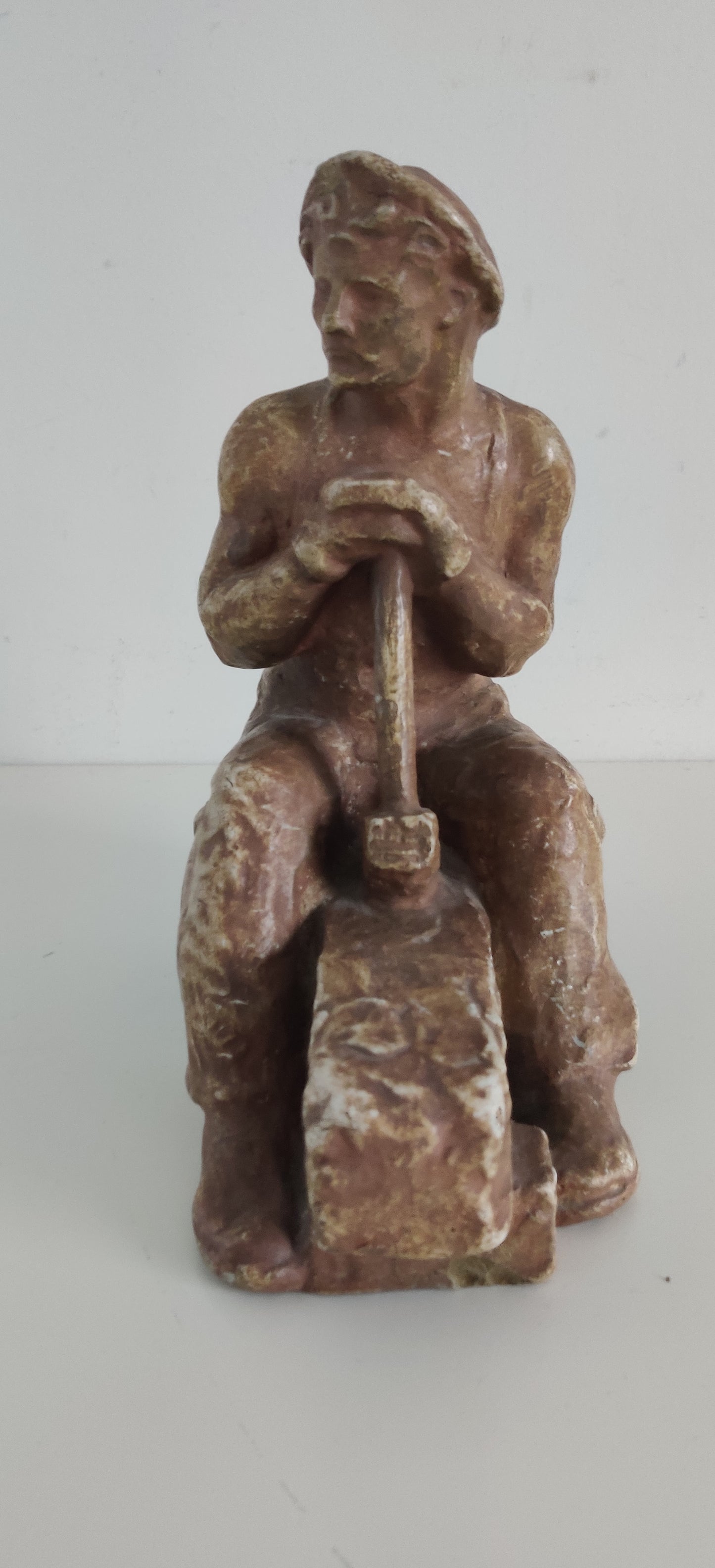 Patsas esittää miestä jolla kädessä paksut hanskat ja joka istuu palkin päällä lekaan nojaten. Onko kyseessä sitten kivenhakkaaja.