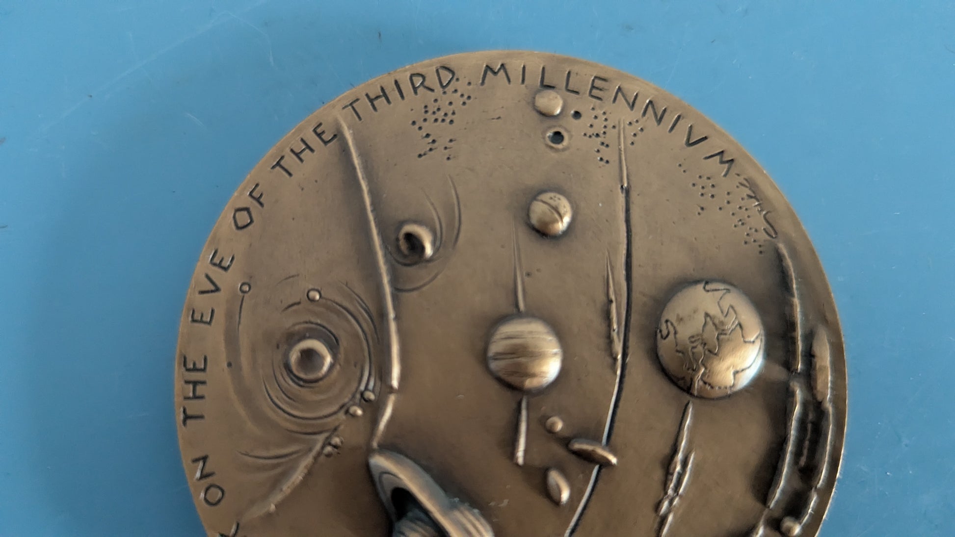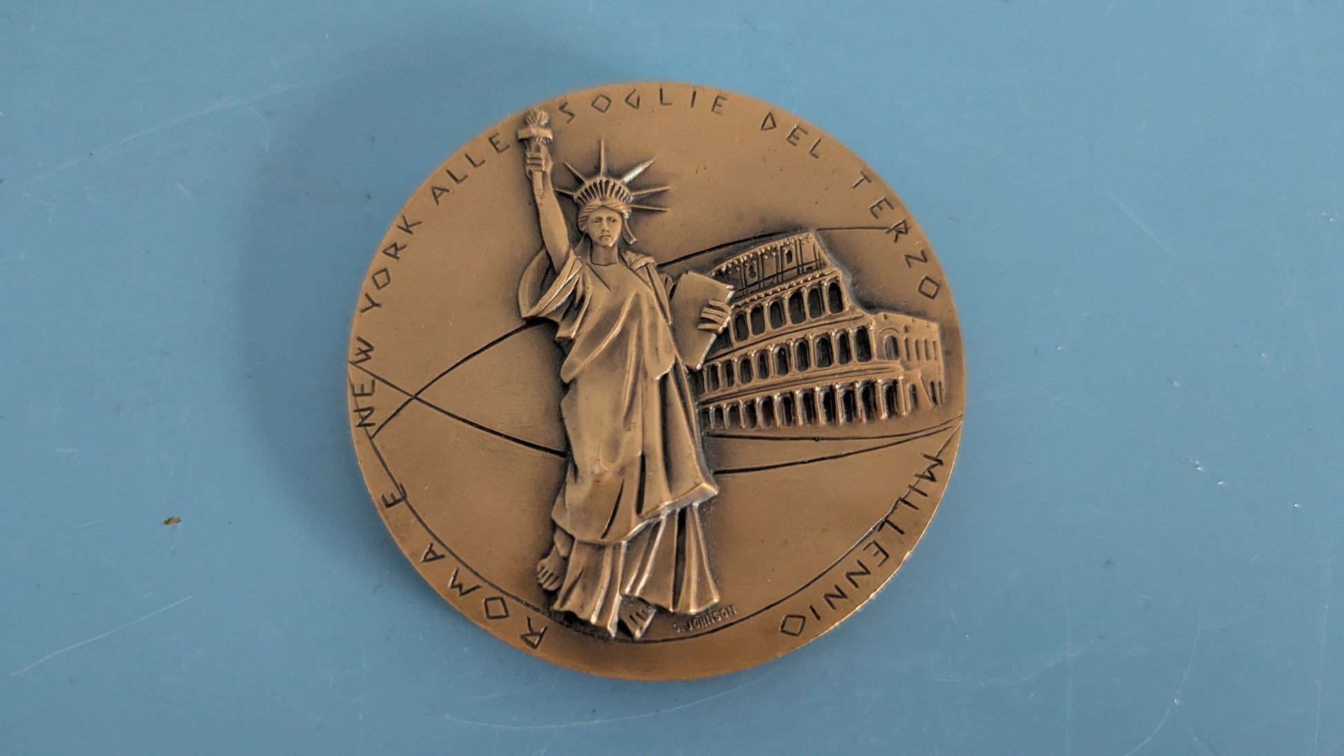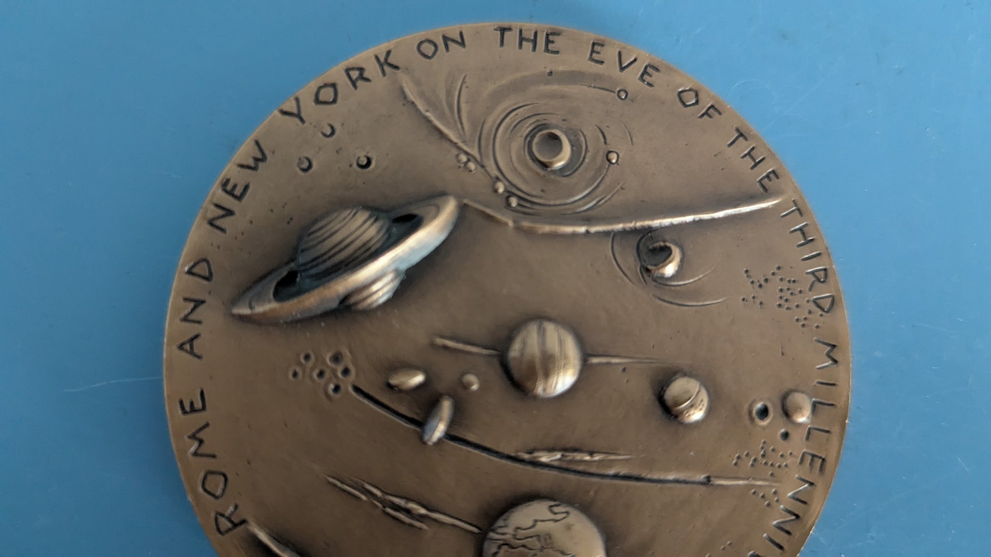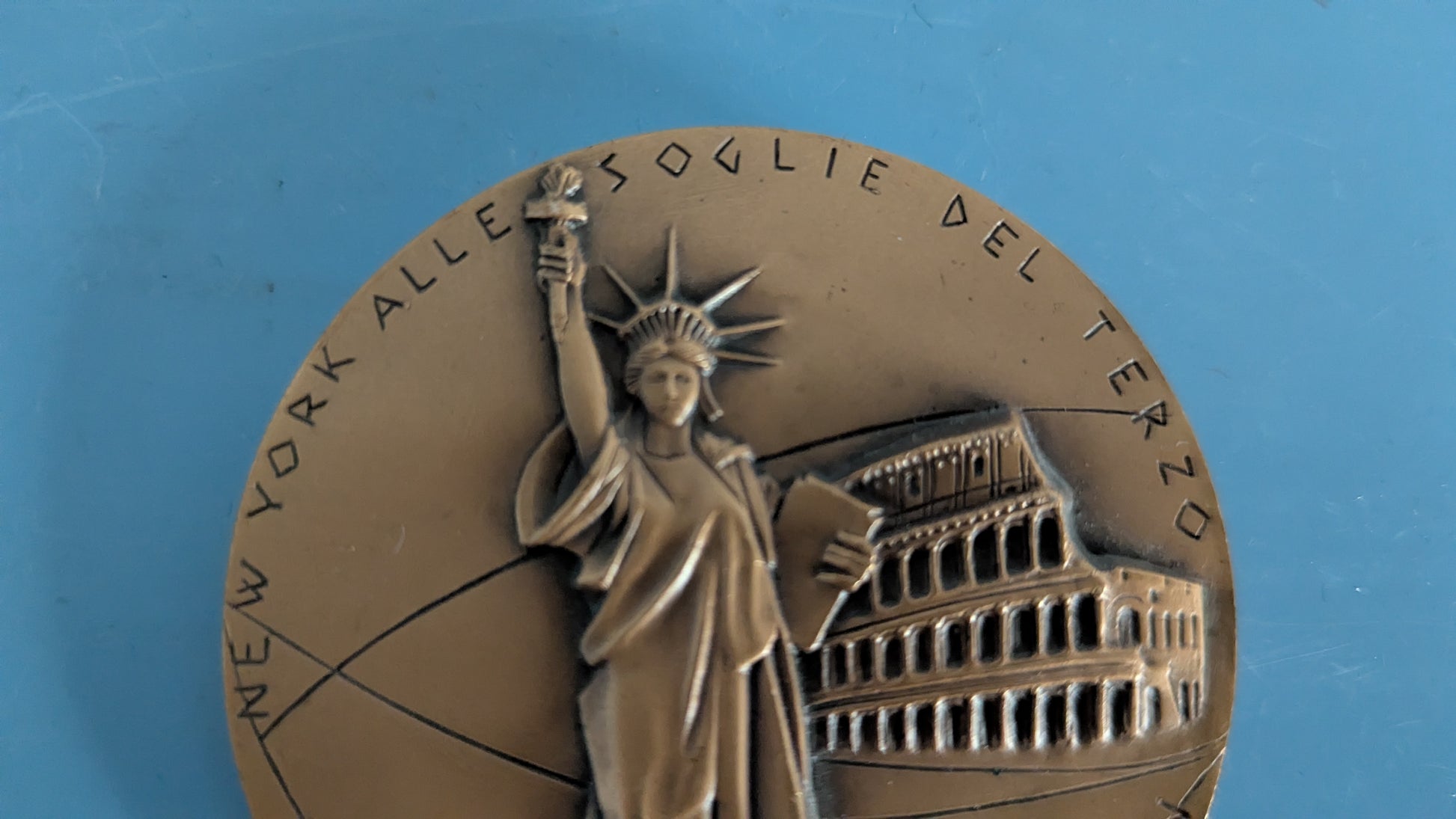 Etupuolella teksti "Roma e New York alle soglie del terzo millennio" ja S.Johnson, kuvassa vapaudenpatsas ja Colosseum. Toisella puolen teksti "Rome and New York on the eve of the third millennium" sekä Angelo Grillin signeeraus. Kuvassa avaruus.