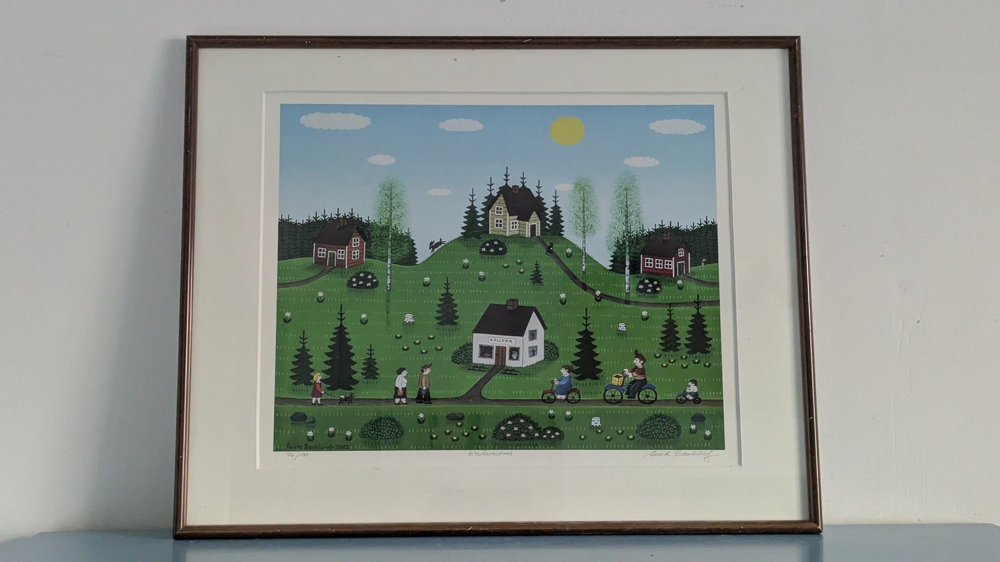Anita Backlund signeeraama Kyläkauppa niminen grafiikka vuodelta 2009.